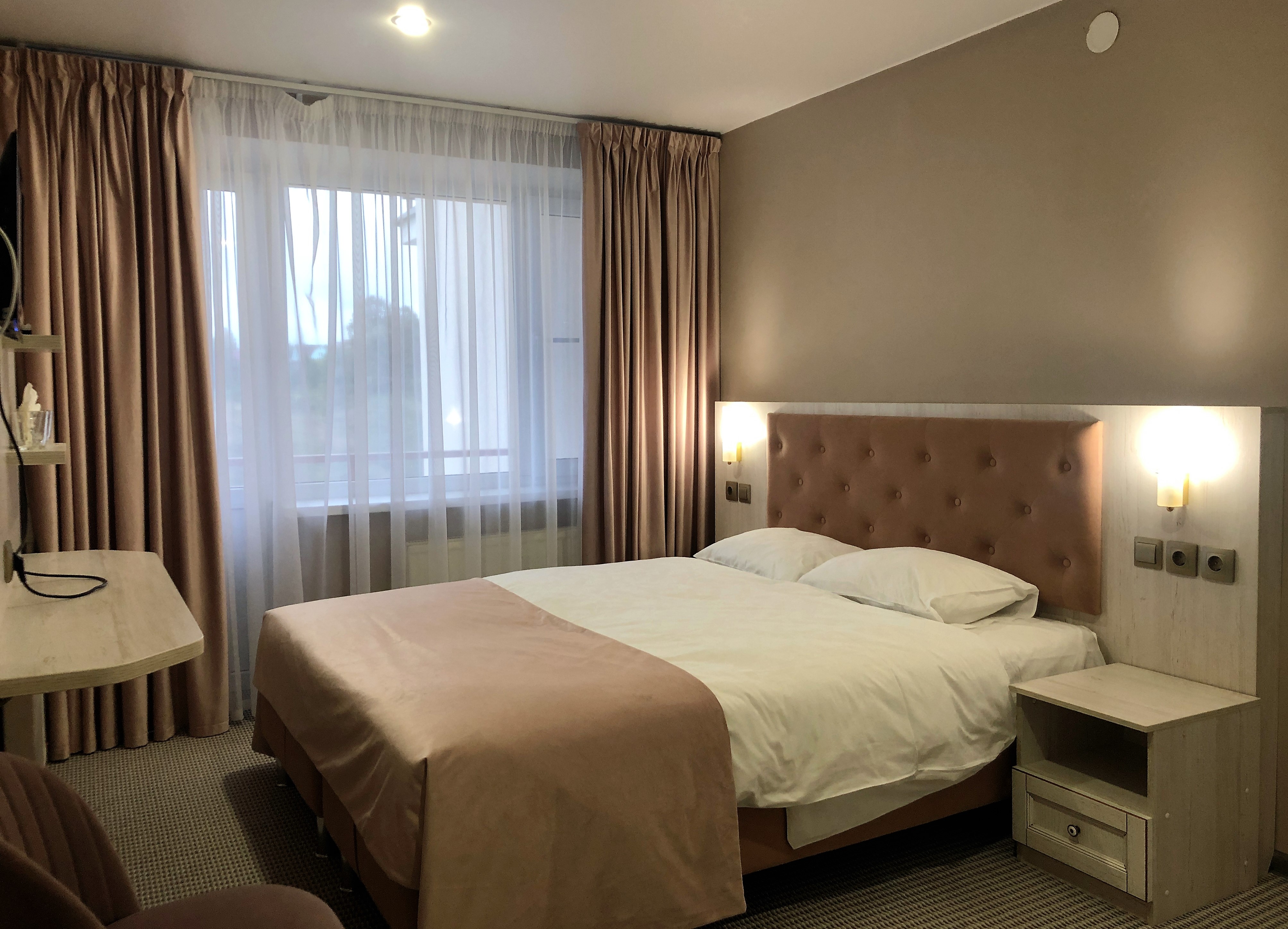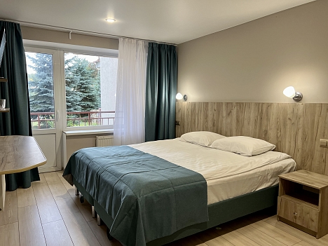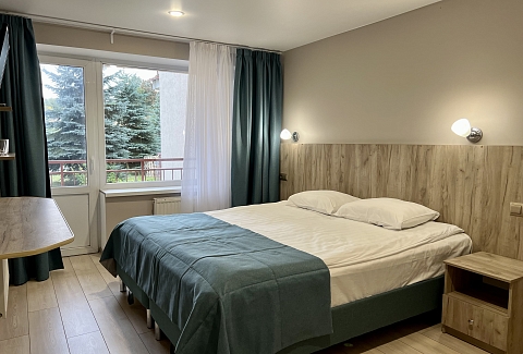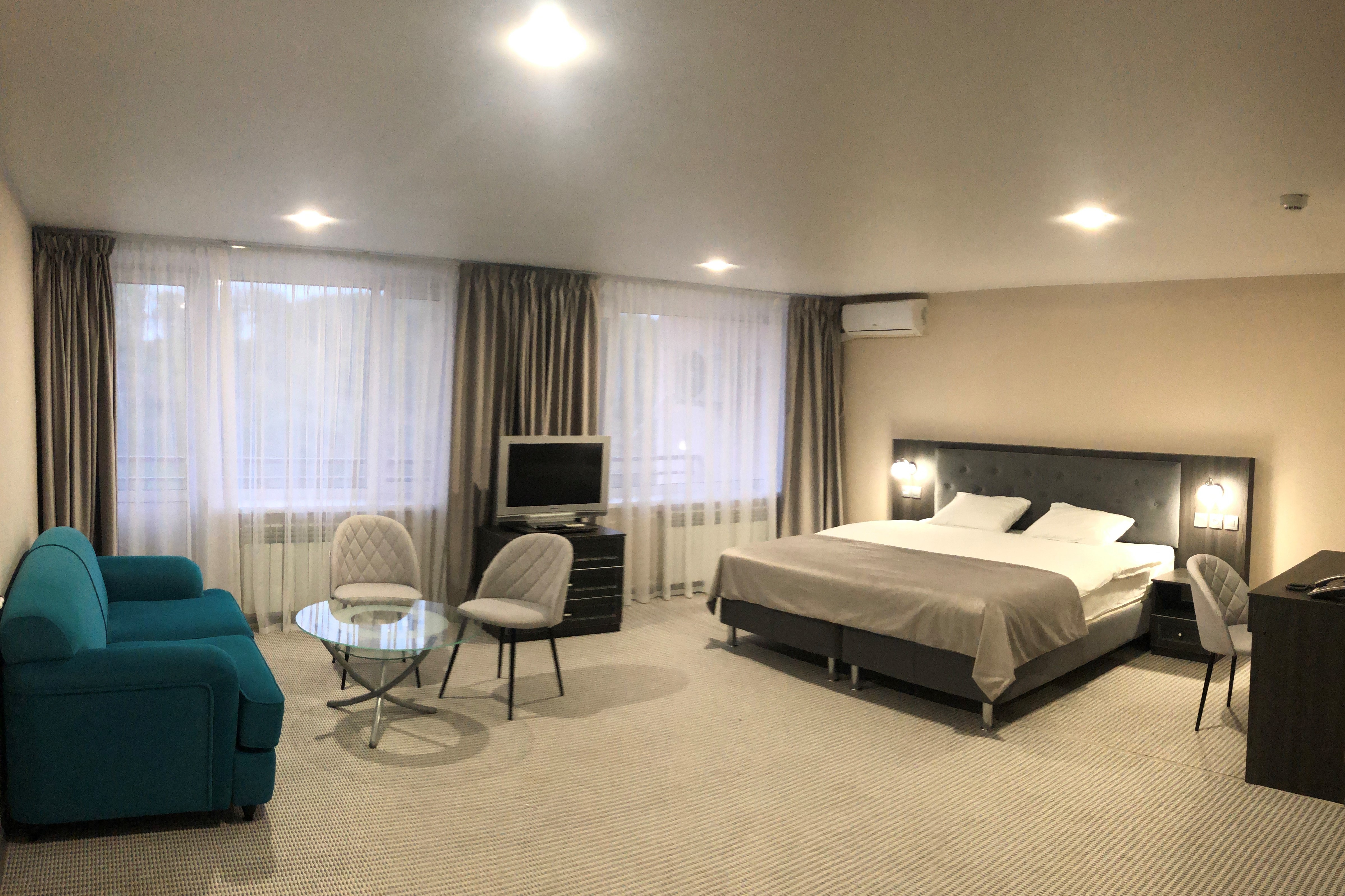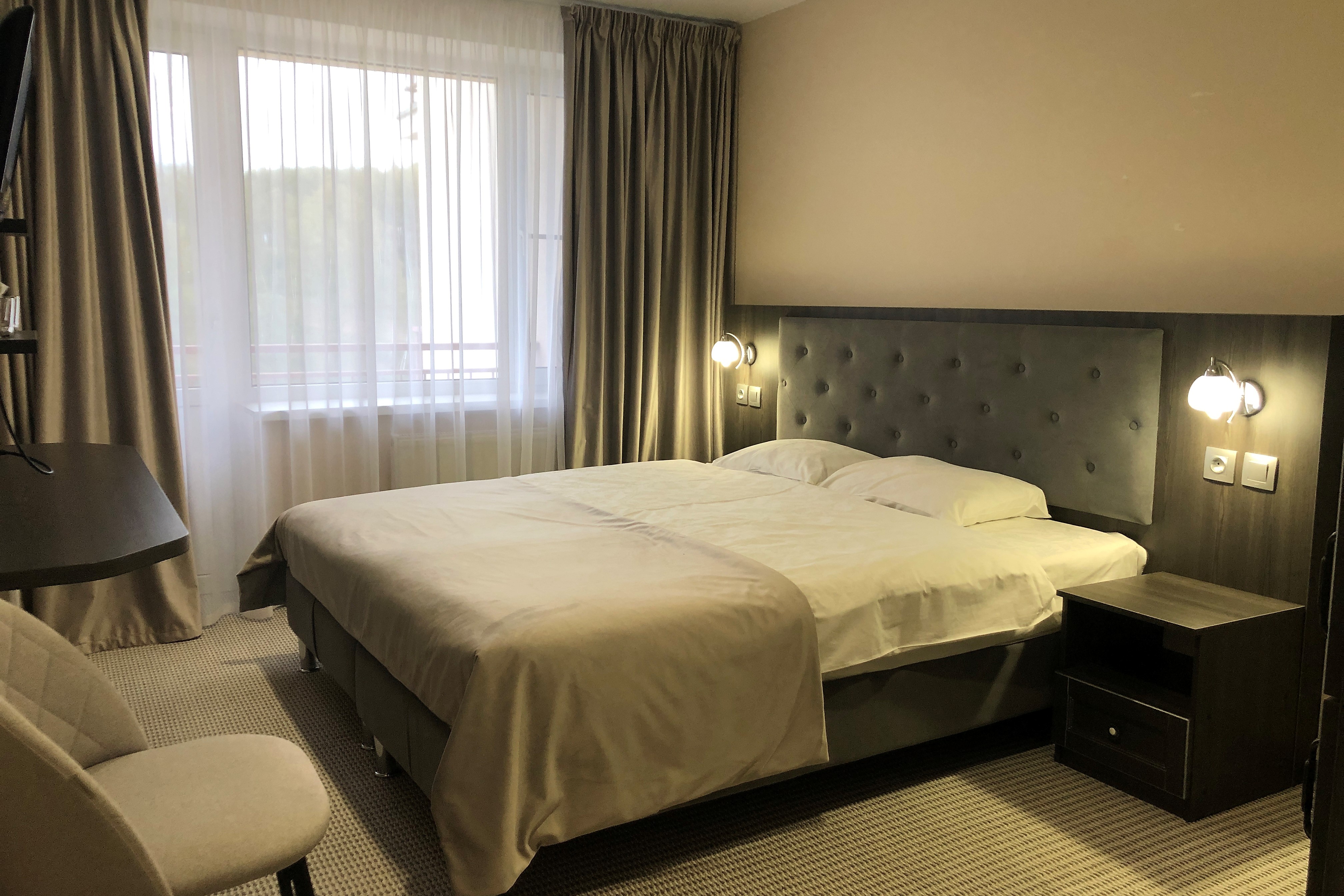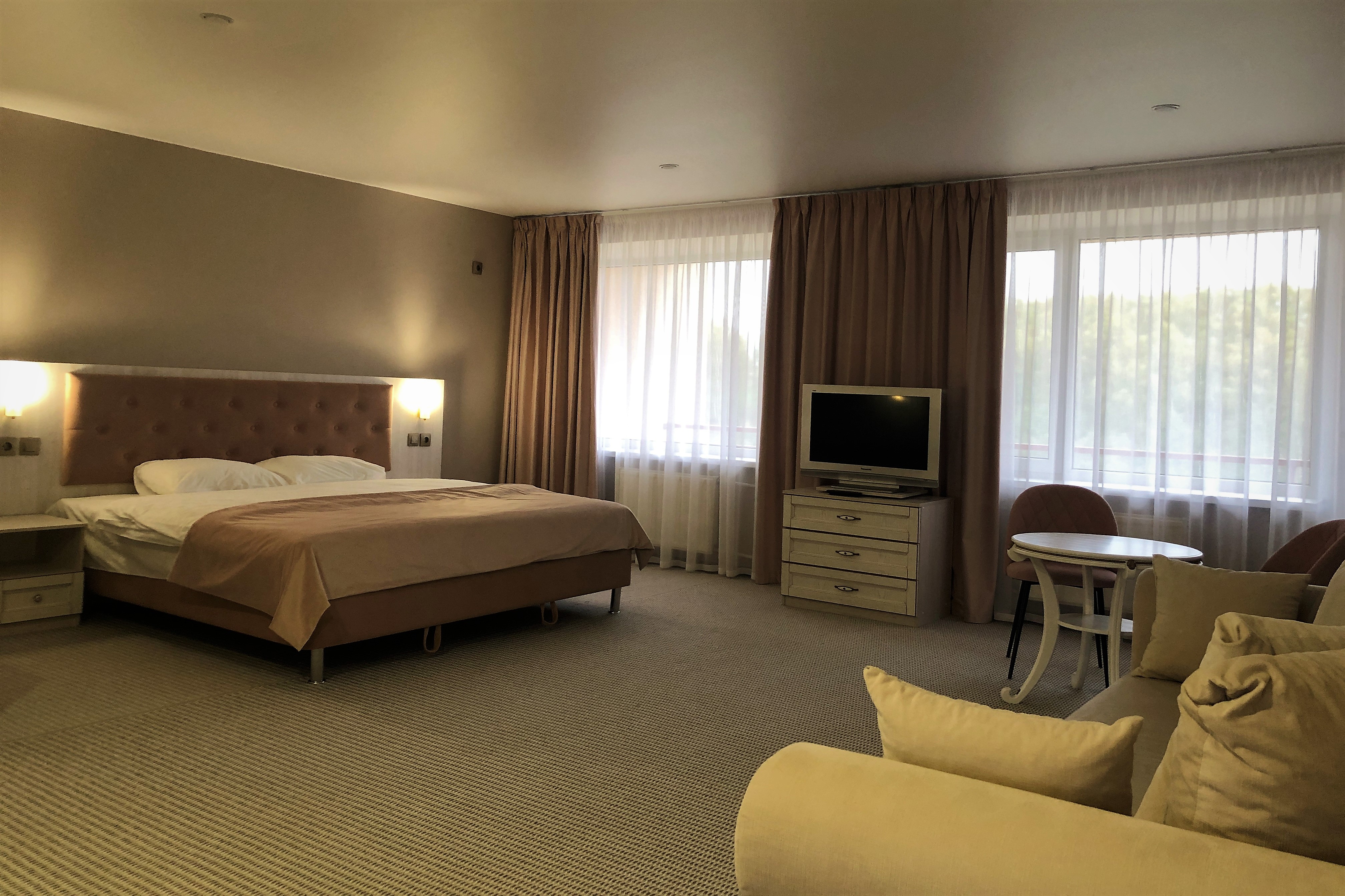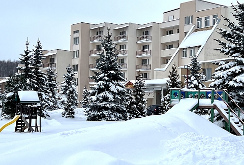 В целом, обширный номерной фонд отеля единовременно готов принять до 900 человек. Гостей ожидают комфортабельные двухместные номера категории Стандарт, Джуниор сьют и Люкс, оснащенные мебелью, санузлом с душем и косметическими принадлежностями. Отель предлагает на выбор двух-, трехразовое питание или только одни завтраки по системе «шведский стол», тип питания при небольшой численности гостей может быть изменен на сет-меню. Для отдыхающих на территории парк-отеля организован крытый бассейн 23х8, бильярд, караоке, настольный теннис, тир, аэрохоккей, кинозал, детский батут и лабиринт, детская игровая комната, сауны и открытые спортплощадки, оборудованные для игры в баскетбол, волейбол, бадминтон, футбол. Зимой – собственный горнолыжный комплекс с 2 горнолыжными трассами и тюбинговой горой, подъемники, освещение, прокат горных лыж, сноубордов и тюбингов, заливают каток, прокладывают лыжные трассы в лесу.В праздничные даты работает анимация. Для проведения различных мероприятий оборудованы конференц-залы, также в отеле есть просторные учебные аудитории. Отдыхающим доступны услуги прачечной, охраняемая парковка, беспроводной интернет и прокат спортивного инвентаря – велосипедов, коньков. Для детей парк-отель предлагает не менее развитую инфраструктуру. На территории обустроены площадки, есть детский городок, живой уголок, игровая комната с игрушками, в игровом зале батут и лабиринт. В праздничные дни проводятся детские дискотеки и работают аниматоры. Кроме того, предусмотрены прокат стульчиков, кроваток и детского спортивного оборудования – роликов, самокатов, велосипедов.