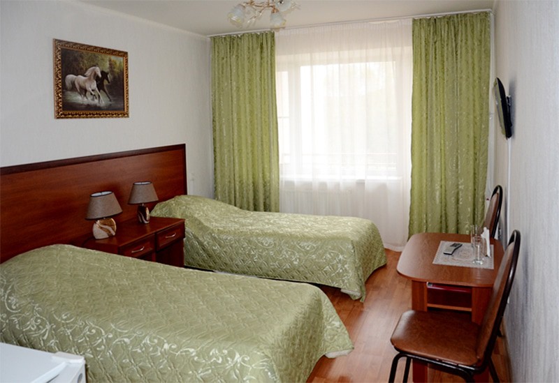 В номере: вешалка, зеркало, кровати односпальные, прикроватные тумбочки, стол, стулья, шкаф, мини-холодильник, телевизор