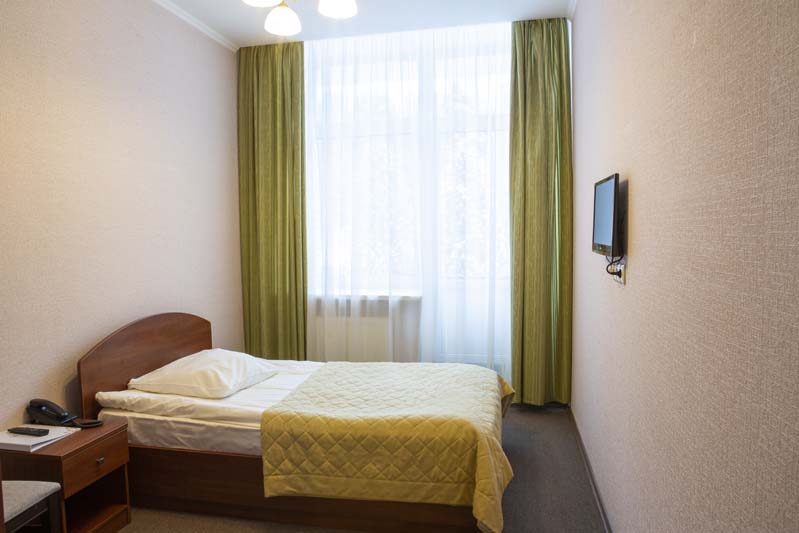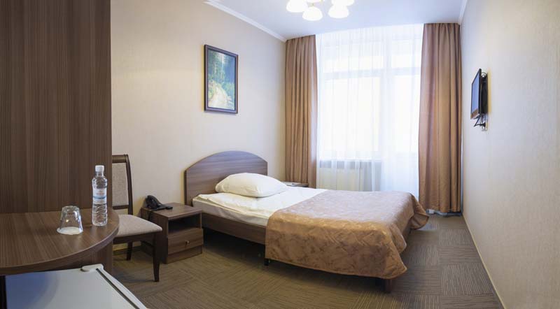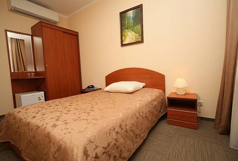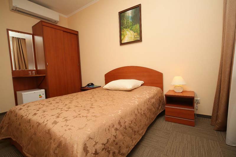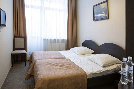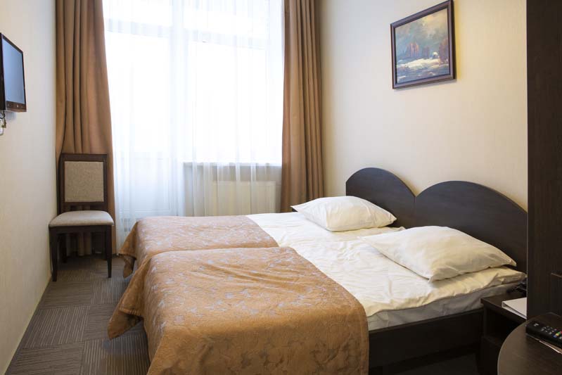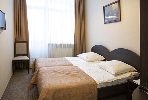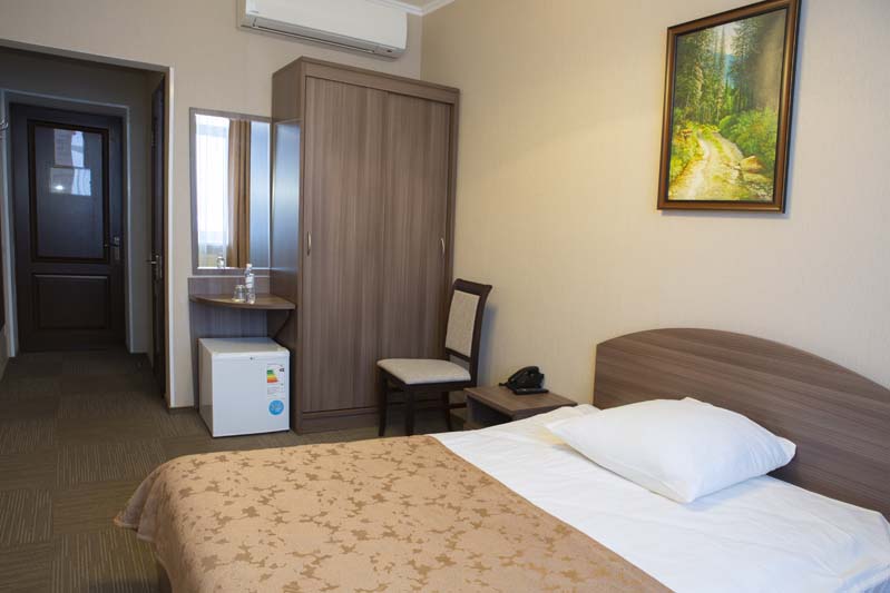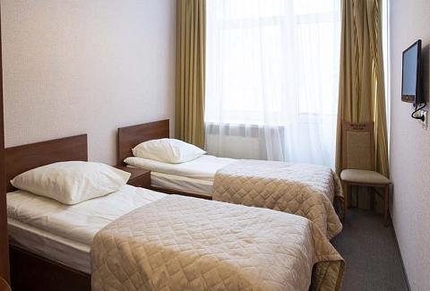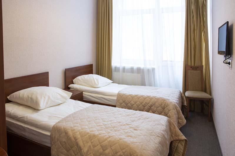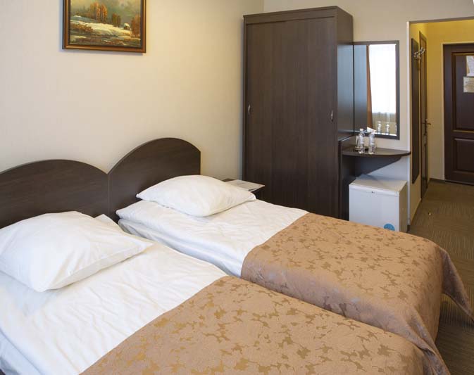 В номере: вешалка, зеркало, кровати односпальные, прикроватные тумбочки, стул, шкаф, мини-холодильник, телевизор ЖК, телефон