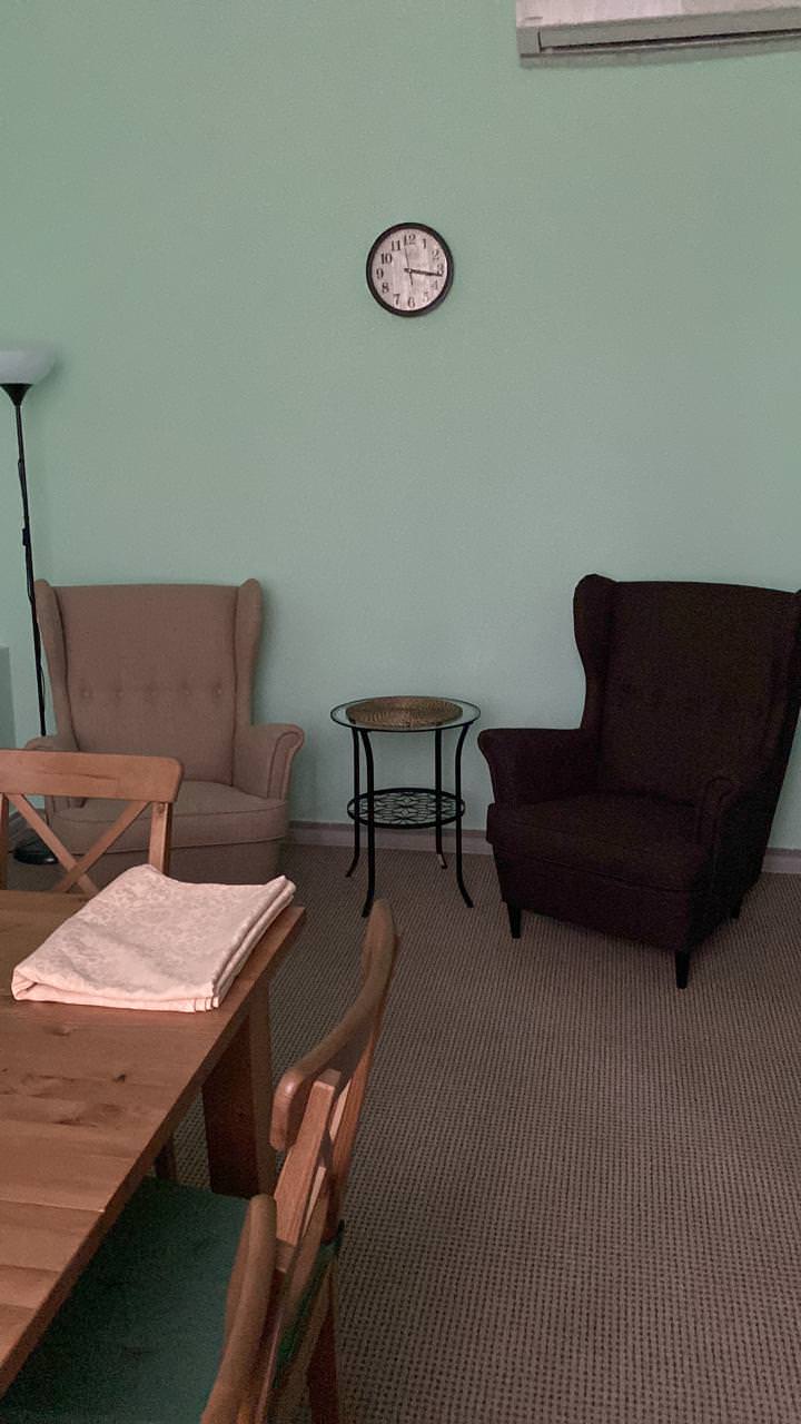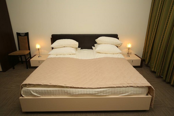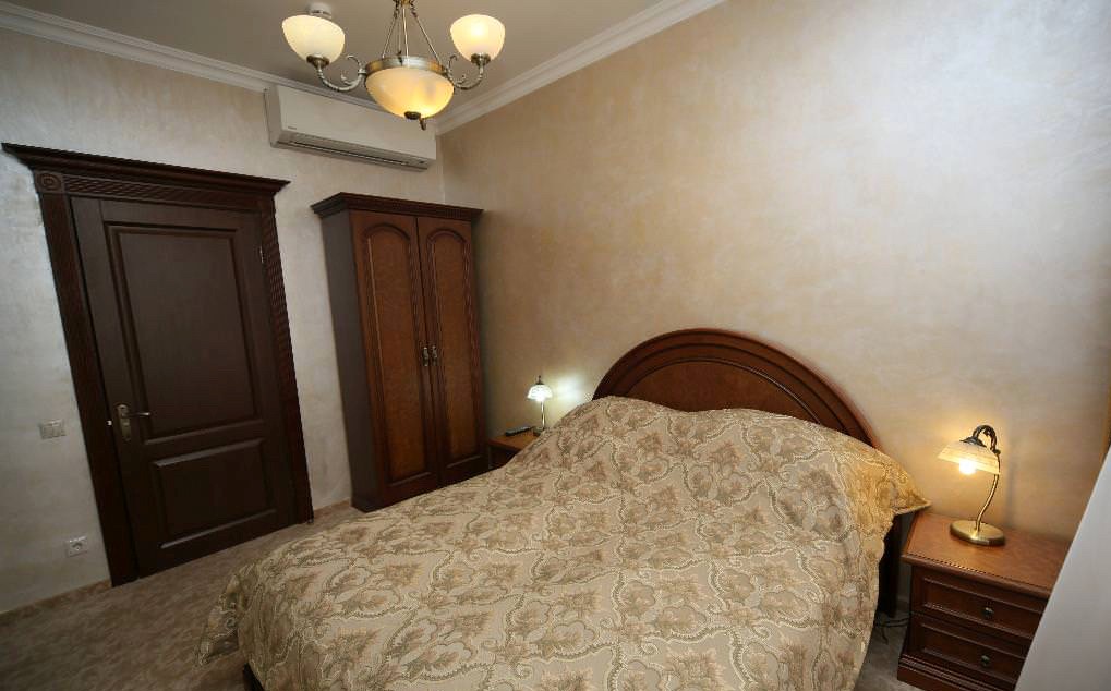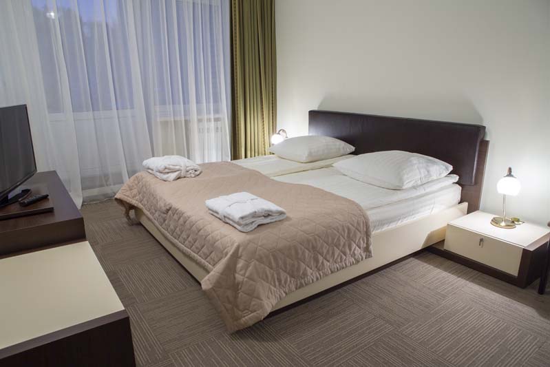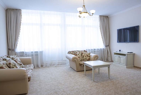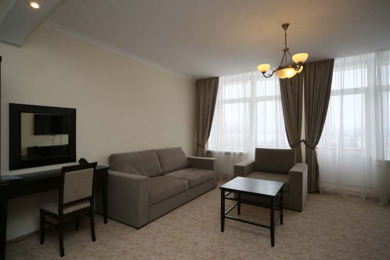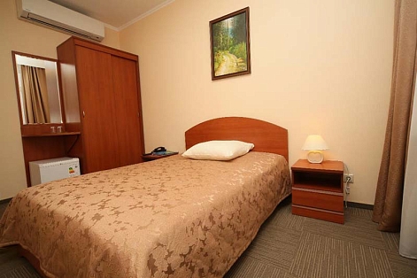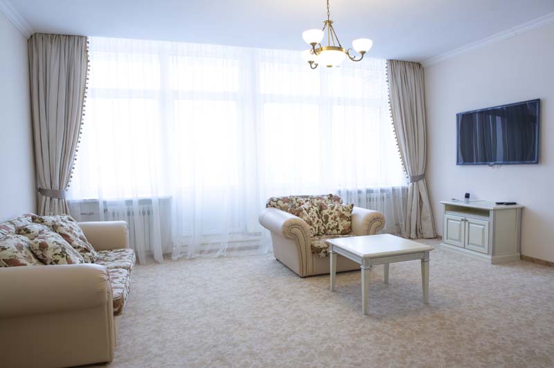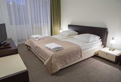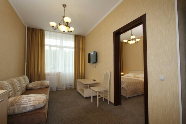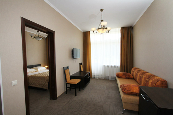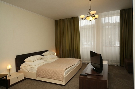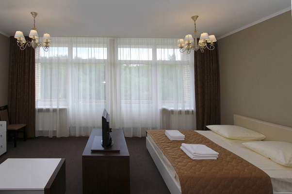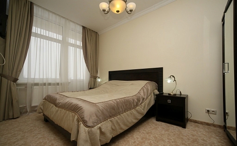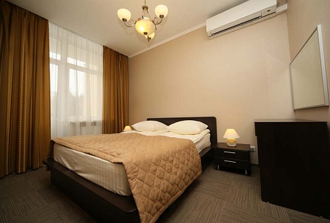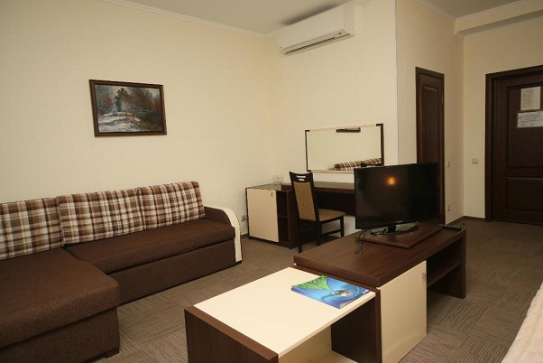 В номере: вешалка, диван, зеркало, кровать двуспальная, прикроватные тумбочки, стол, стулья, шкаф, мини-холодильник, телевизор ЖК, телефон