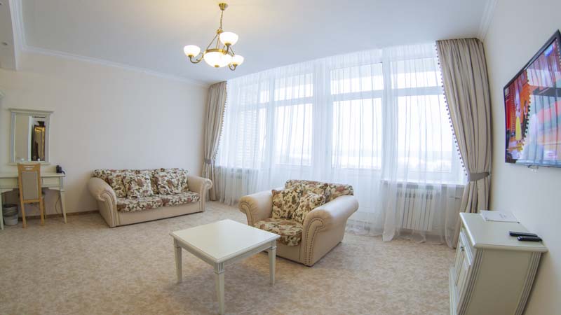 В номере: вешалка, зеркало, кресла, кровать двуспальная, прикроватные тумбочки, стол, столик журнальный, стулья, шкаф, мини-холодильник, сейф, сплит-система, телевизор ЖК, телефон
