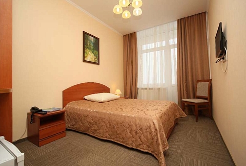 В номере: кровать полутороспальная, стол, стул, мини-холодильник, телевизор