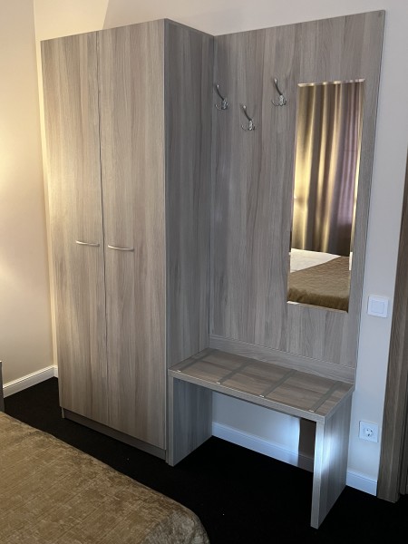 В номере: зеркало, кровати односпальные /одна двуспальная кровать, прикроватные тумбочки, стол, стулья, шкаф, телевизор ЖК, электрочайник