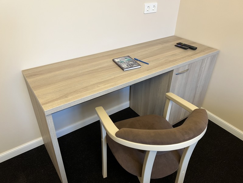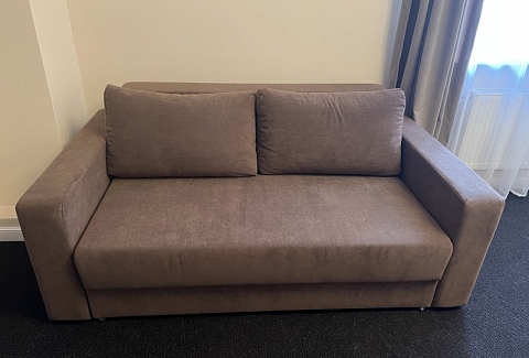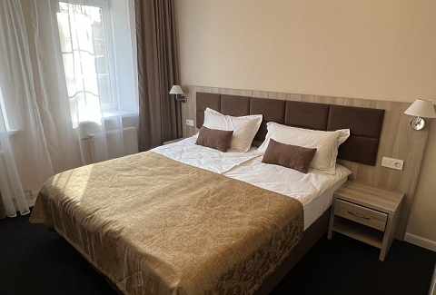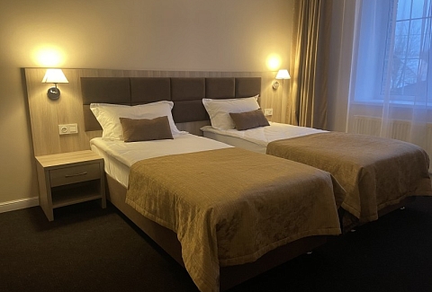 В номере: диван, кровати односпальные /одна двуспальная кровать, прикроватные тумбочки, стол, стулья, шкаф, телевизор ЖК, электрочайник