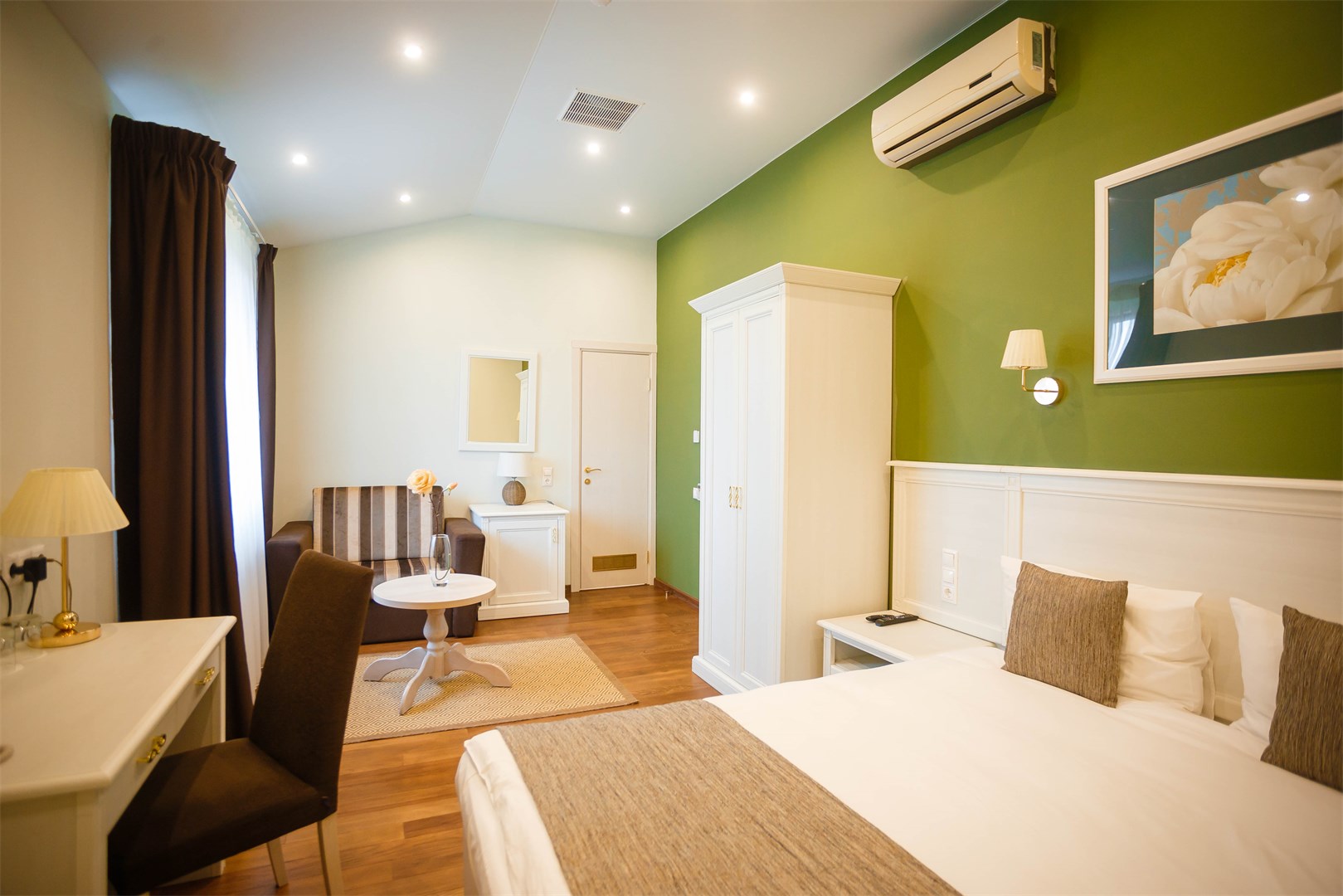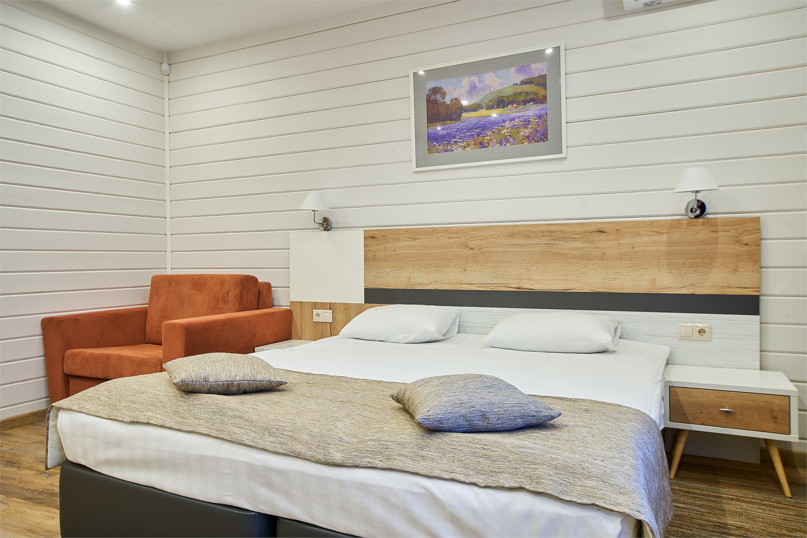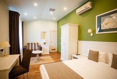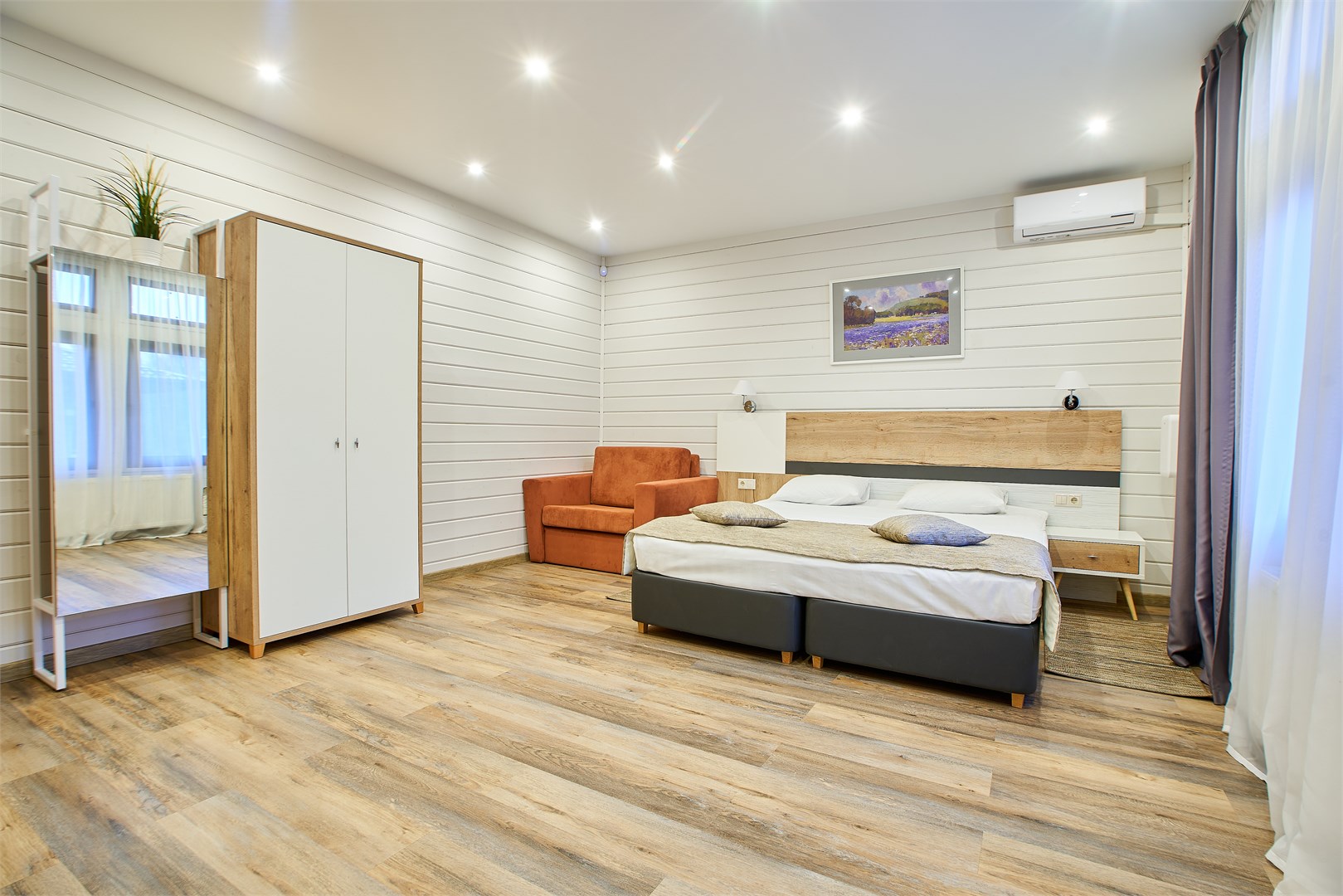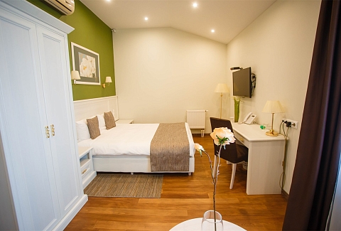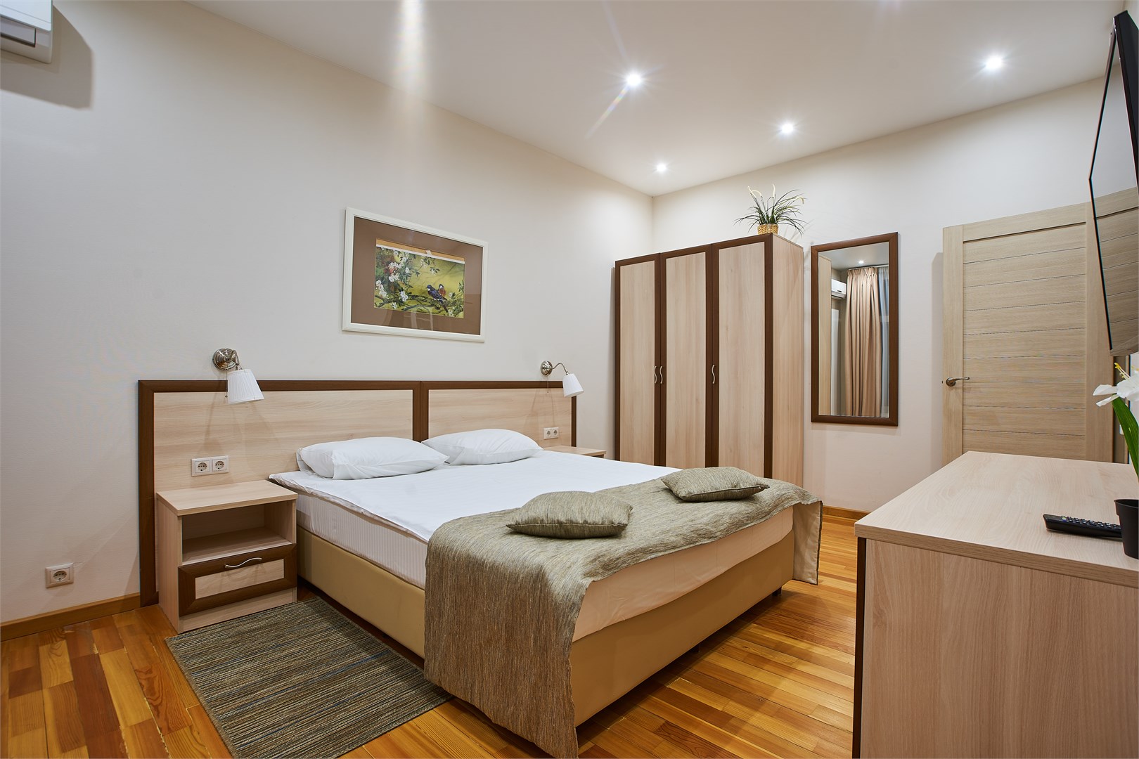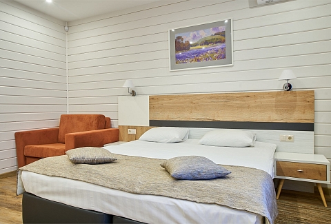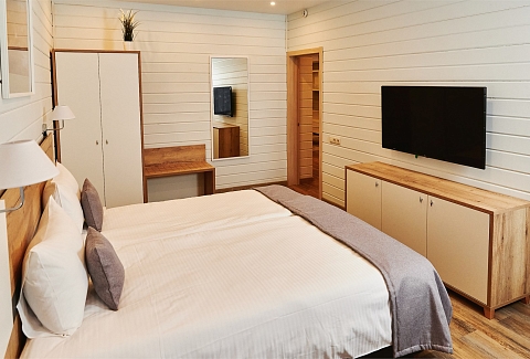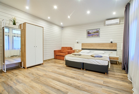 В номере: вешалка, зеркало, кресло, кровать двуспальная, прикроватные тумбочки, стол, стул, шкаф, кондиционер, мини-холодильник, телевизор, телефон