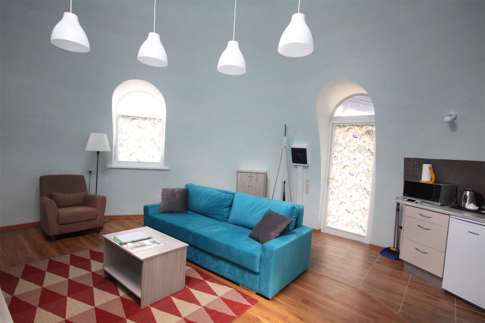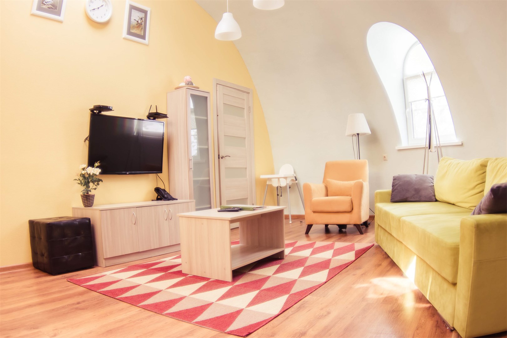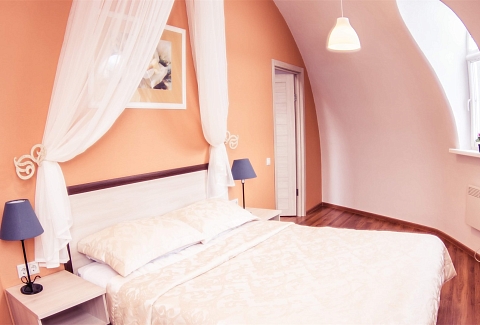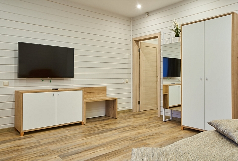 В номере: вешалка, диван, зеркало, кровать двуспальная, прикроватные тумбочки, стол, столик журнальный, стулья, тумба, тумба багажная, шкаф, гладильная доска, кондиционер, микроволновая печь, набор посуды, плита электрическая, телевизор ЖК, телефон, утюг, холодильник, чайный набор посуды, электрочайник