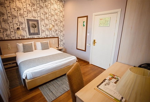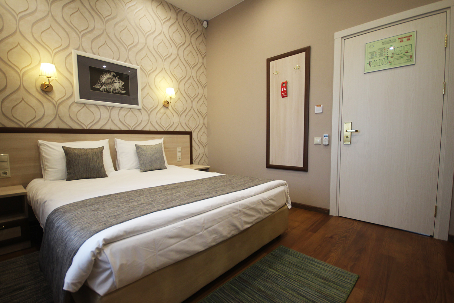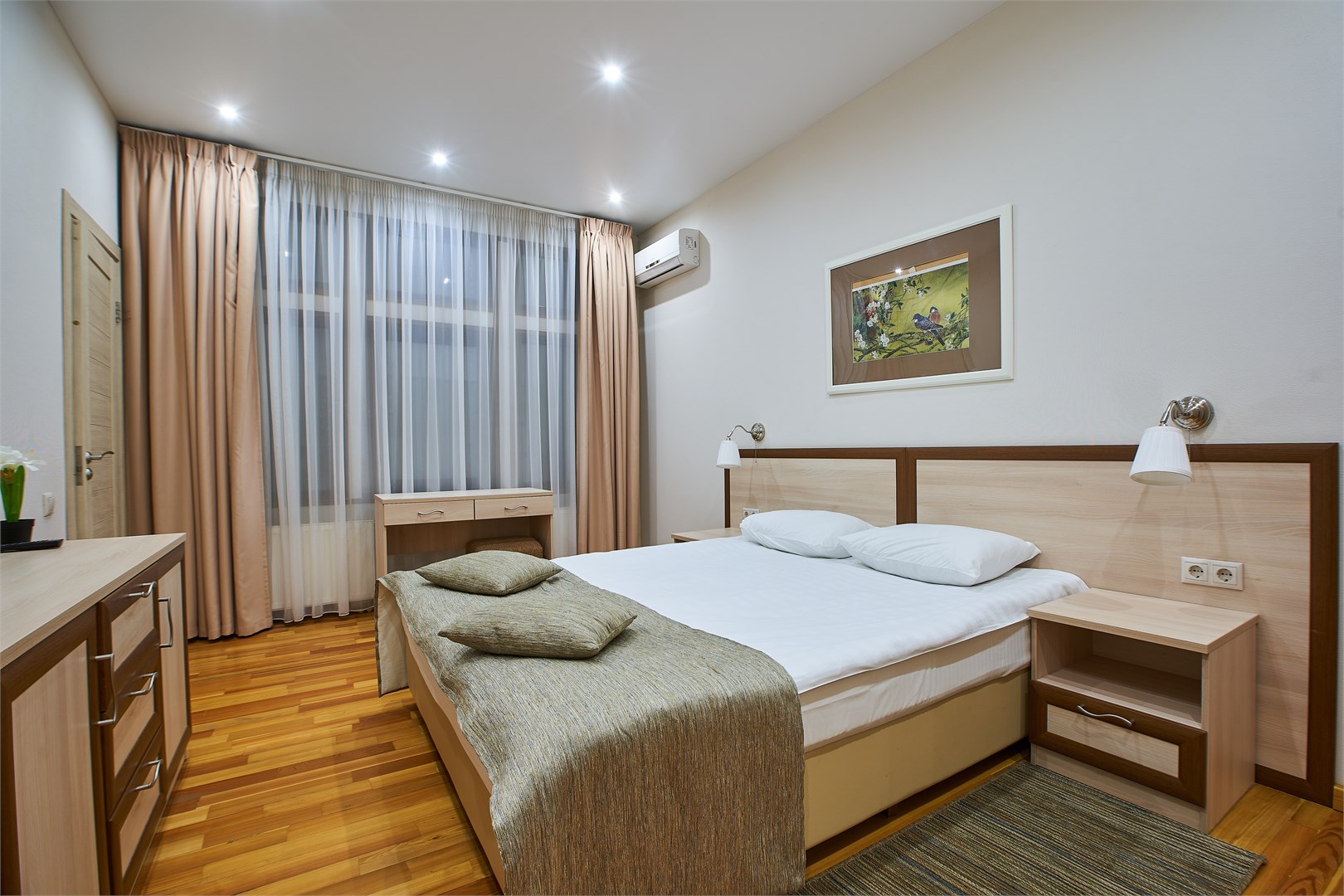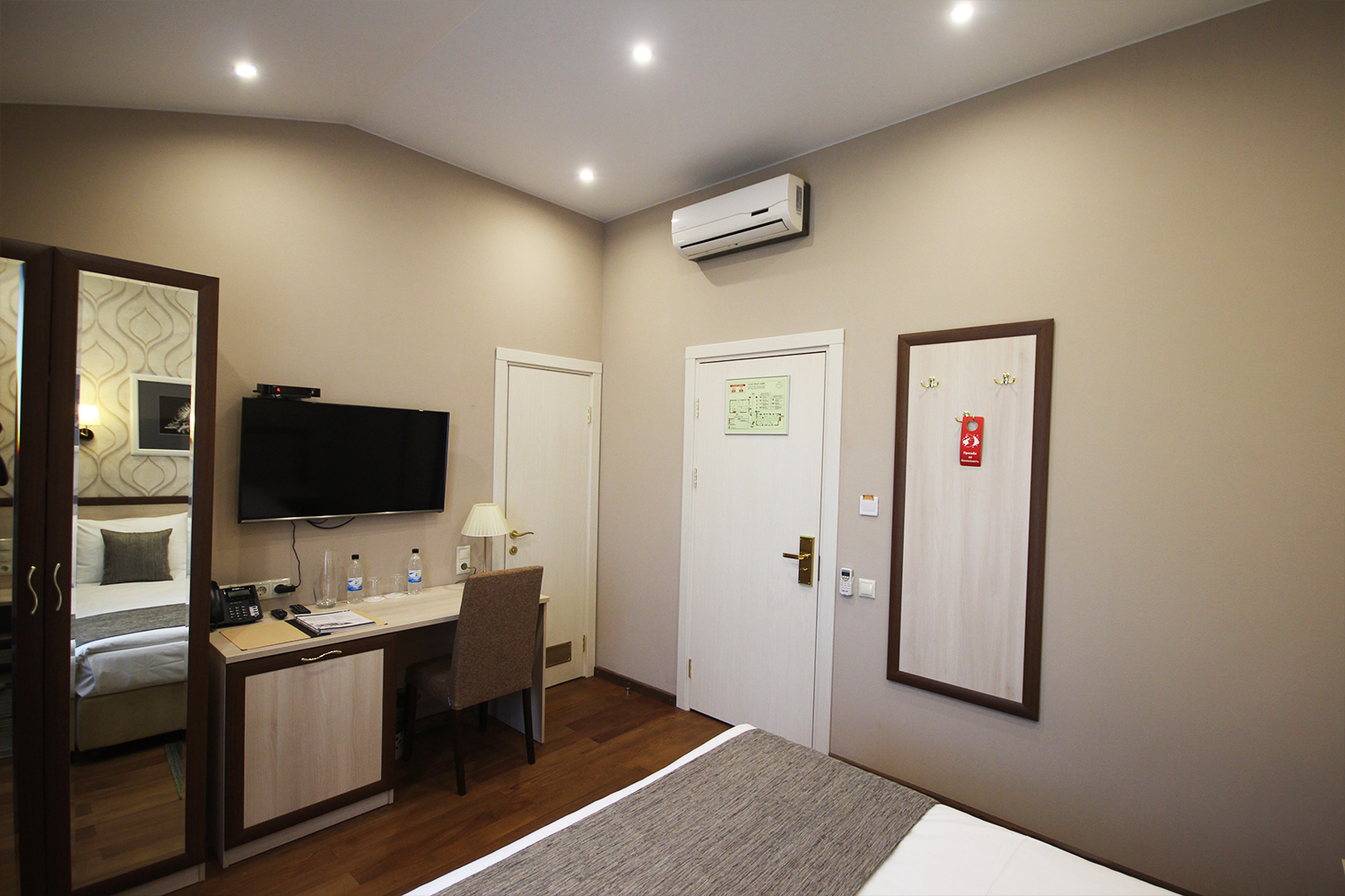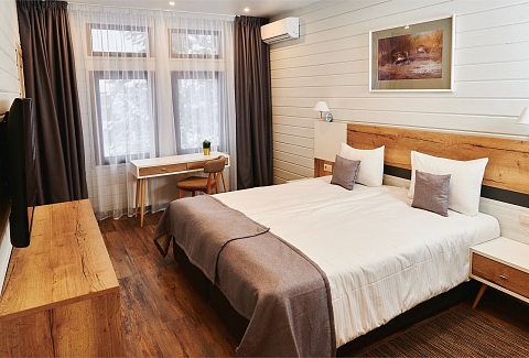 В номере: вешалка, кровать двуспальная, прикроватные тумбочки, стол, стул, шкаф, кондиционер, мини-холодильник, сейф, телевизор