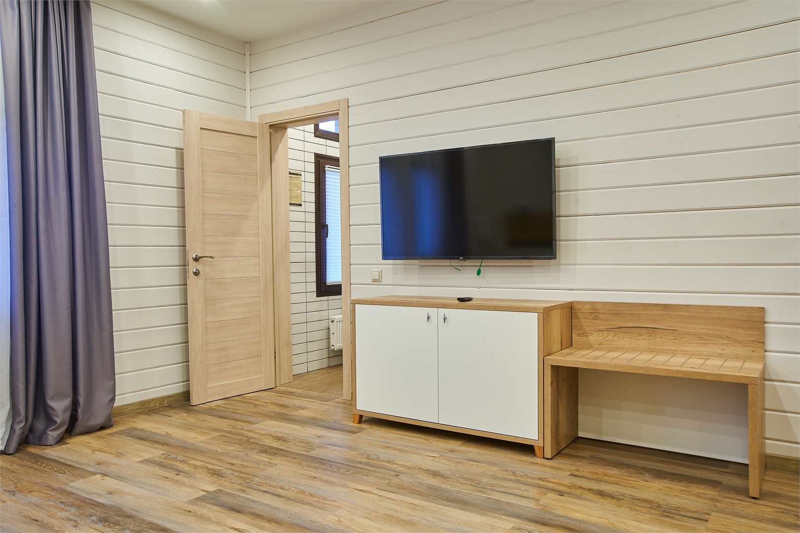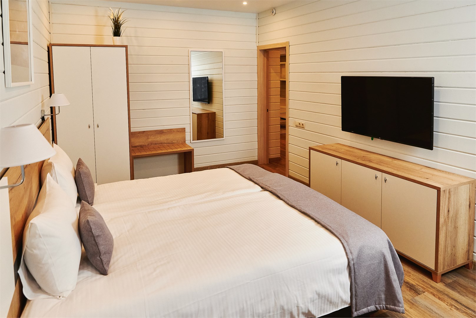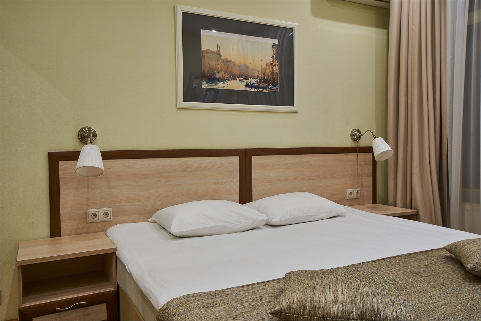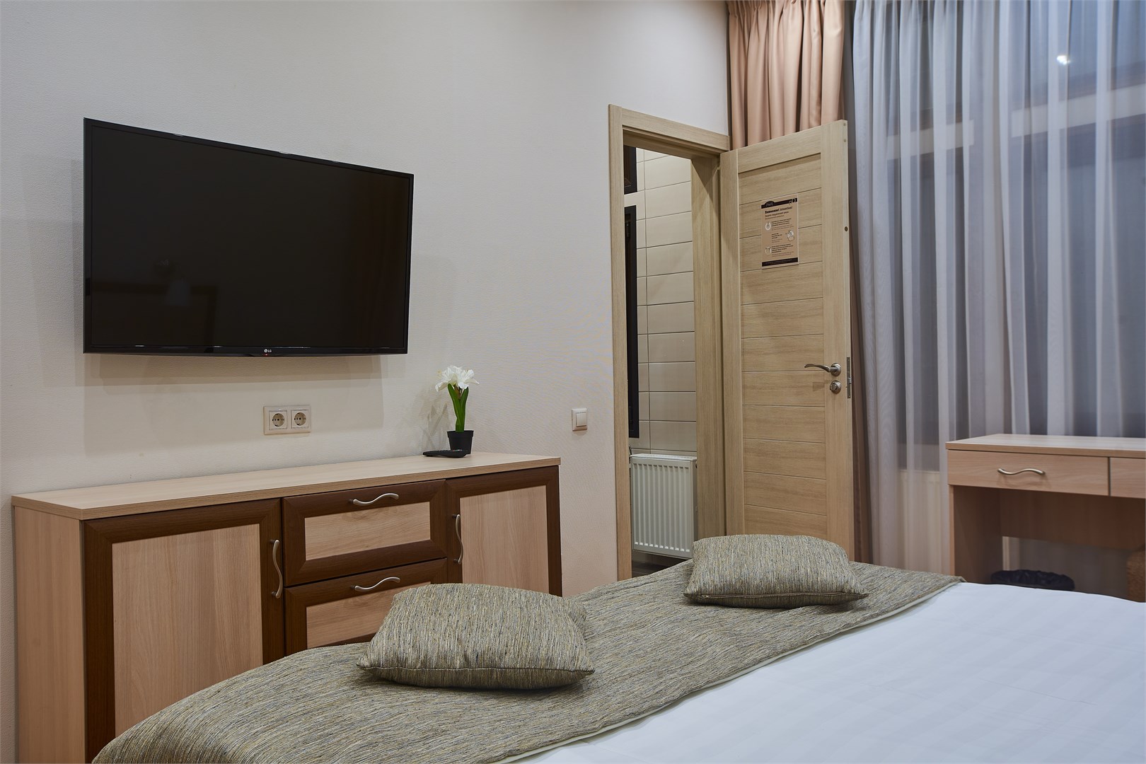 В номере: вешалка, кровать двуспальная, прикроватные тумбочки, стол, стул, шкаф, кондиционер, мини-холодильник, сейф, телевизор