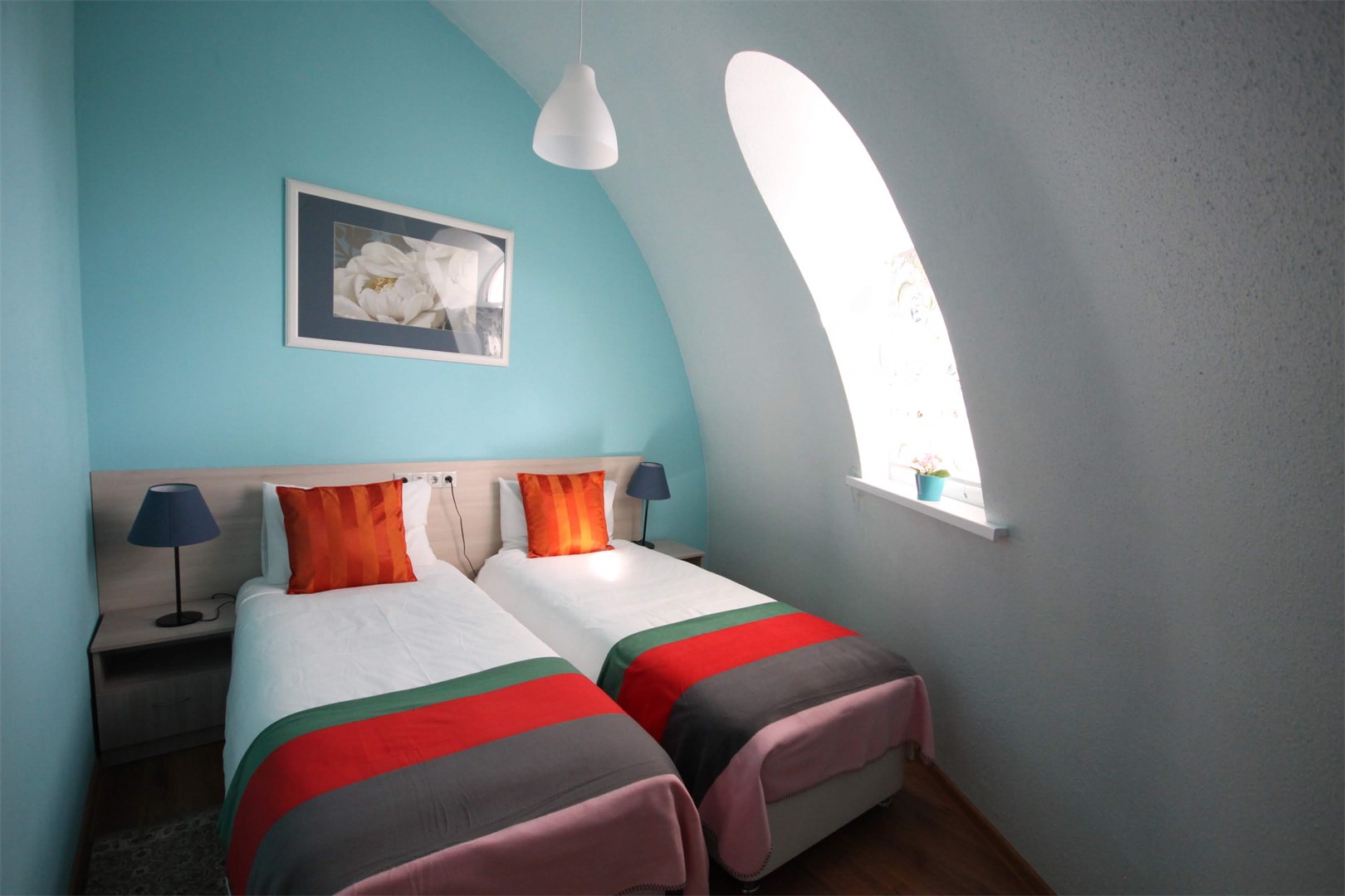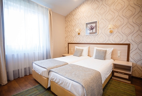 В номере: вешалка, кровати односпальные, прикроватные тумбочки, стол, стул, шкаф, кондиционер, сейф, телевизор, телефон
