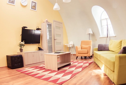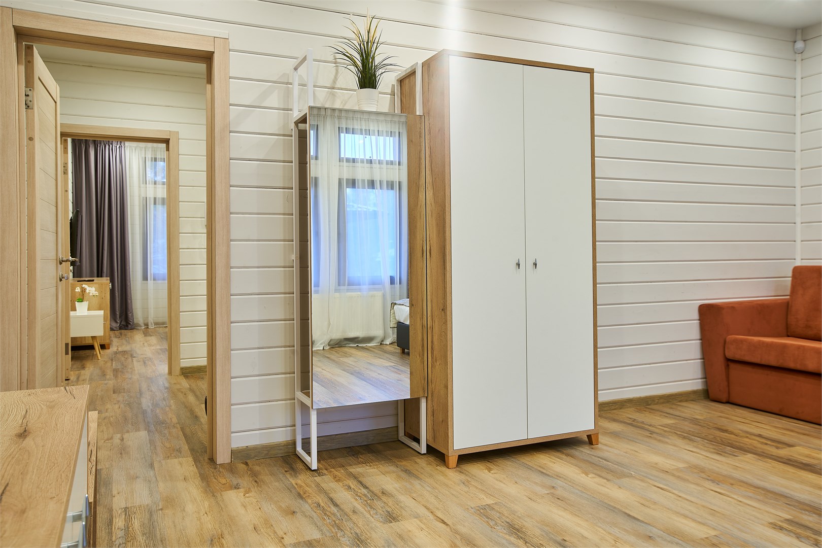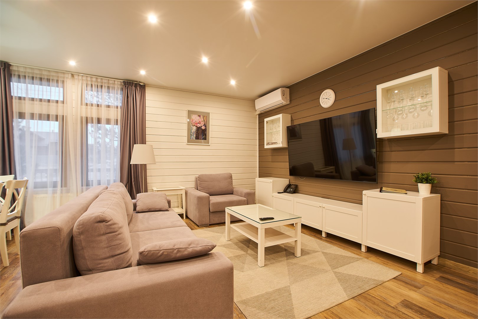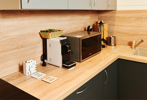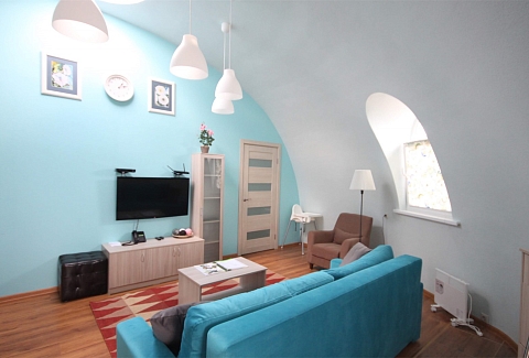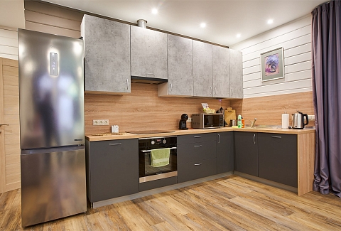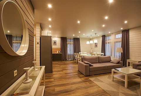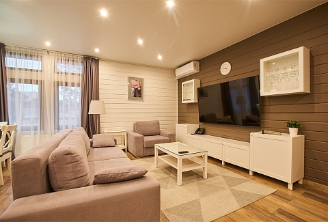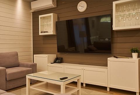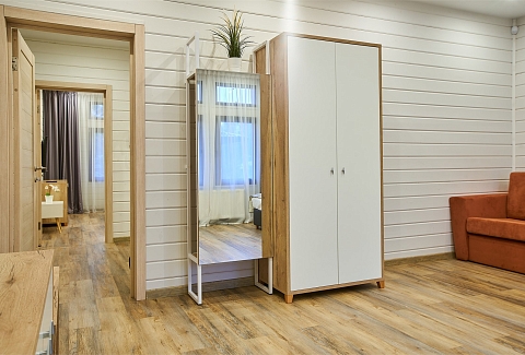 В номере: вешалка, гардеробная, диван, зеркало, комод, кровать двуспальная, кухонная мебель, набор мягкой мебели, прикроватные тумбочки, стол, стулья, шкаф, гладильная доска, духовой шкаф, кондиционер, микроволновая печь, набор посуды, плита электрическая, сейф, телевизор ЖК, телефон, утюг, холодильник, чайный набор посуды, электрочайник