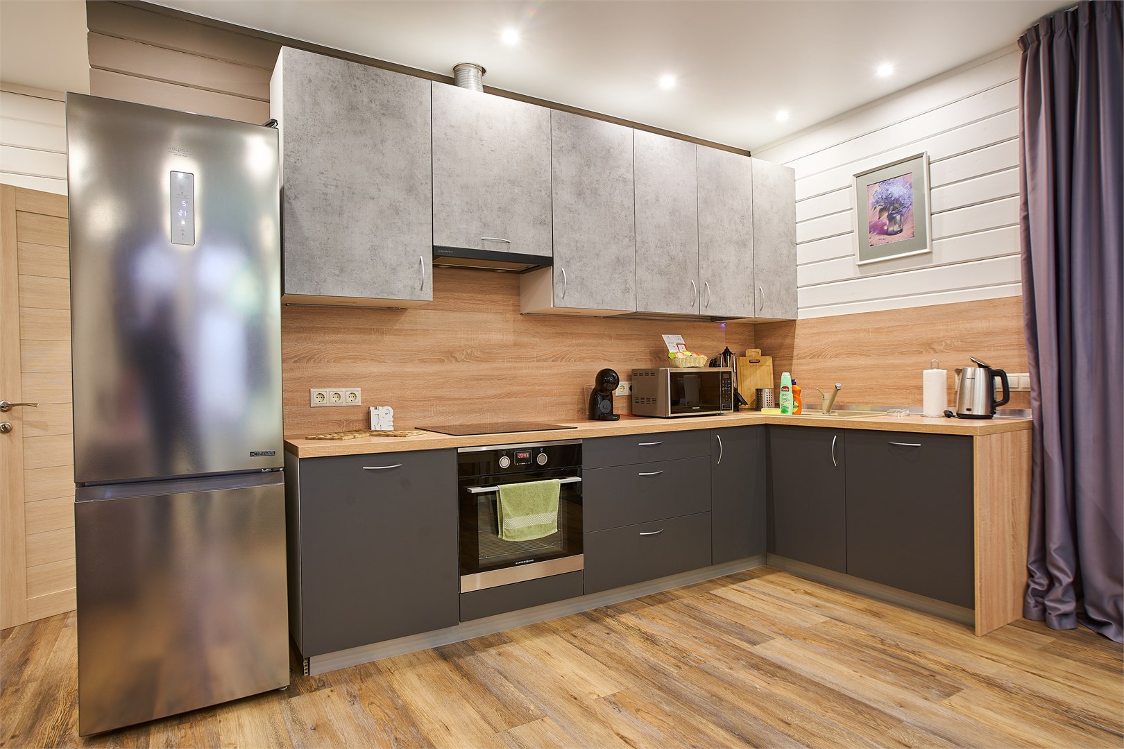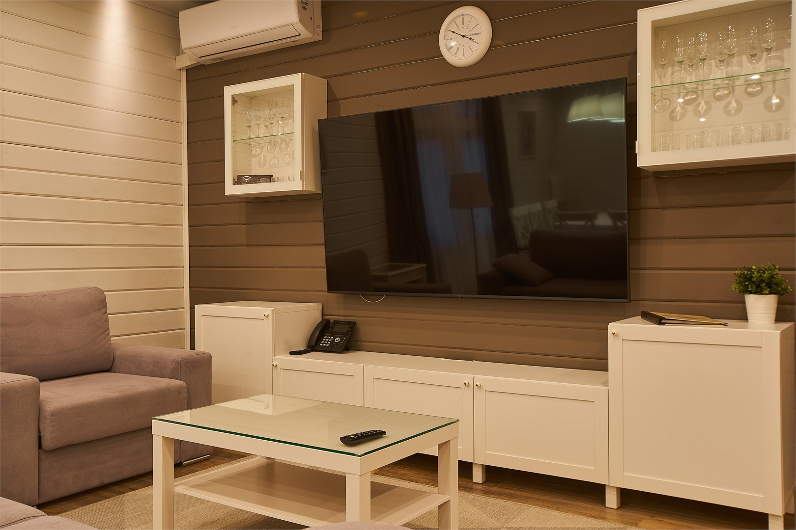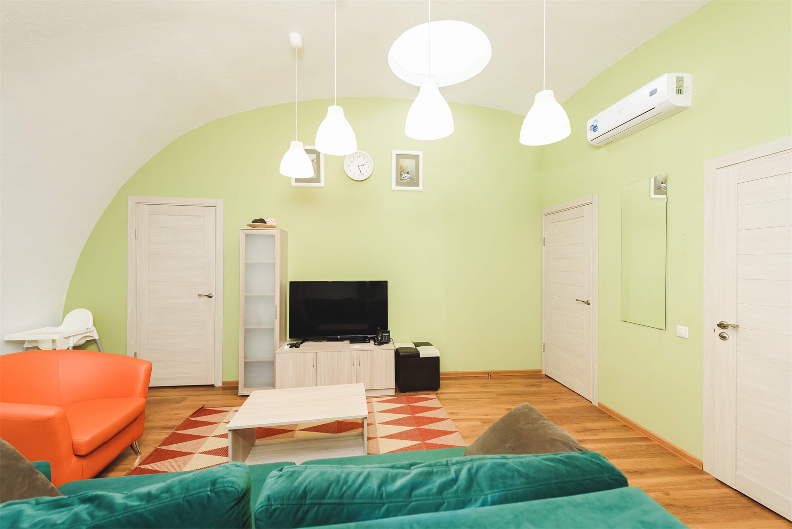 В номере: вешалка, гардеробная, диван, зеркало, комод, кровать двуспальная, кухонная мебель, набор мягкой мебели, прикроватные тумбочки, стол, стулья, шкаф, гладильная доска, духовой шкаф, кондиционер, микроволновая печь, набор посуды, плита электрическая, сейф, телевизор ЖК, телефон, утюг, холодильник, чайный набор посуды, электрочайник