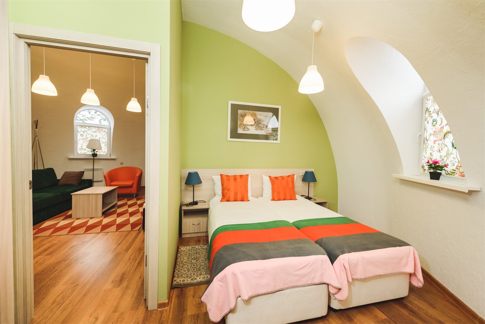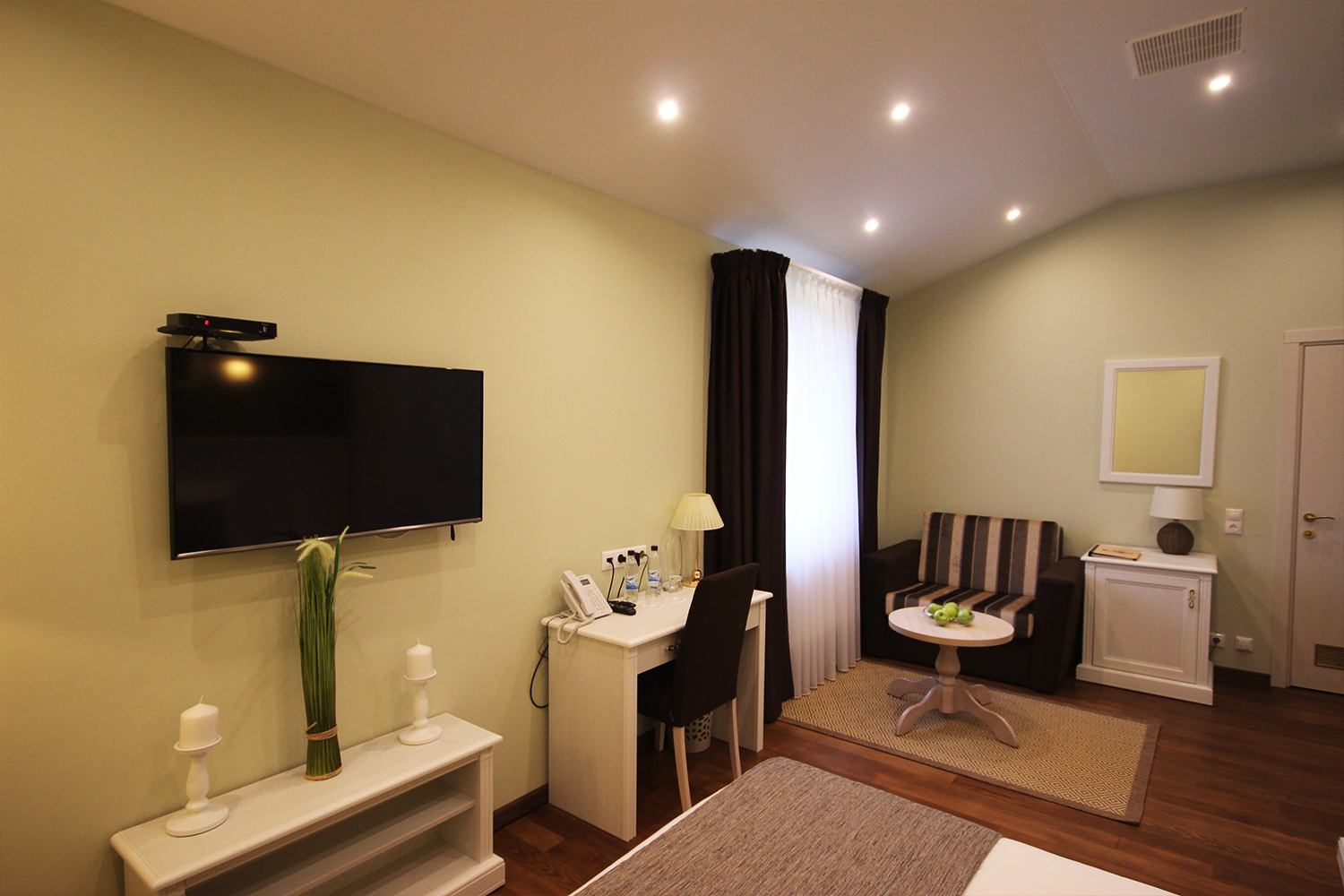 В номере: диван, кресло, кровати односпальные, прикроватные тумбочки, стол, столик журнальный, стул, кондиционер, микроволновая печь, набор посуды, сейф, телевизор, телефон, холодильник, электрочайник