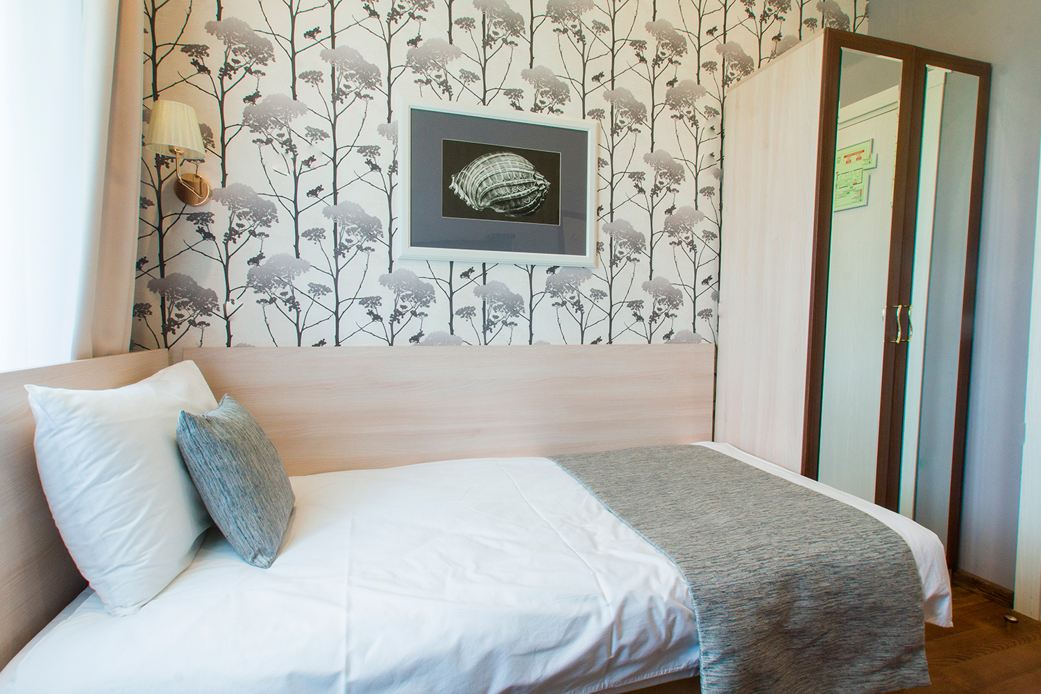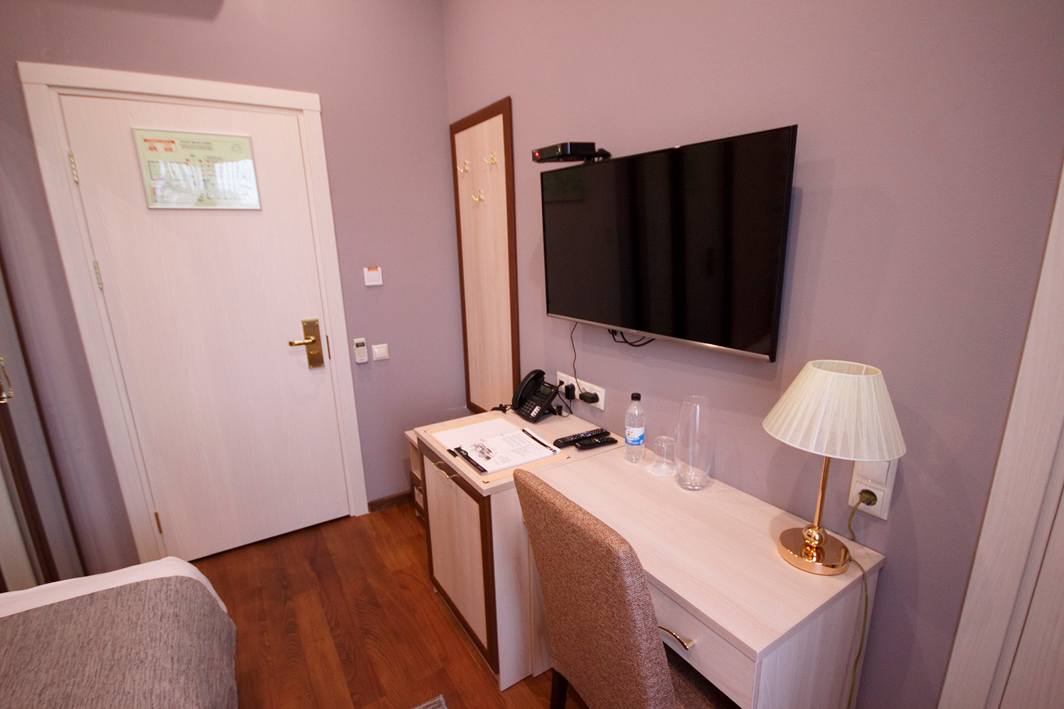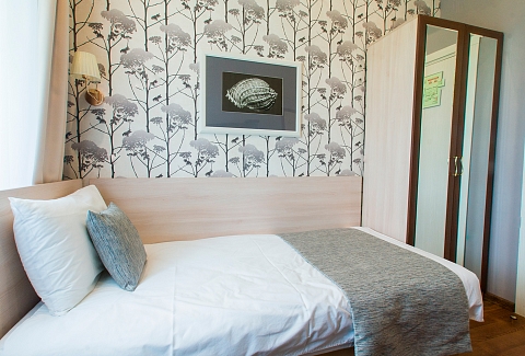 В номере: вешалка, кровать односпальная, стол, стул, шкаф, кондиционер, мини-холодильник, сейф, телевизор, телефон