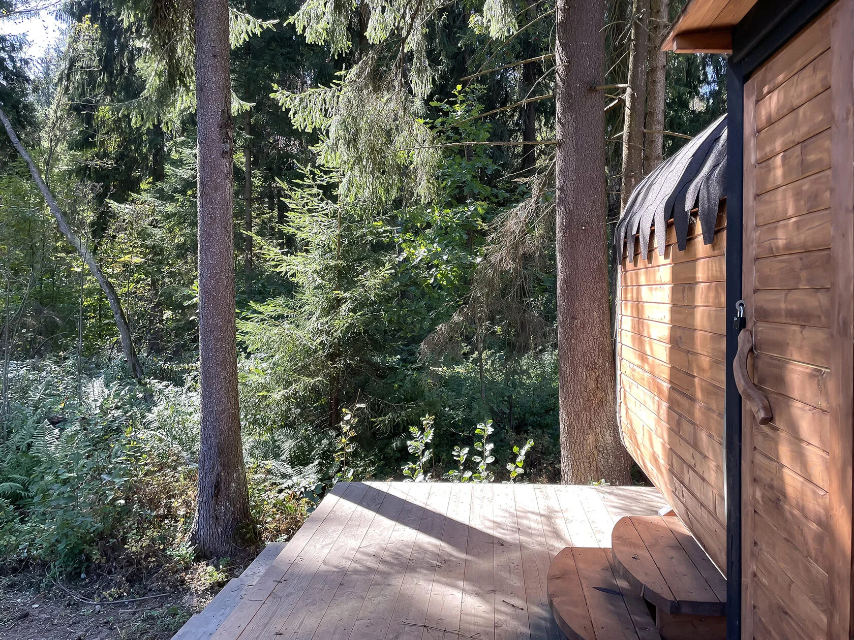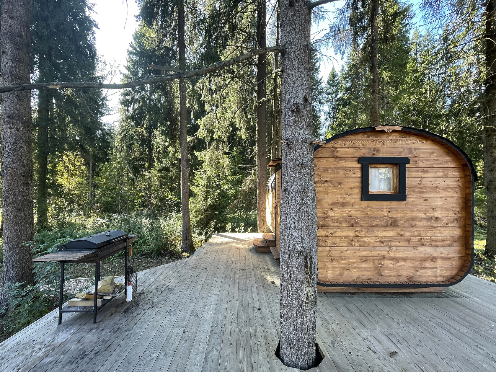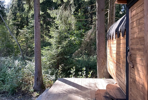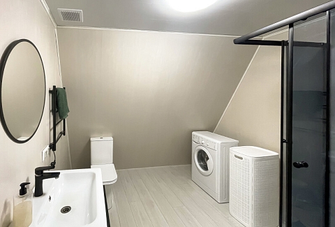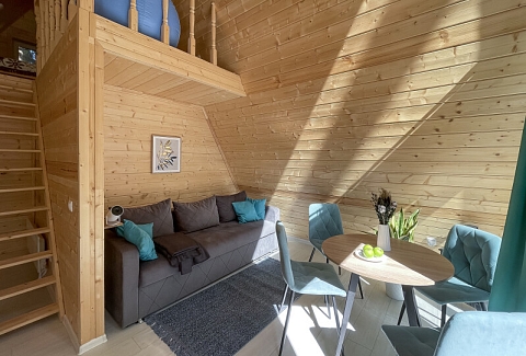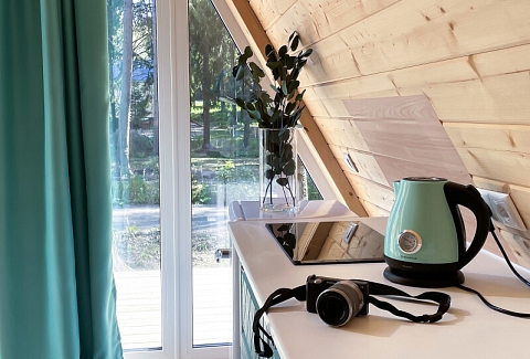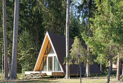 К размещению гостей предлагается уютный домик А-фрейм, вместимостью на 2 человека. Площадь 40 квадратных метров. На 2 этаже расположена двуспальная кровать King Size, на первом — раскладной диван. Самостоятельная организация питания возможна на полностью оборудованный кухне. Для этого есть мини-холодильник, электрическая плита, электрический чайник и полный набор посуды. Уютный дом-шалаш оснащен баней с купелью и проектором для просмотра любимых фильмов.