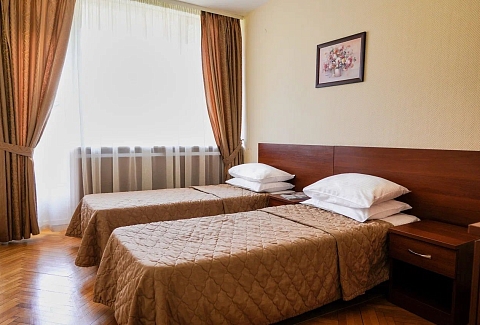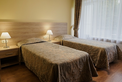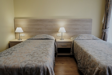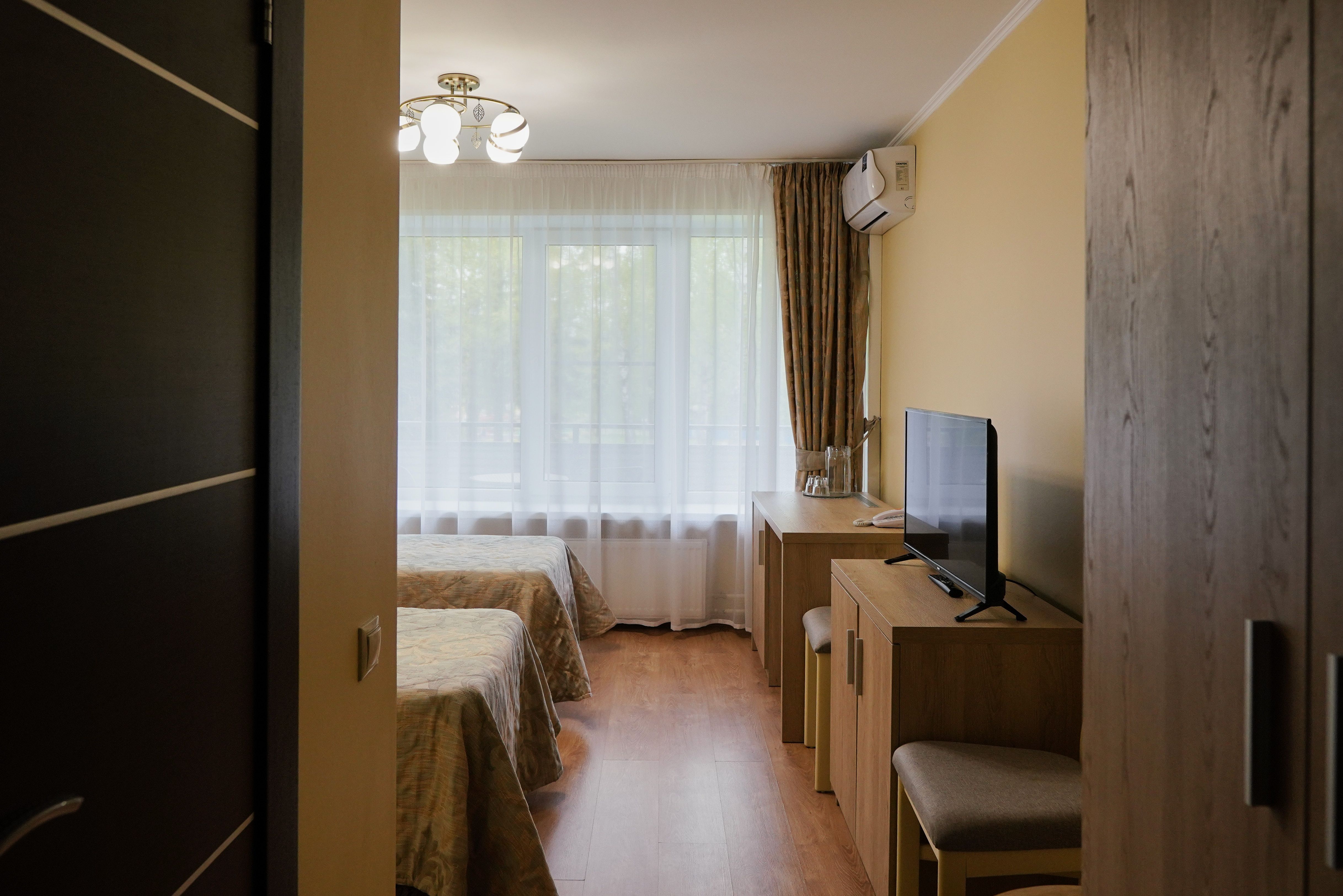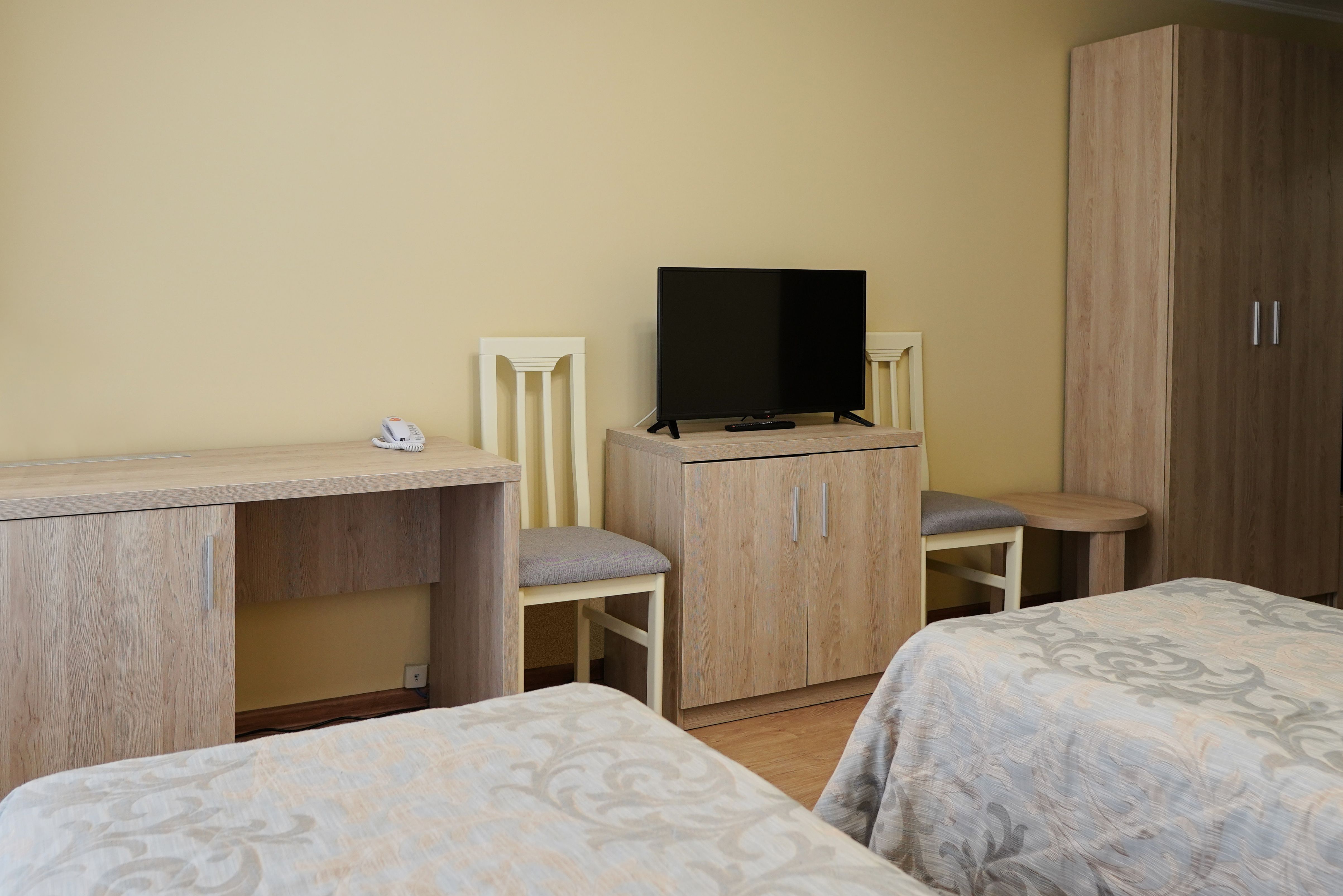 В номере: вешалка, кровати односпальные, прикроватные тумбочки, стол, стулья, шкаф, кондиционер, мини-холодильник, набор посуды, телевизор, телефон, электрочайник