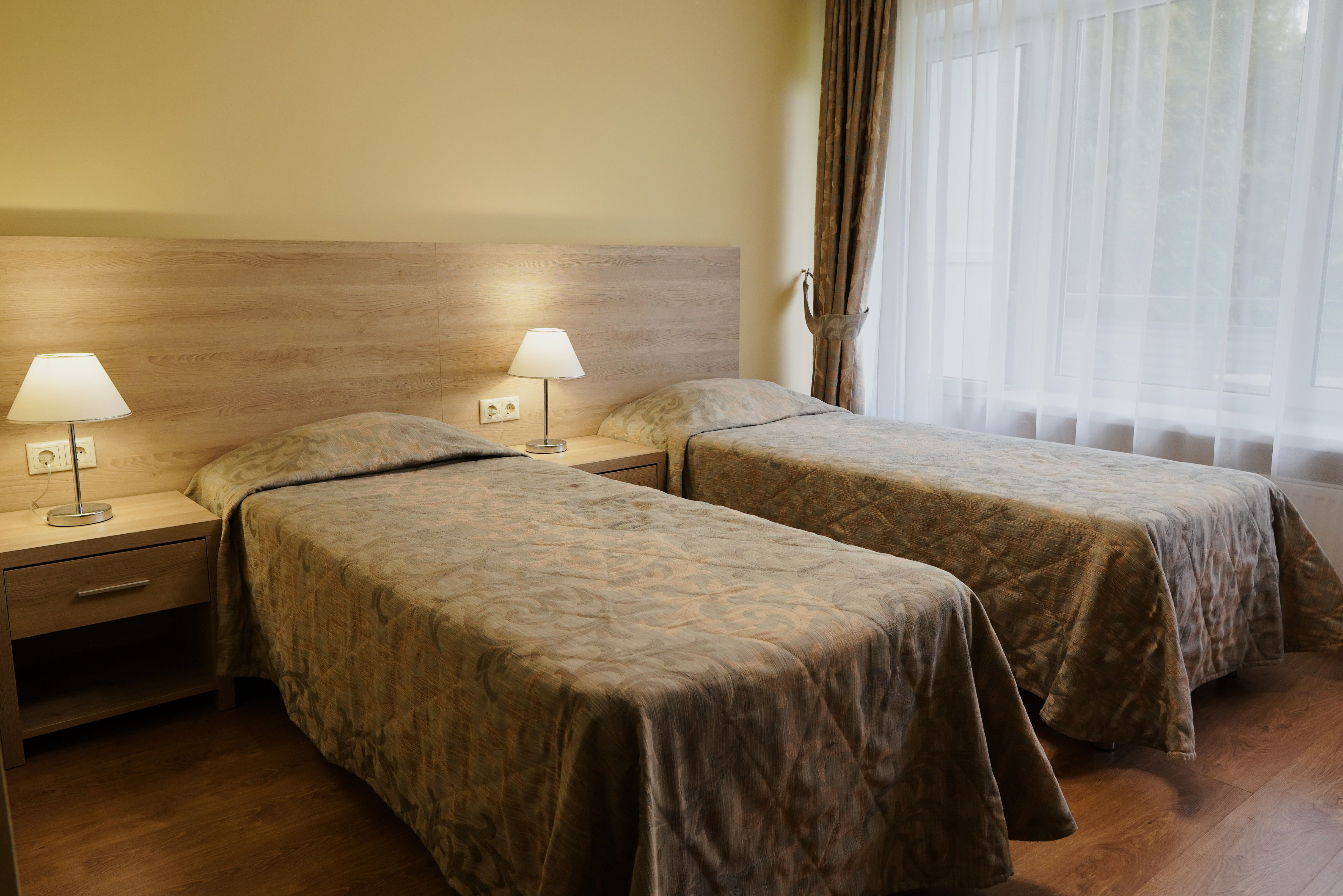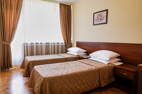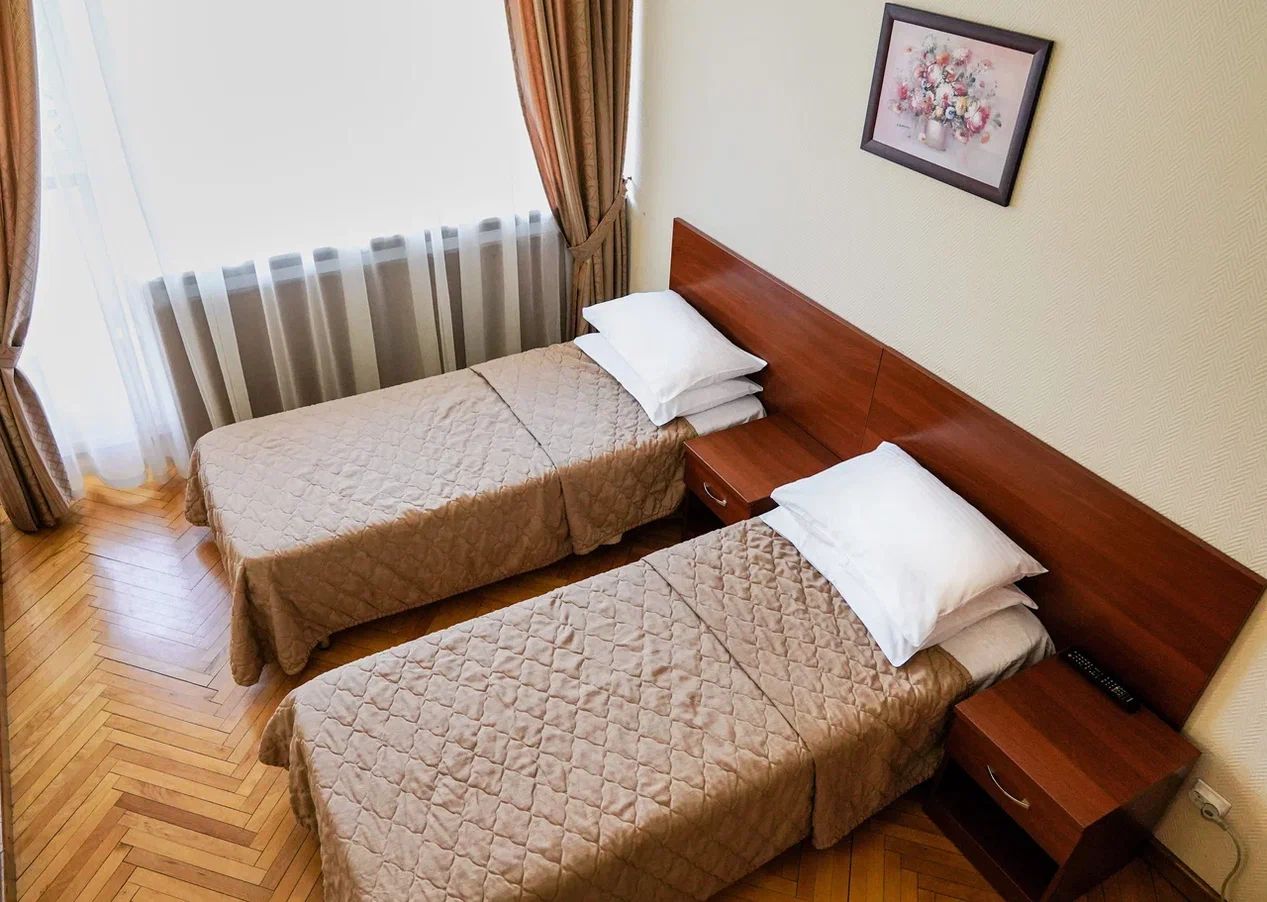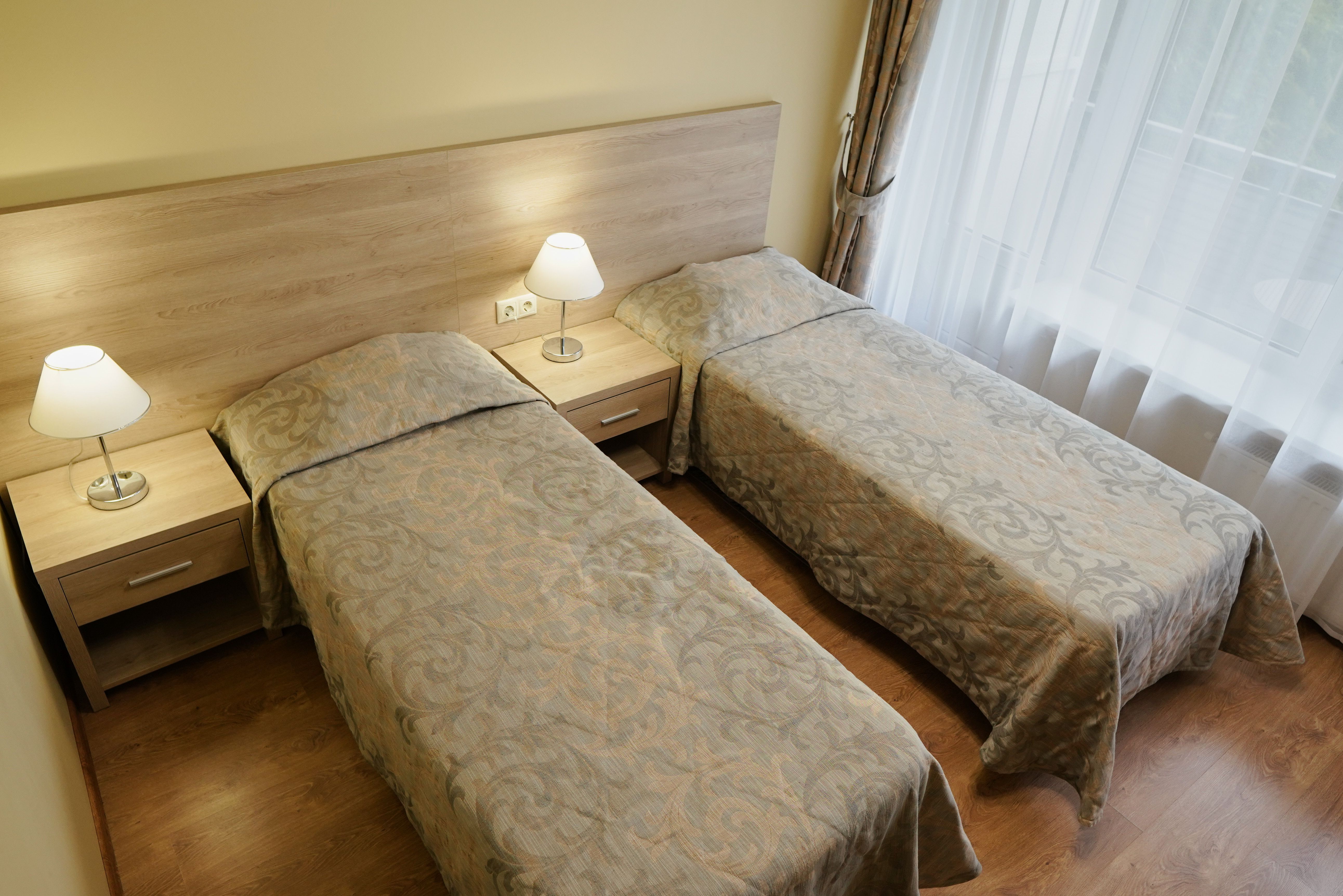 В номере: вешалка, кровати односпальные, прикроватные тумбочки, стол, стулья, шкаф, кондиционер, мини-холодильник, набор посуды, телевизор, телефон, электрочайник