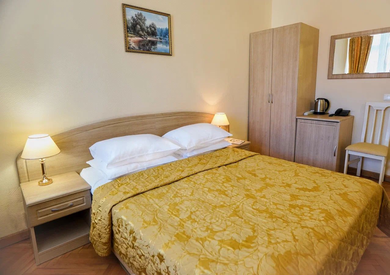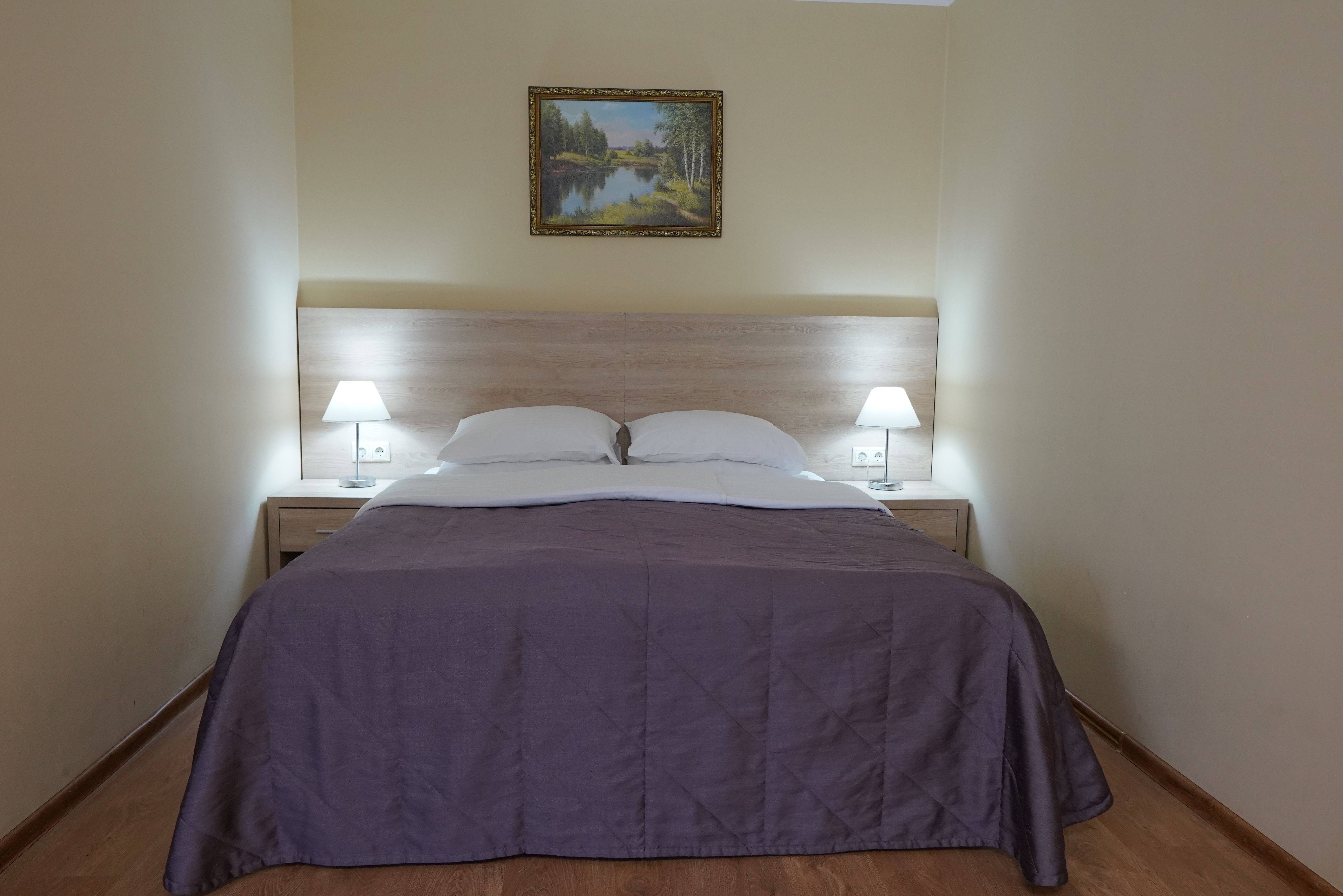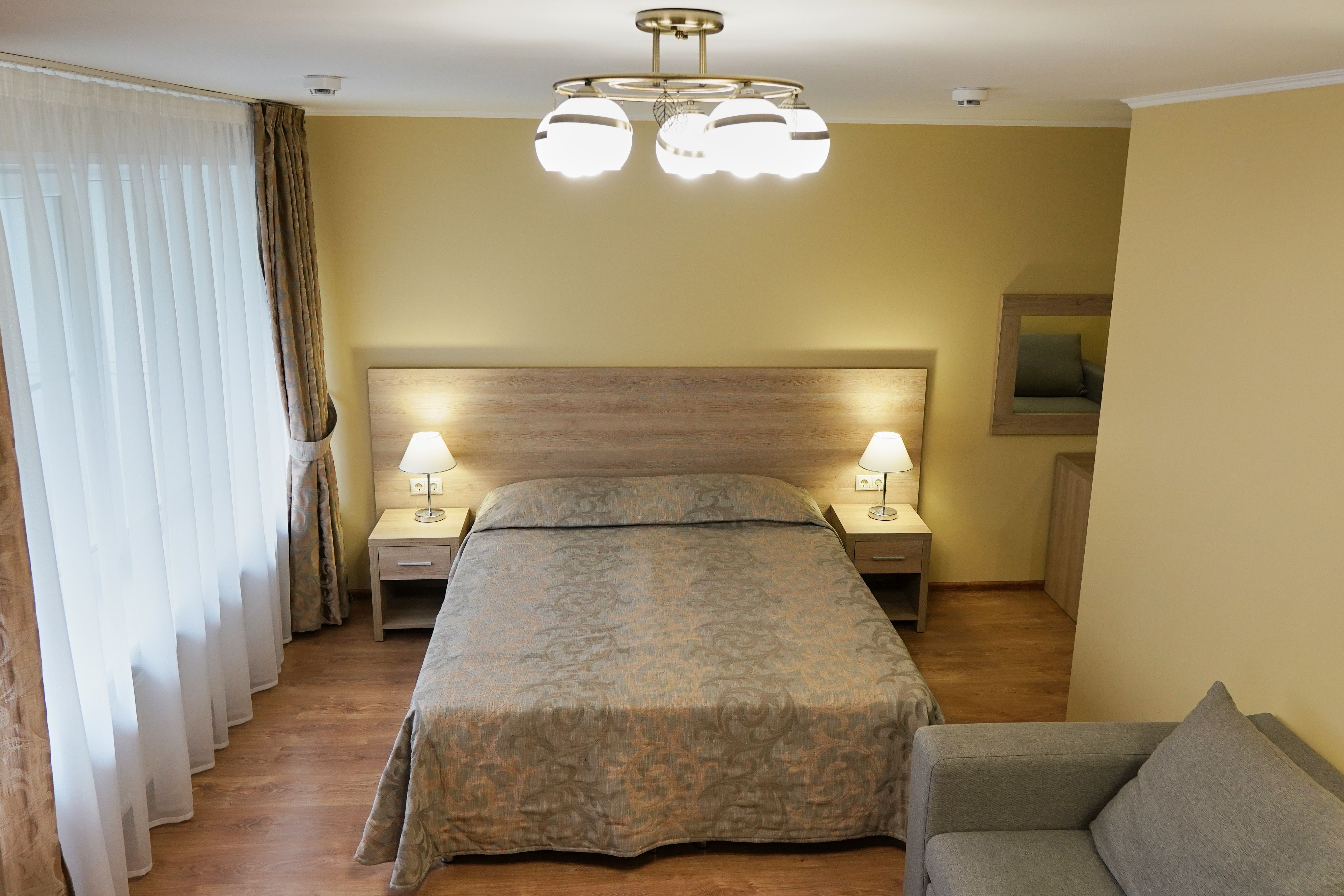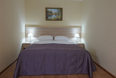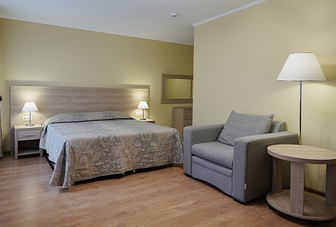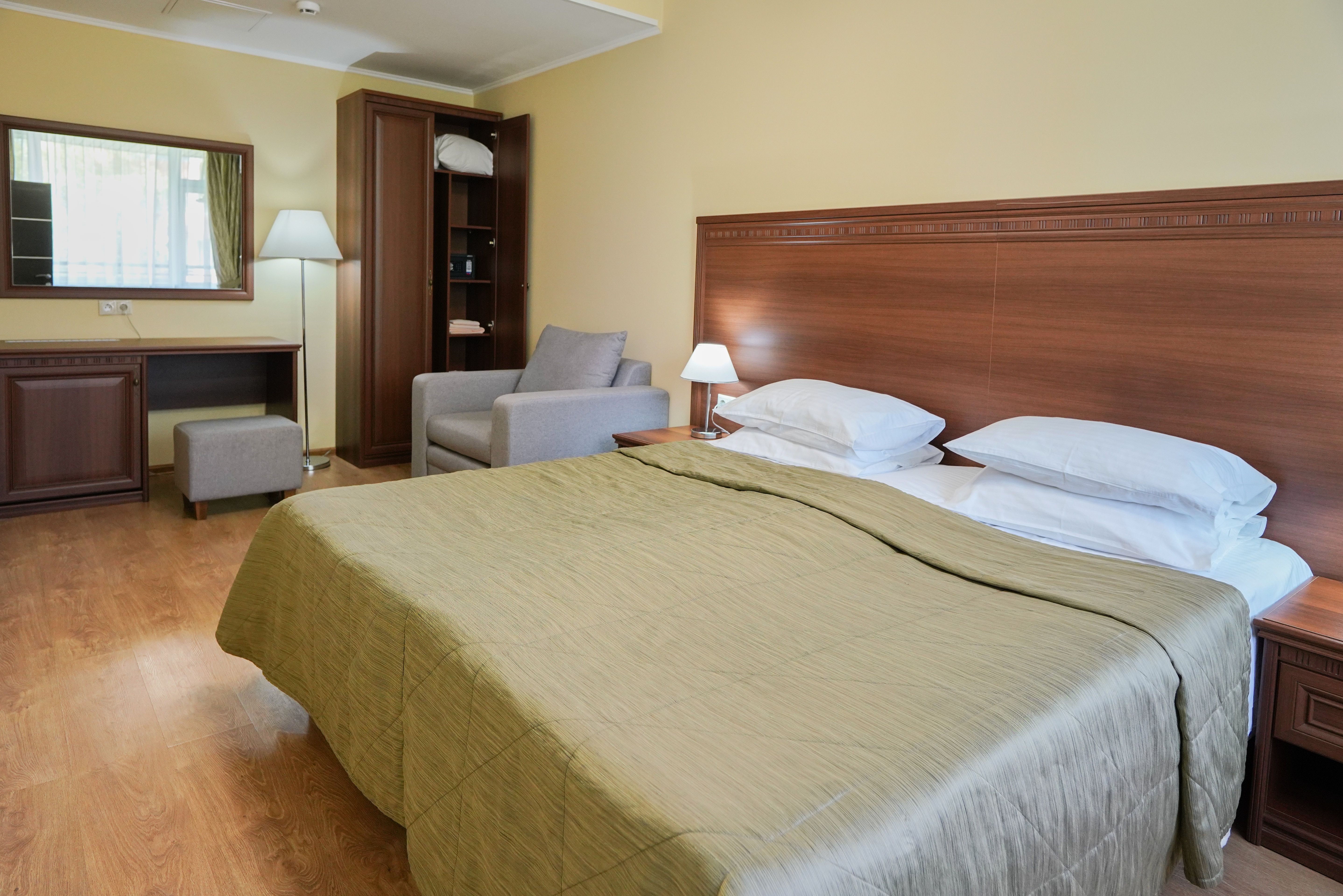 В номере: вешалка, диван раскладной, зеркало, кровать двуспальная, прикроватные тумбочки, стол, стулья, шкаф, гладильная доска, кондиционер, мини-холодильник, телевизор, телефон, утюг, чайный набор посуды, электрочайник