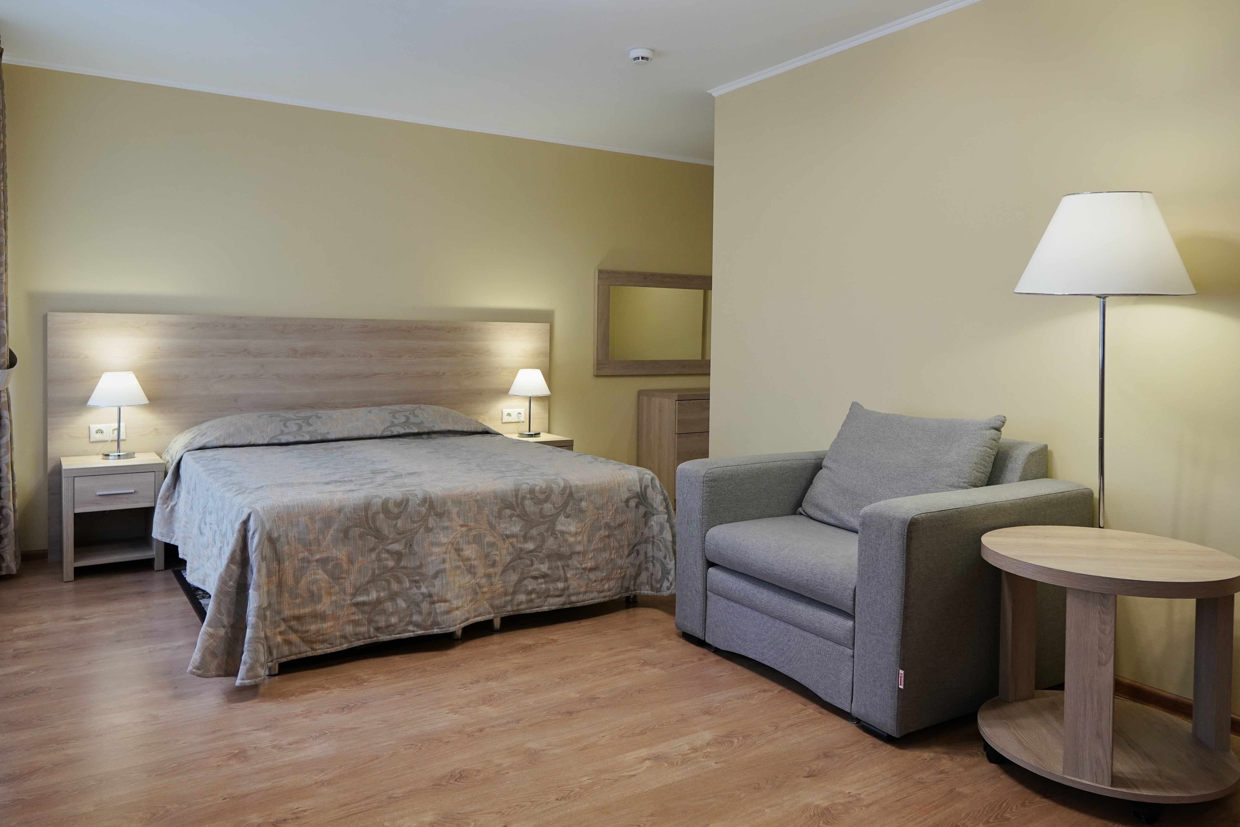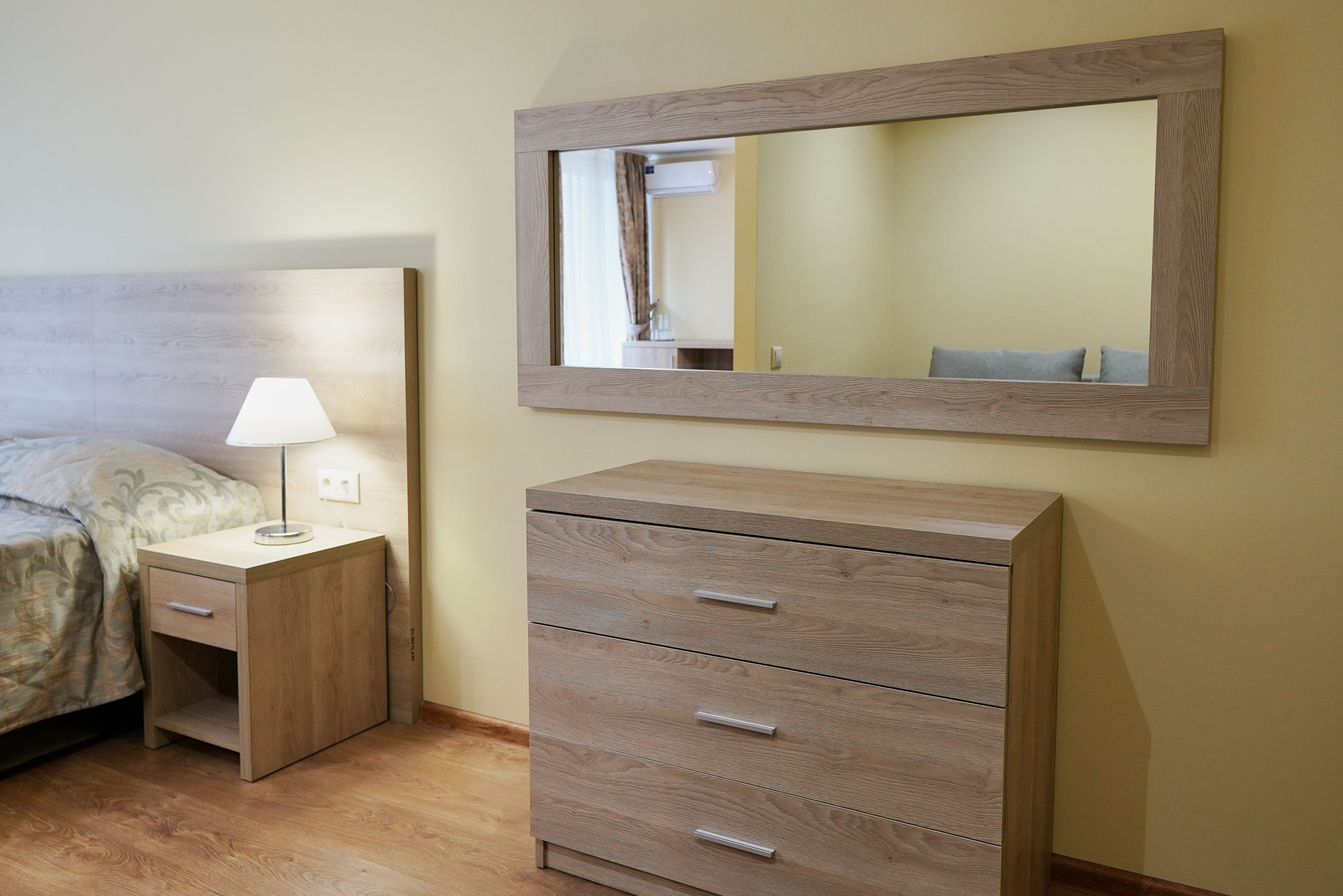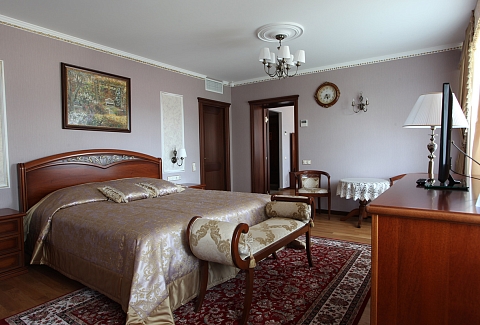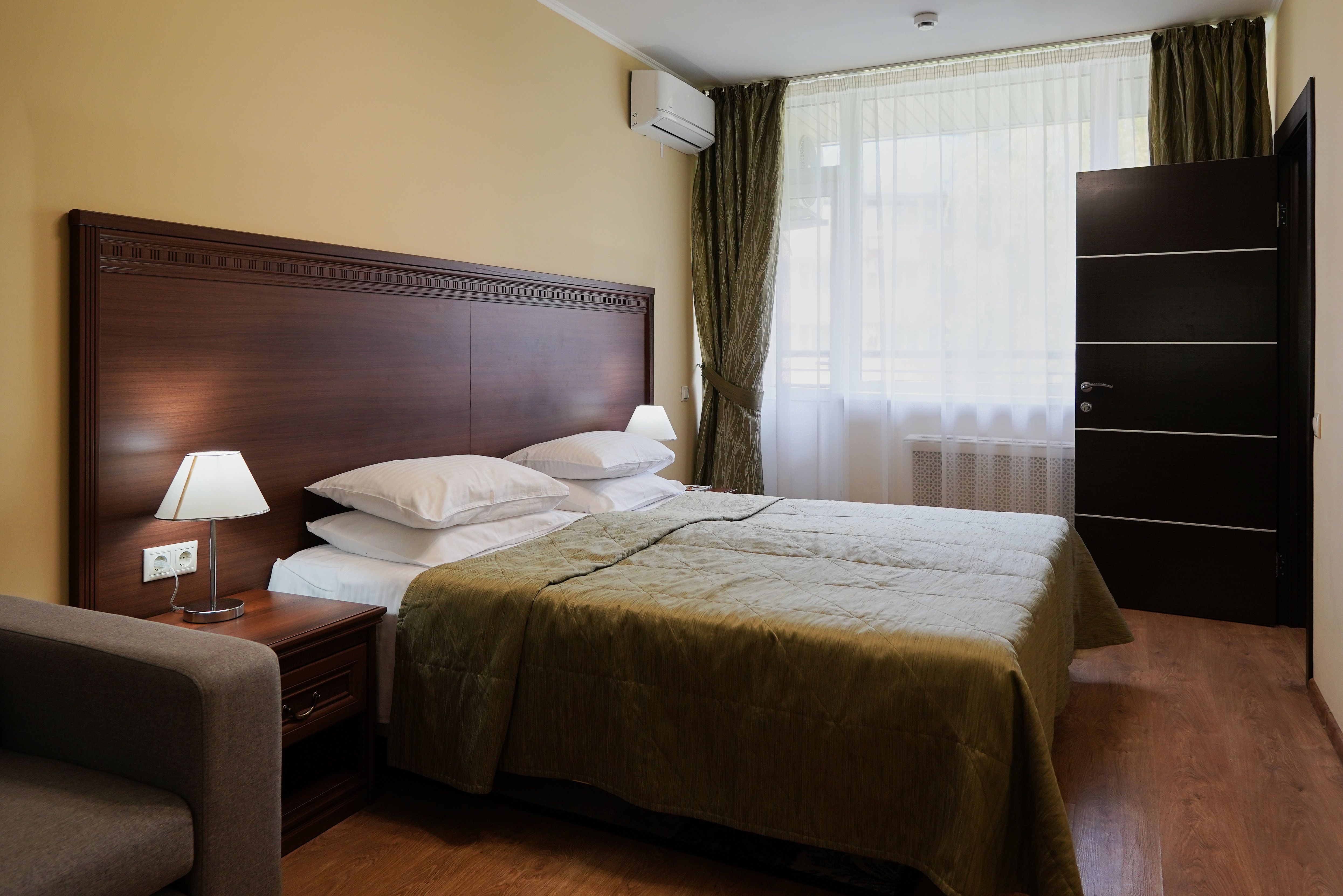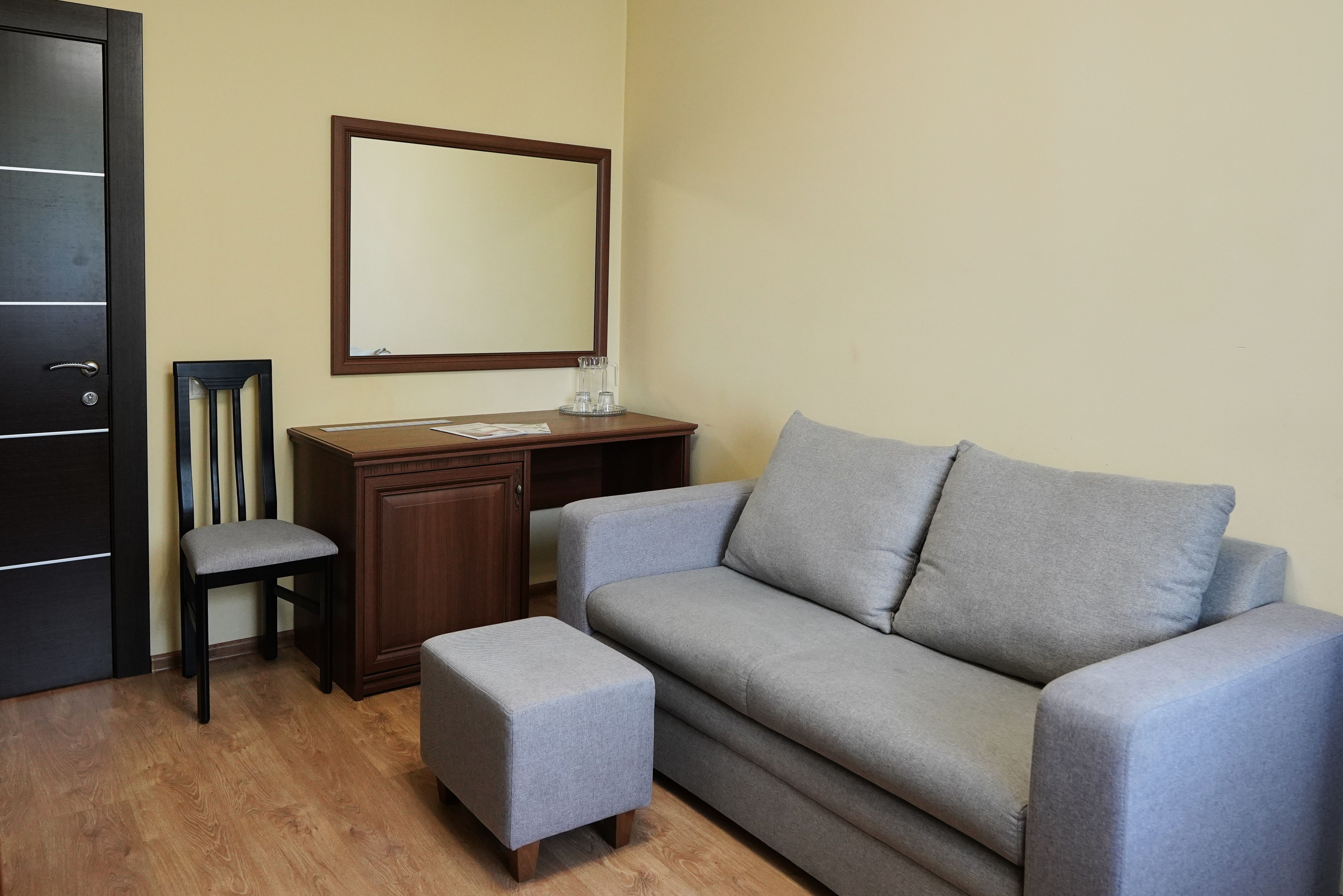 В номере: вешалка, диван раскладной, зеркало, кровать двуспальная, прикроватные тумбочки, стол, стулья, шкаф, гладильная доска, кондиционер, мини-холодильник, телевизор, телефон, утюг, чайный набор посуды, электрочайник
