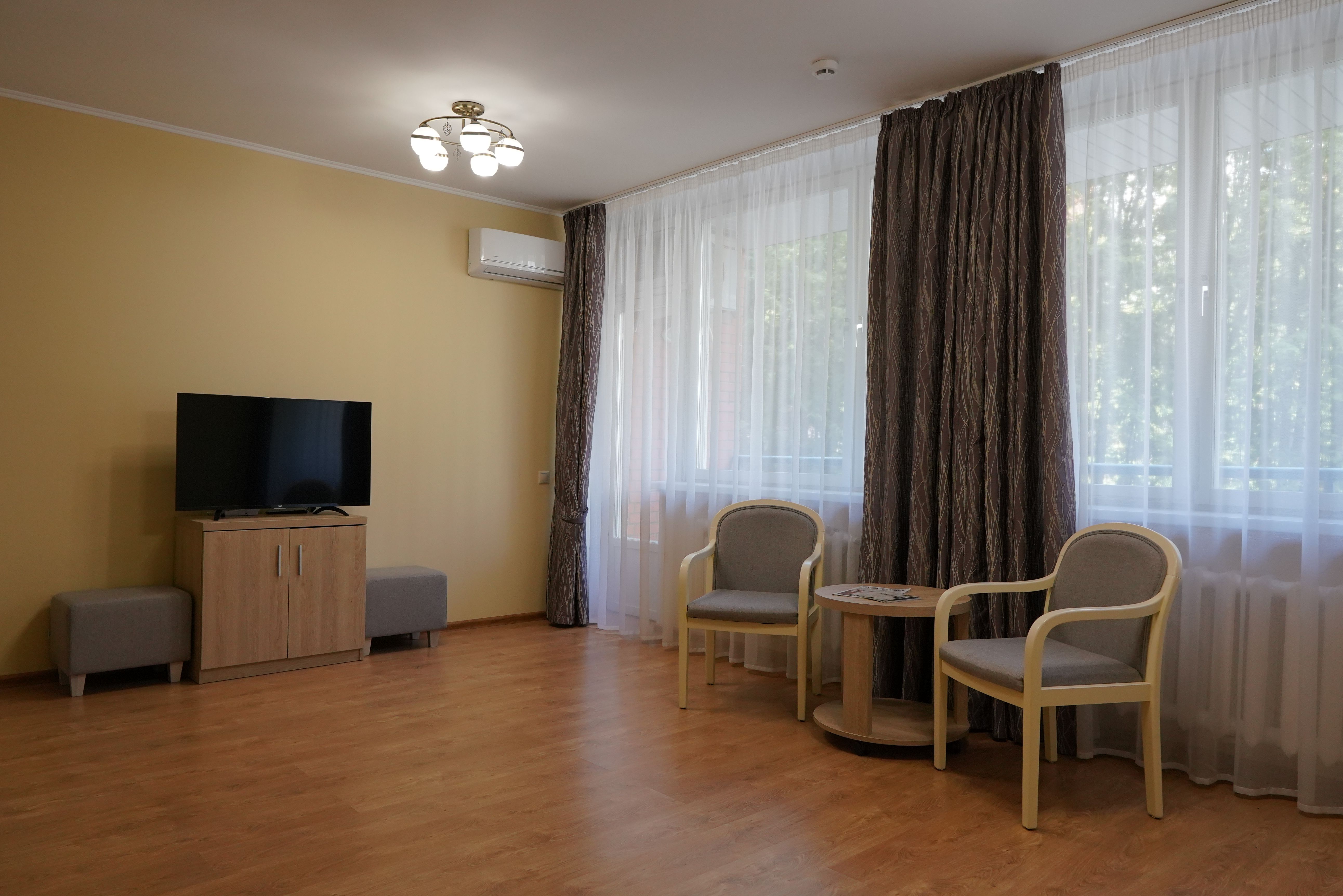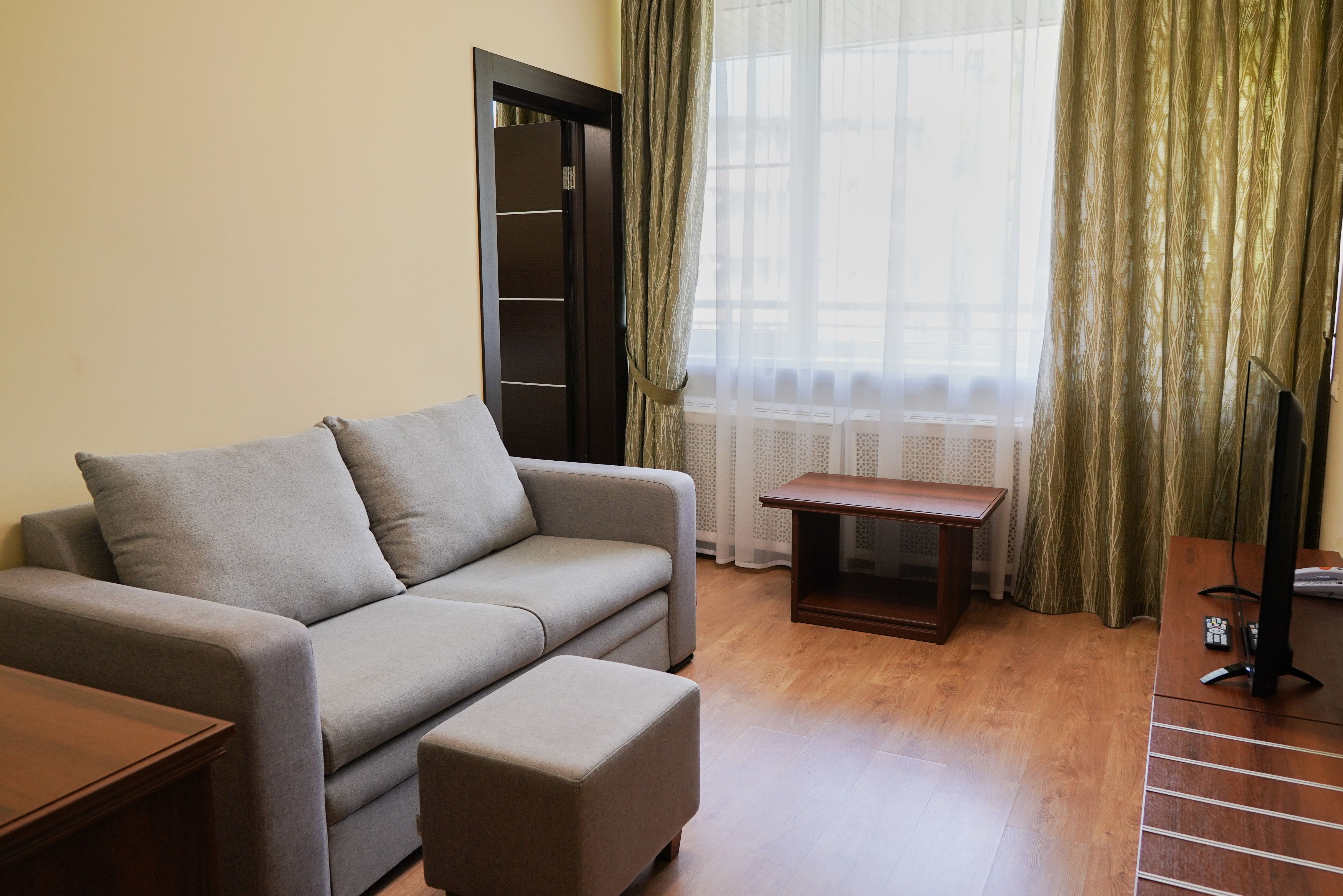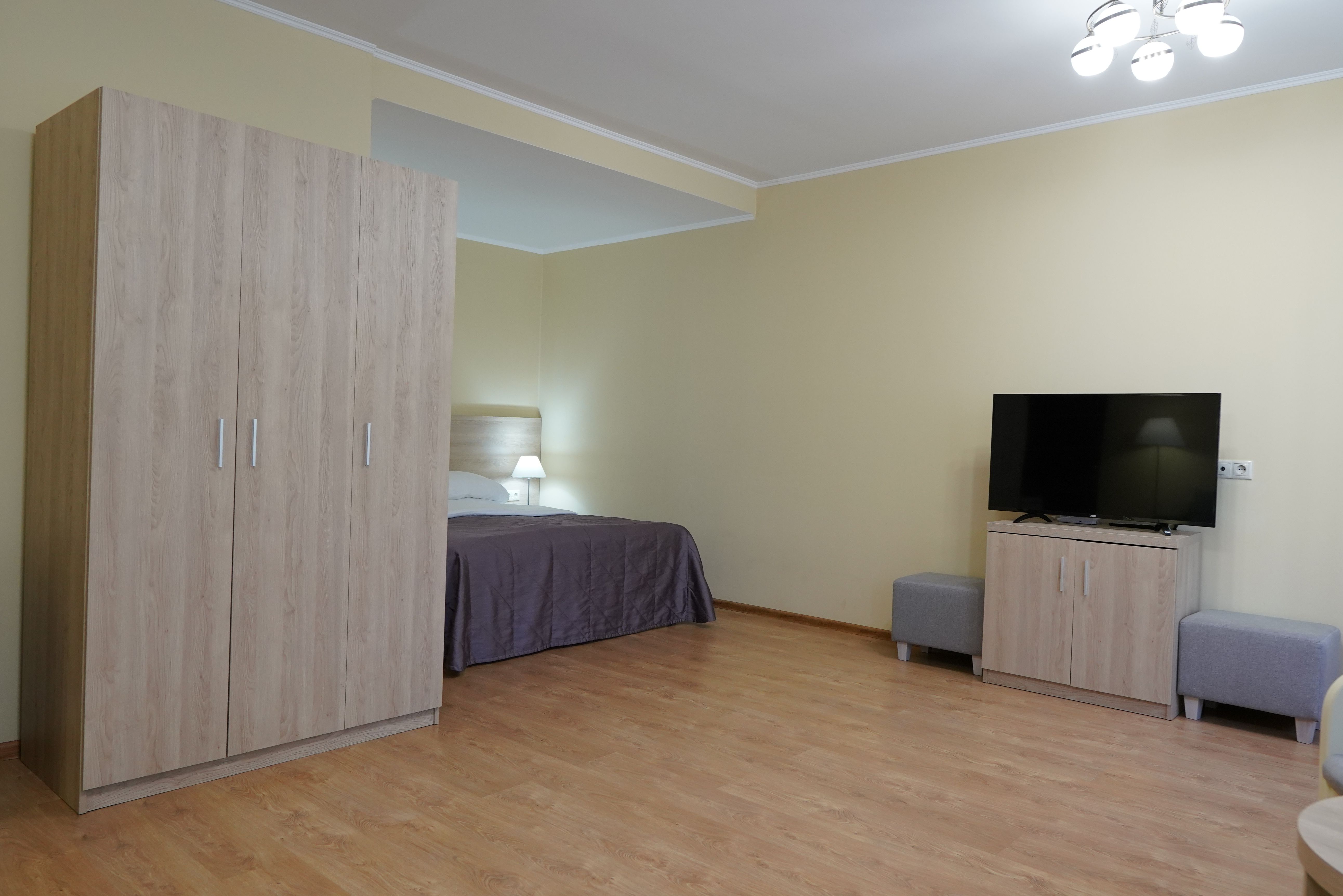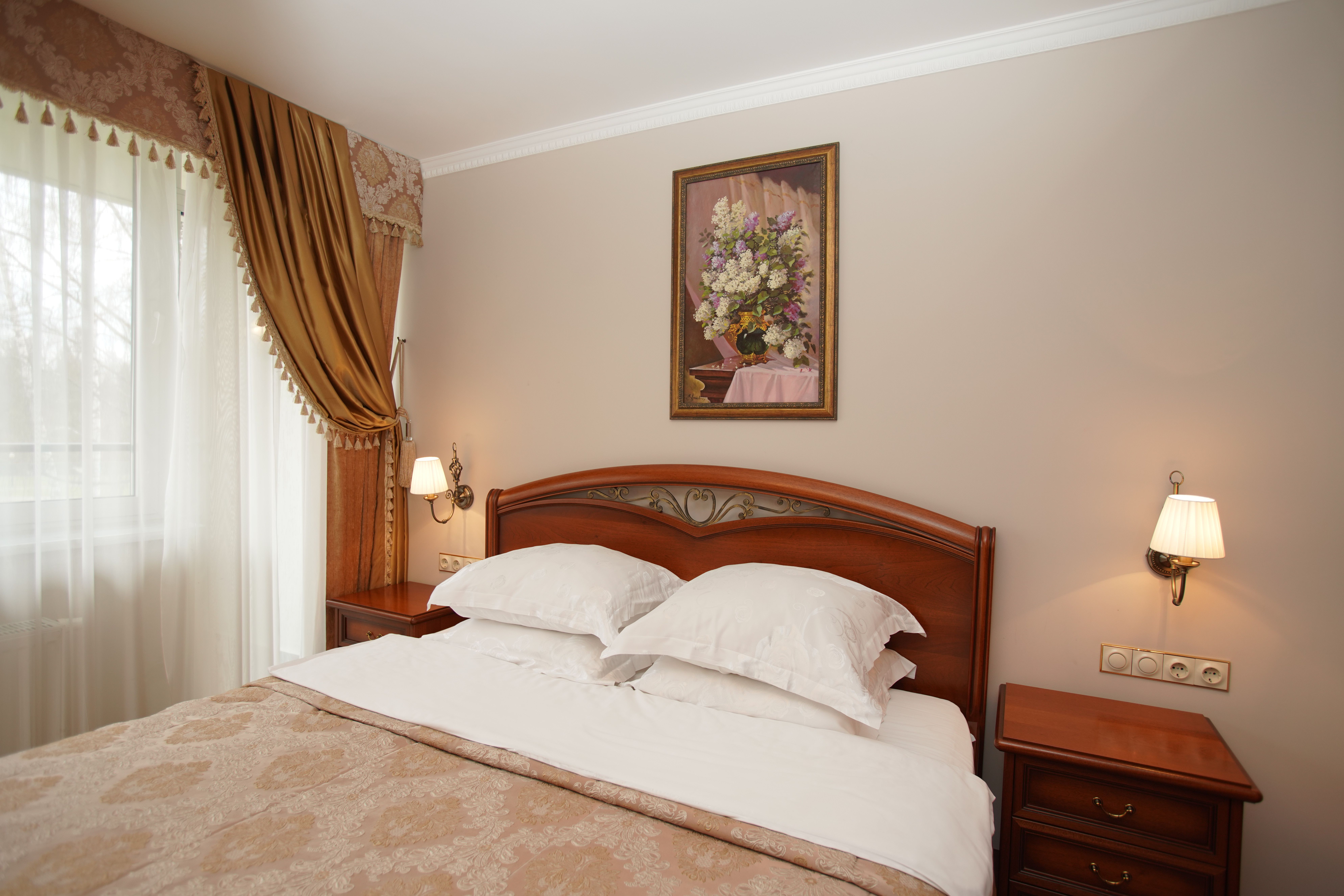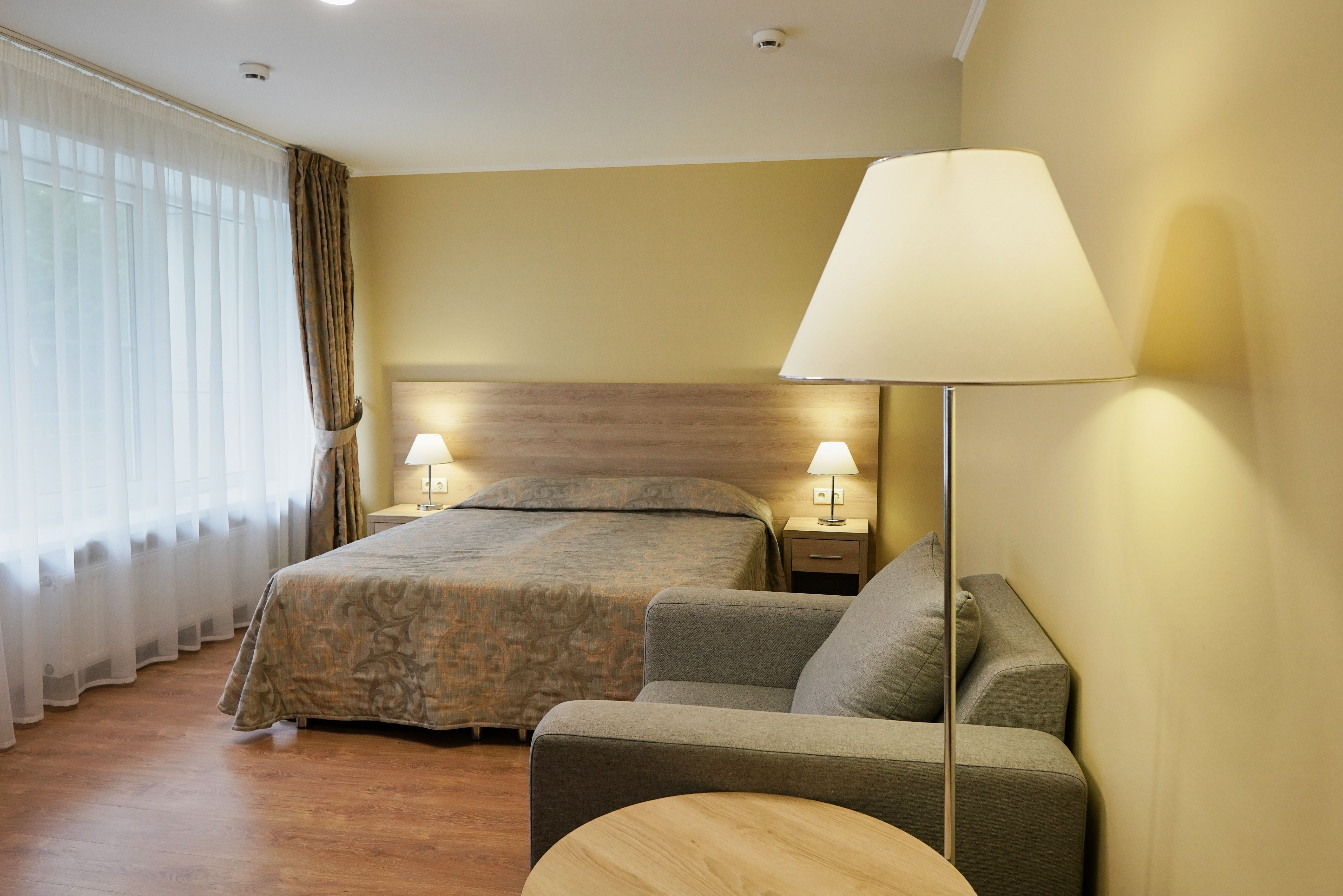 В номере: вешалка, диван раскладной, зеркало, кровать двуспальная, прикроватные тумбочки, стол, стулья, шкаф, гладильная доска, кондиционер, мини-холодильник, телевизор, телефон, утюг, чайный набор посуды, электрочайник