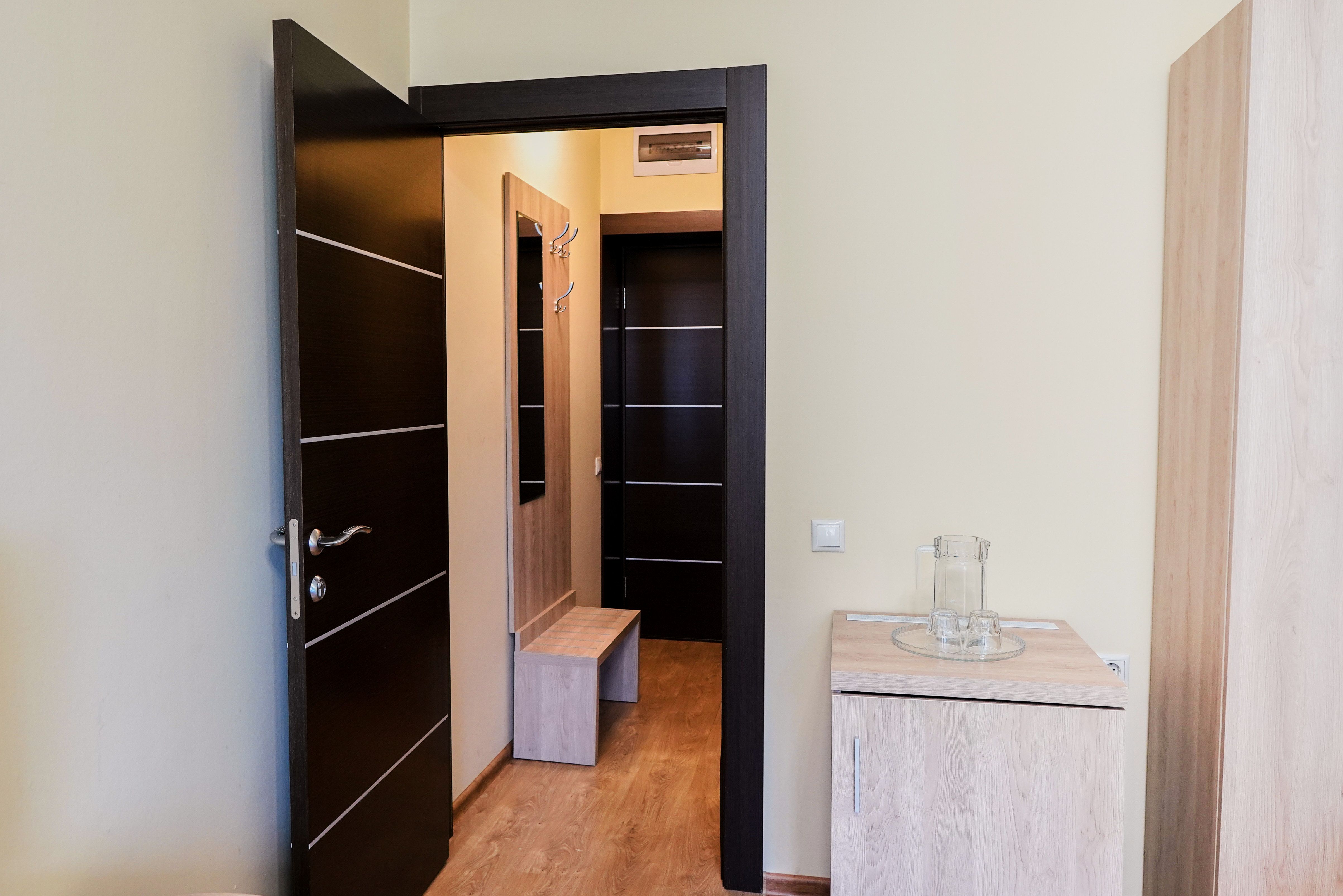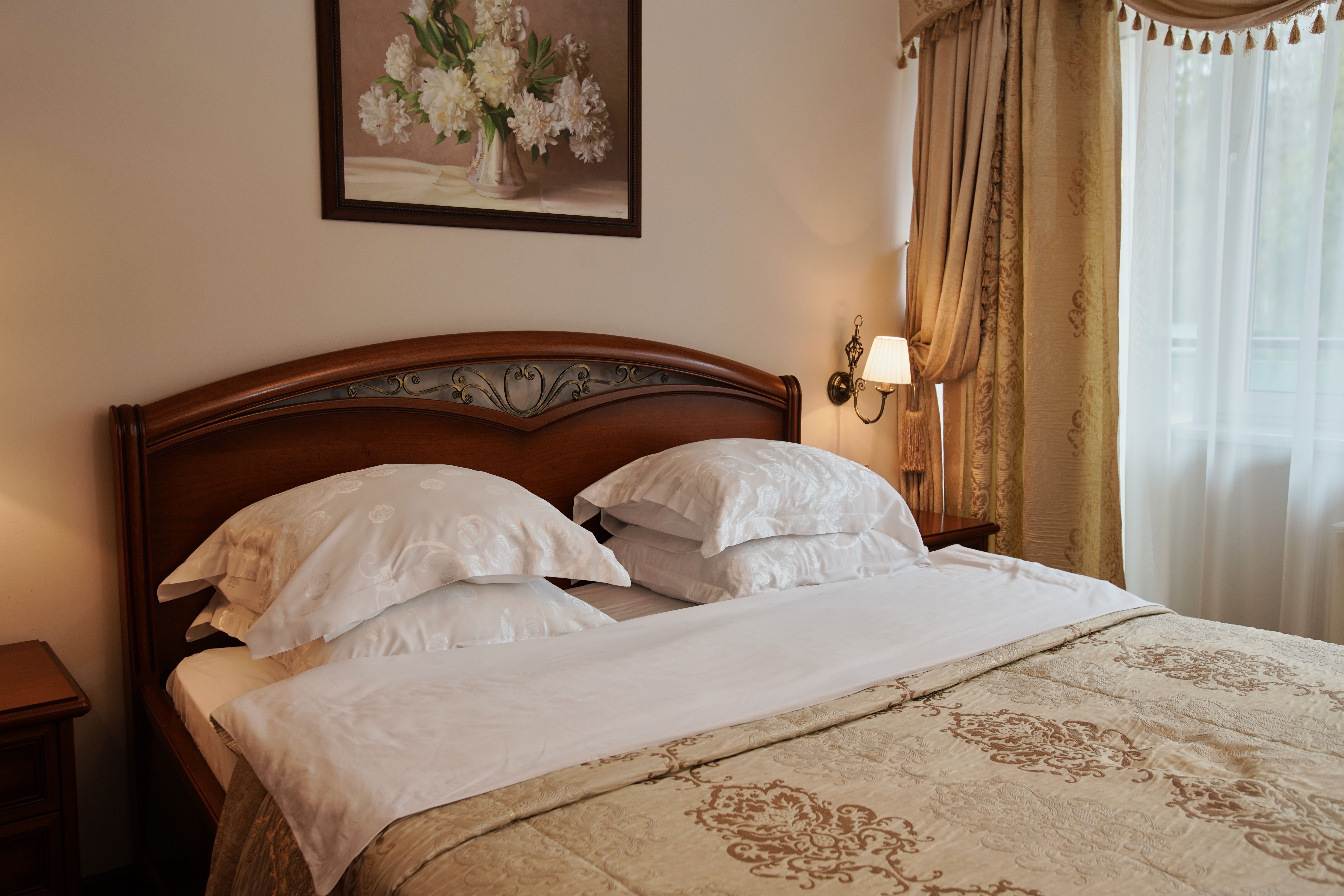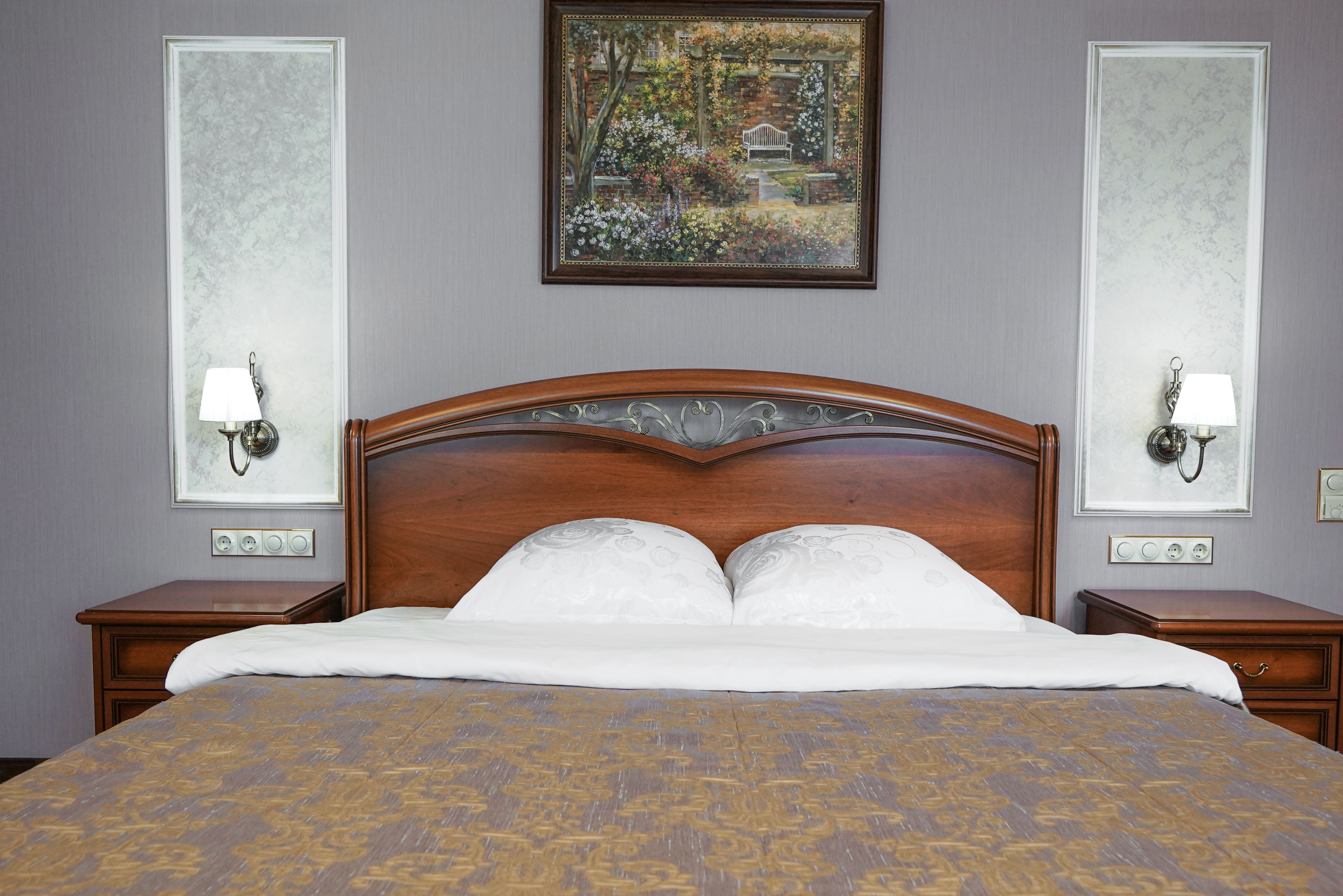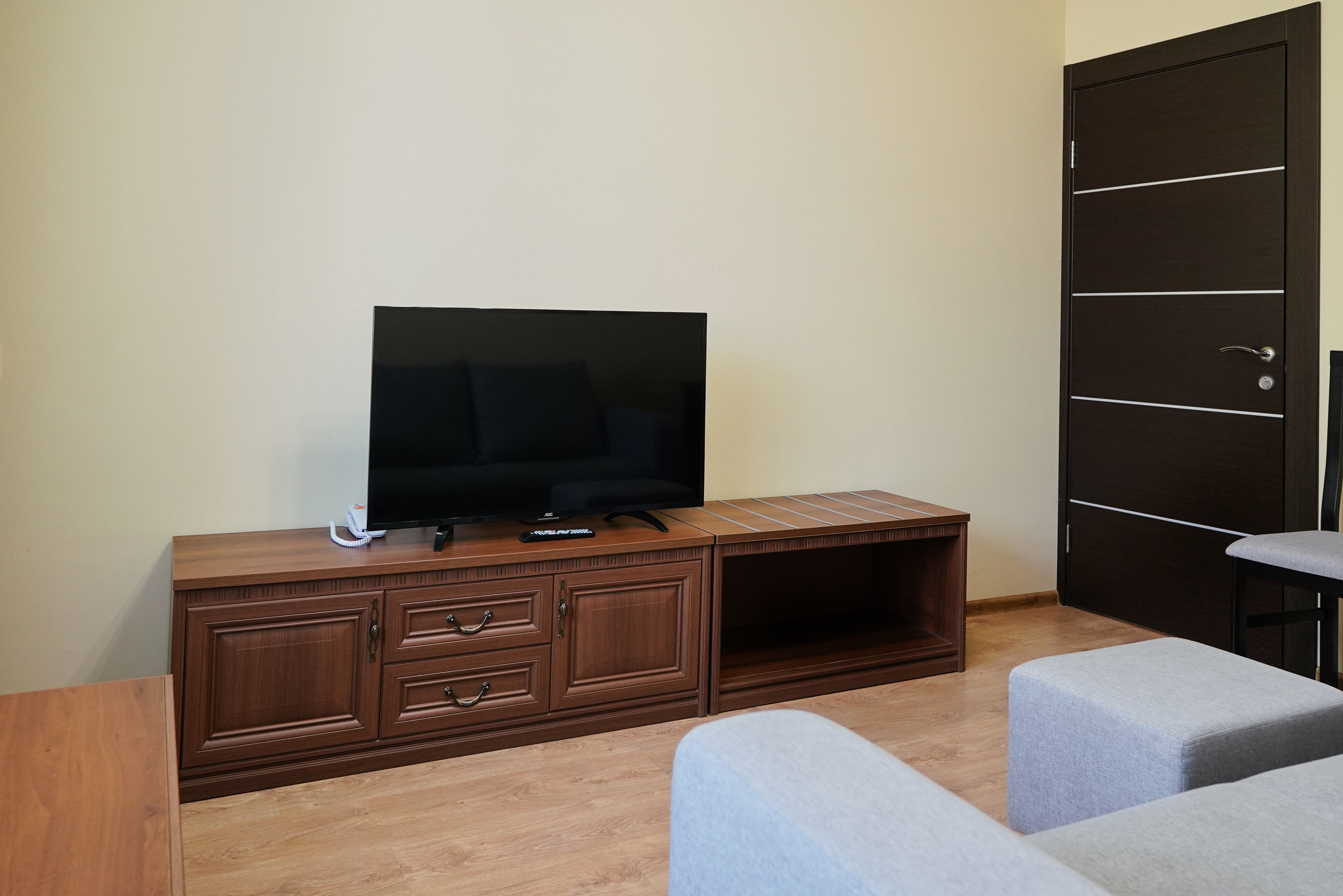 В номере: вешалка, диван раскладной, зеркало, кровать двуспальная, прикроватные тумбочки, стол, стулья, шкаф, гладильная доска, кондиционер, мини-холодильник, телевизор, телефон, утюг, чайный набор посуды, электрочайник