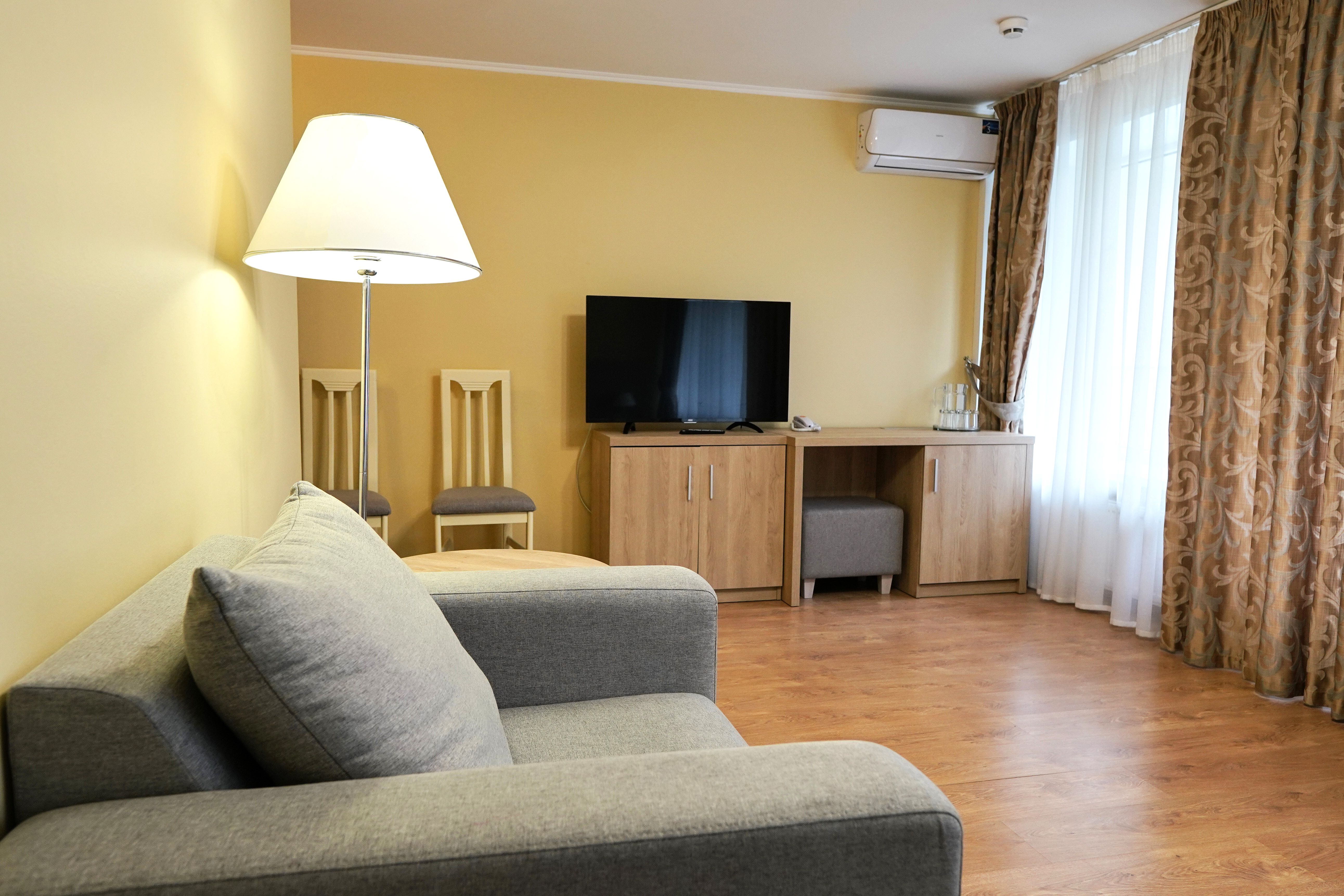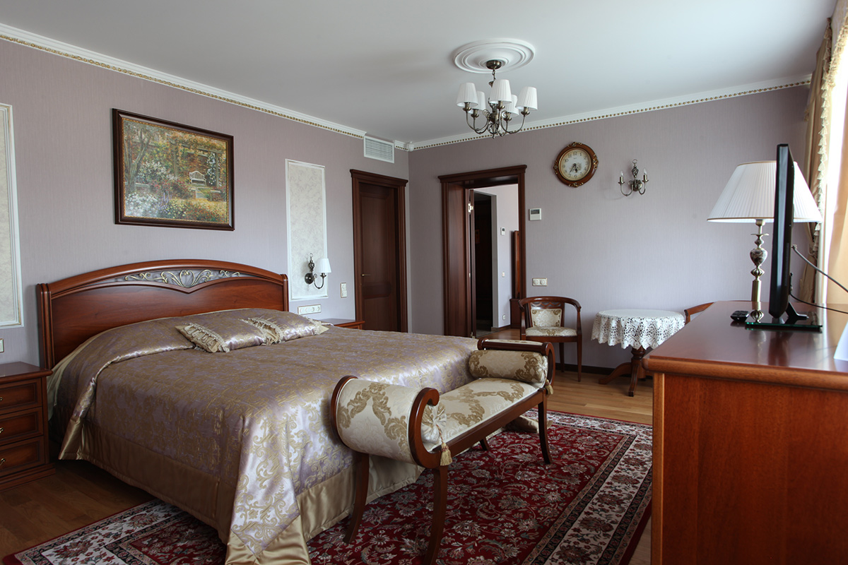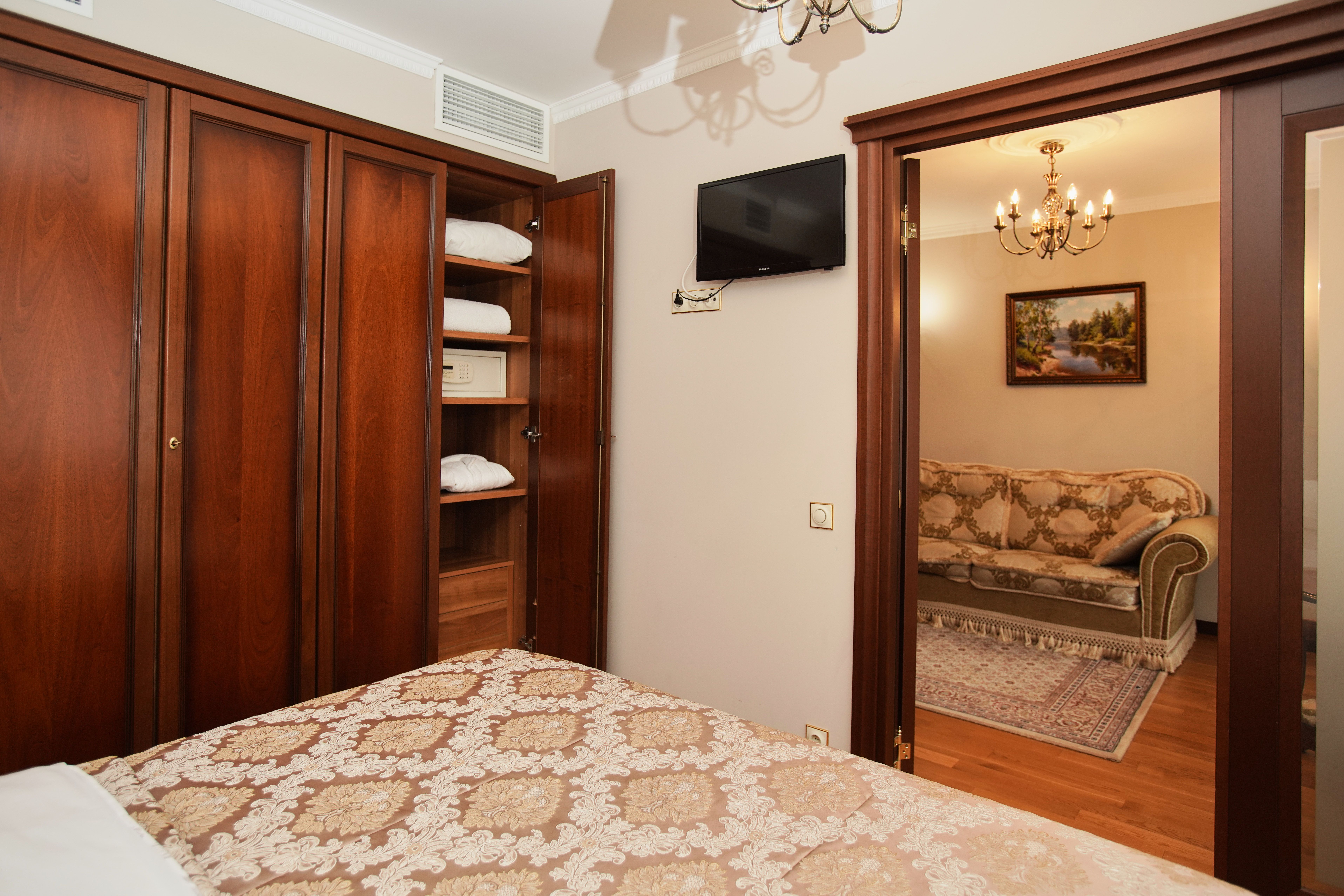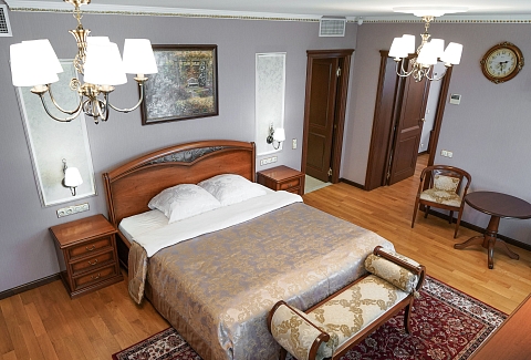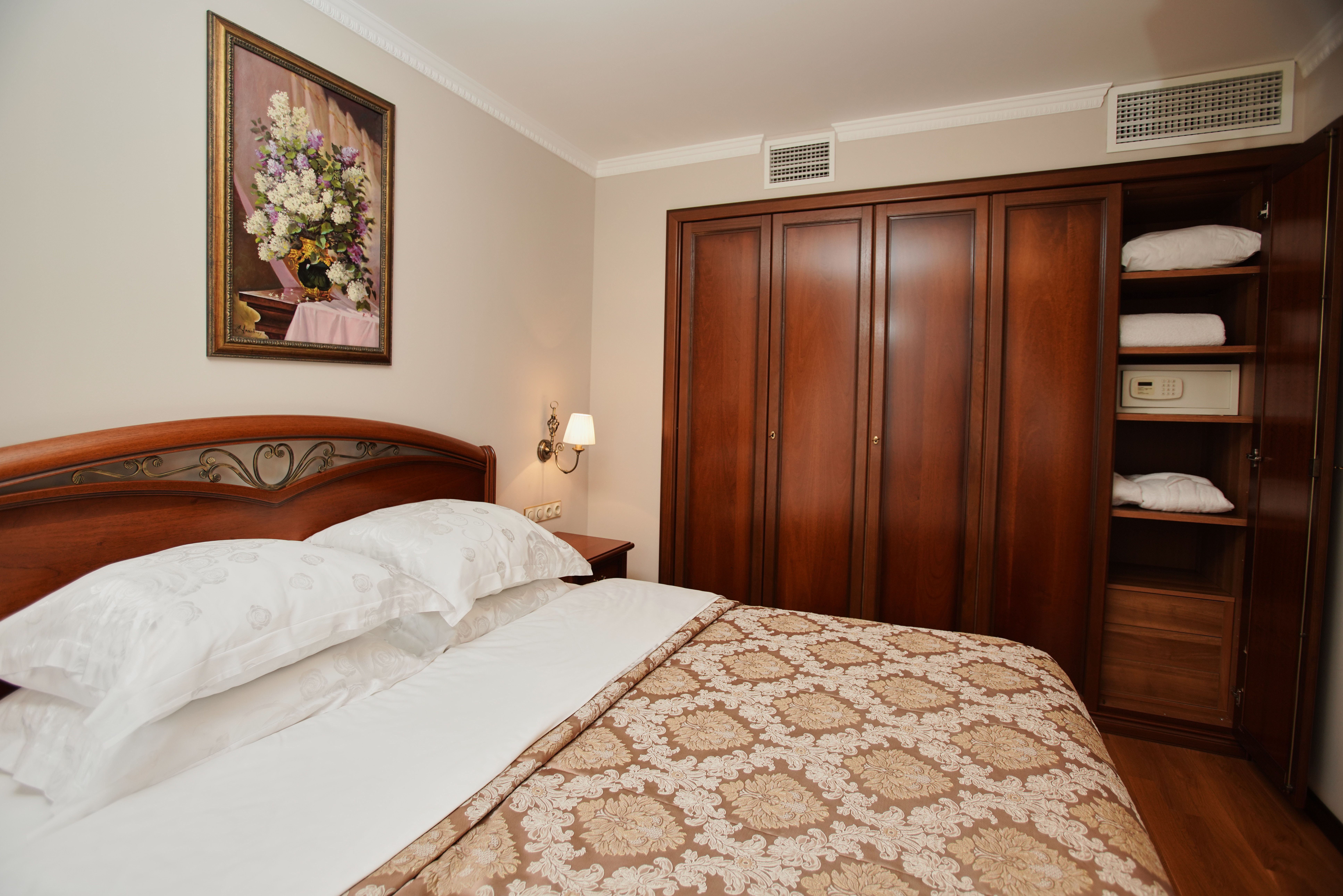 В номере: вешалка, диван раскладной, зеркало, кровать двуспальная, набор мягкой мебели, прикроватные тумбочки, стол, стулья, шкаф, гладильная доска, кондиционер, мини-холодильник, набор посуды, сейф, телевизор, телефон, утюг, чайный набор посуды, электрочайник
