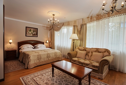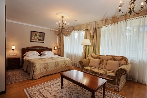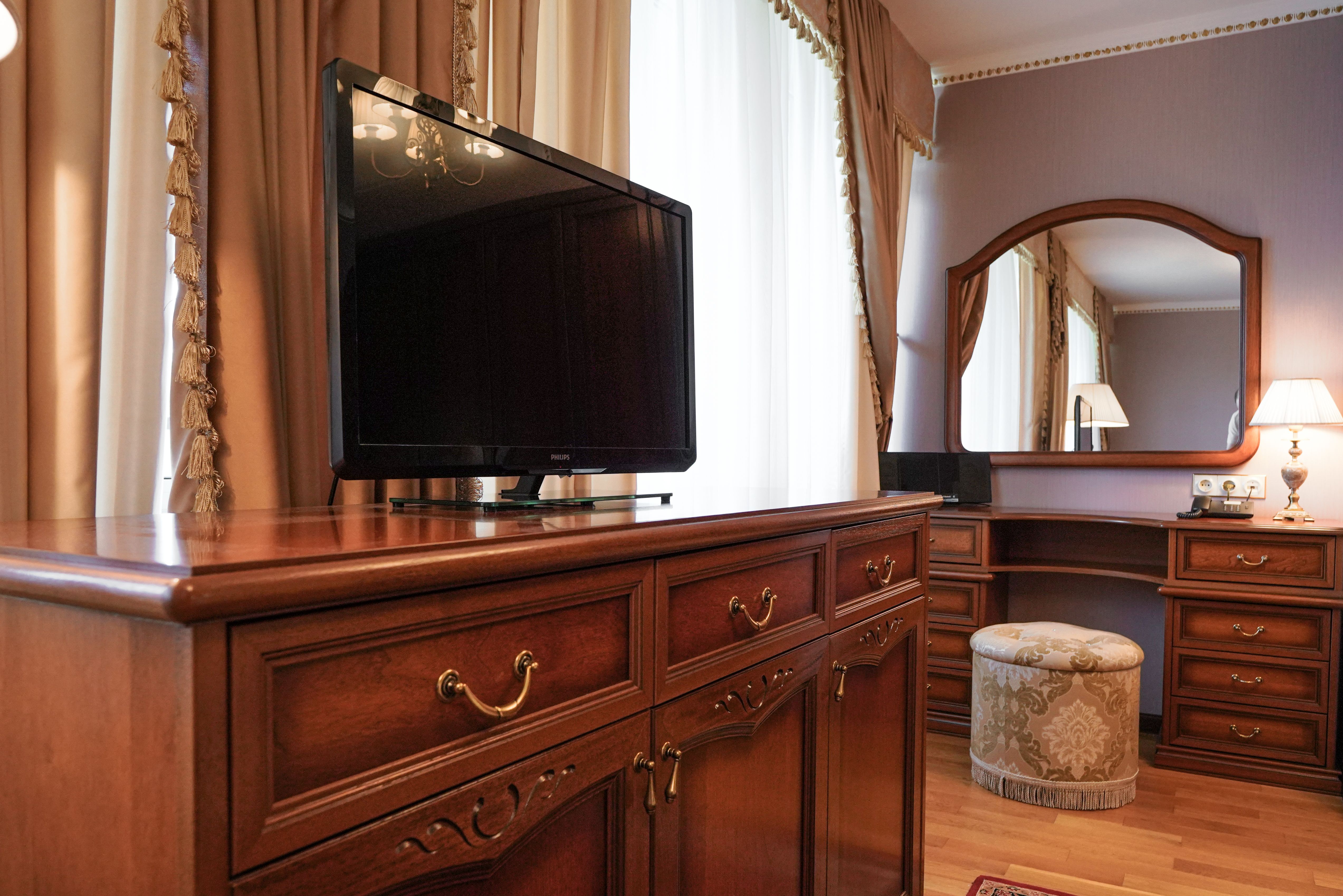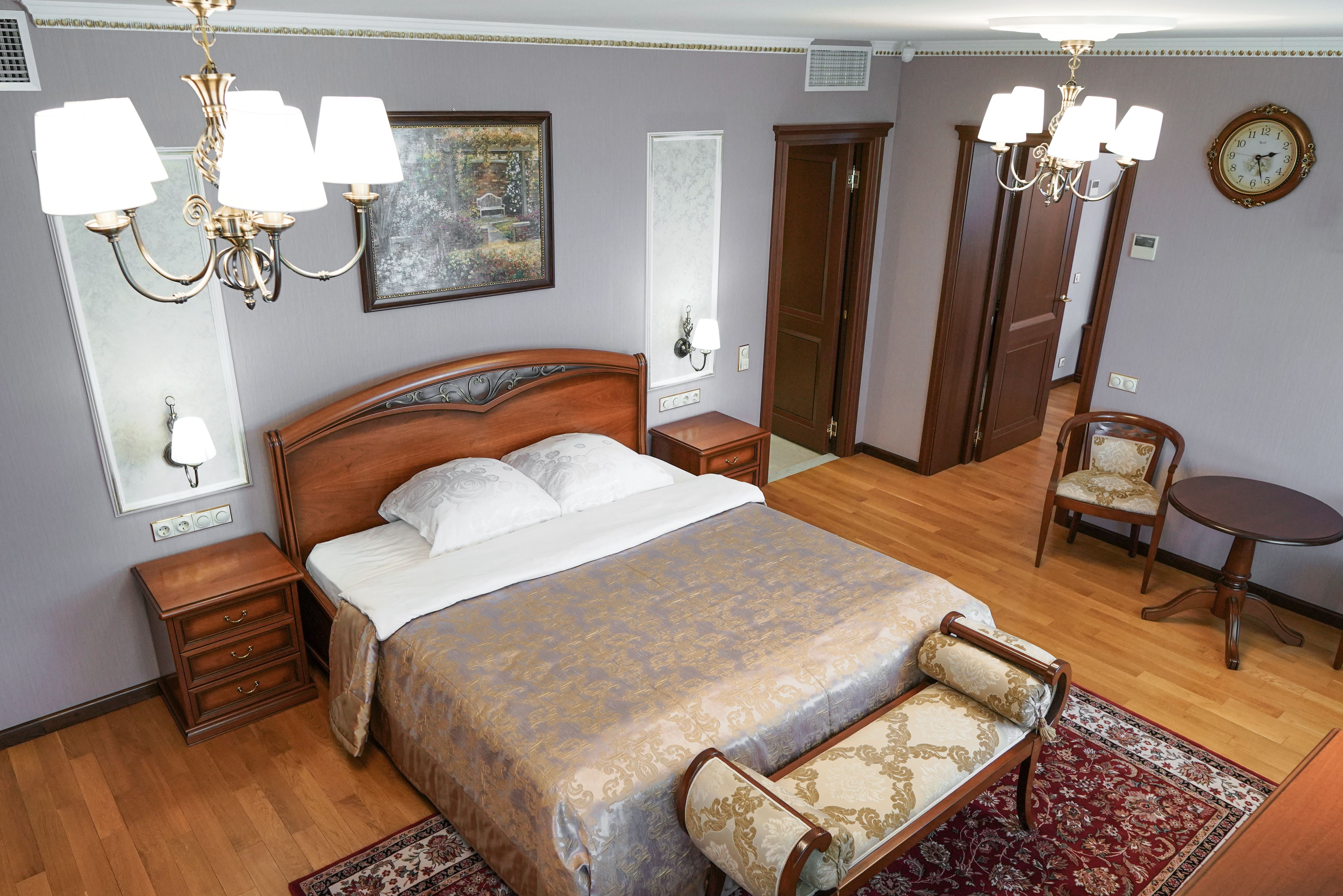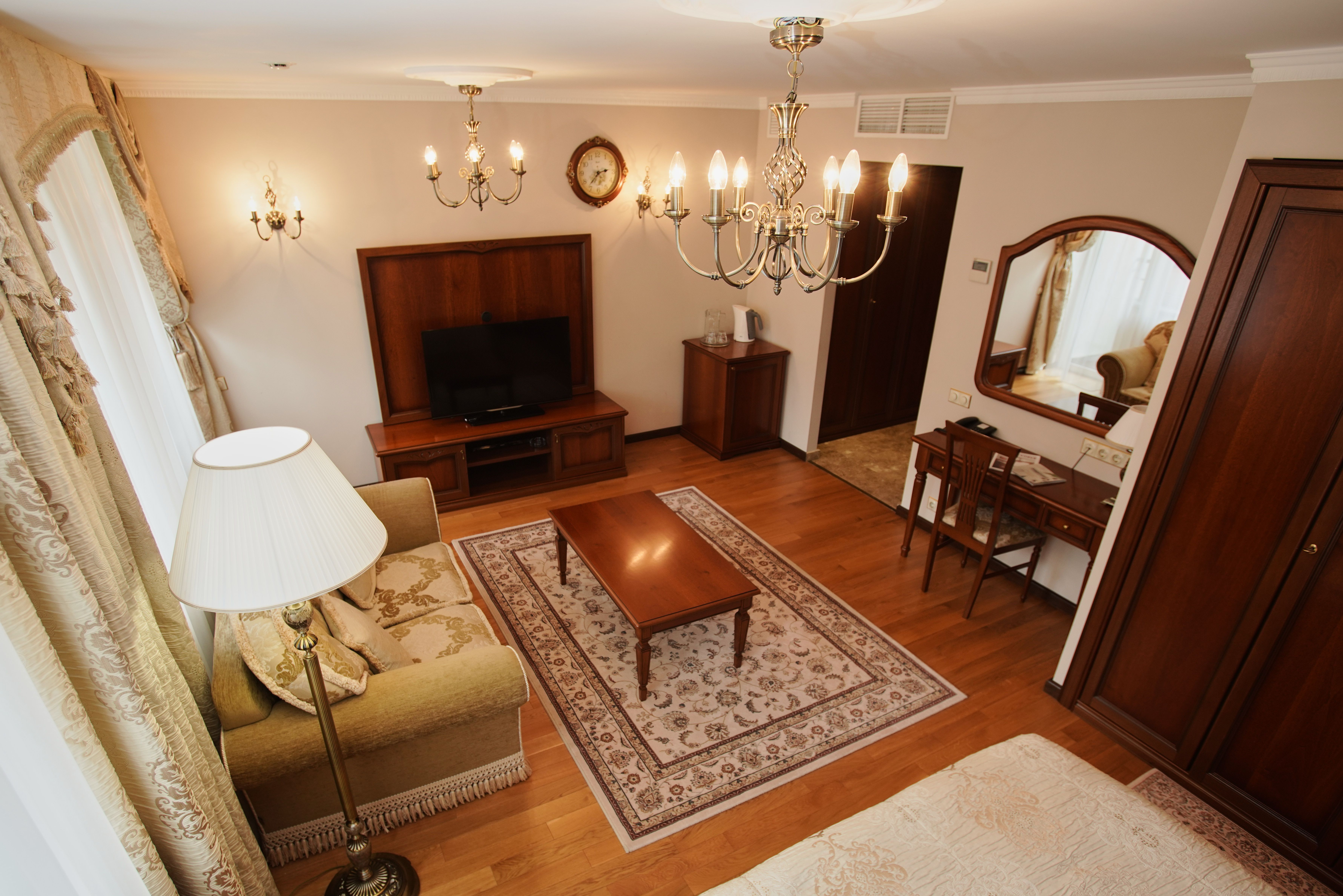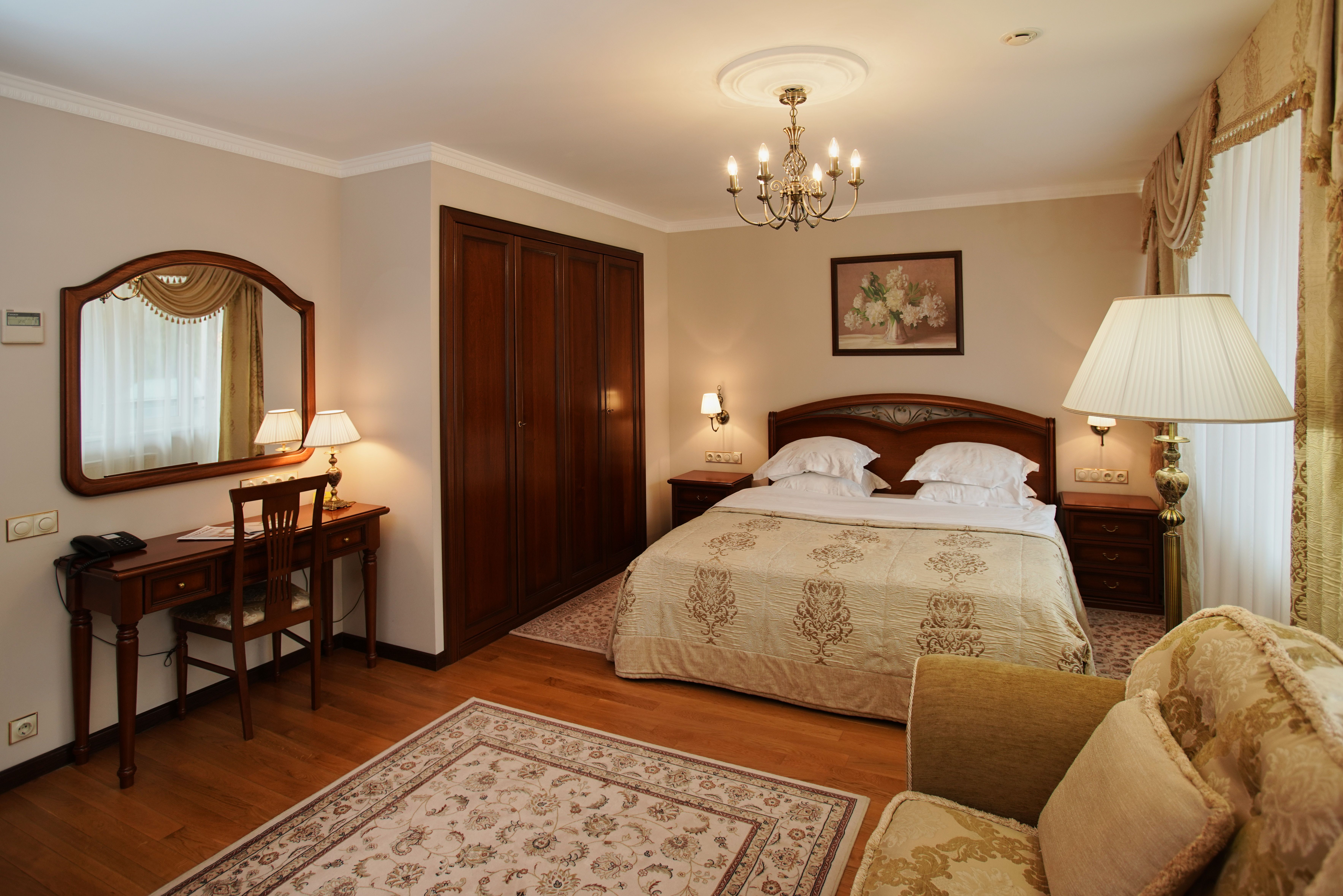 В номере: вешалка, диван раскладной, зеркало, кровать двуспальная, набор мягкой мебели, прикроватные тумбочки, стол, стулья, шкаф, гладильная доска, кондиционер, мини-холодильник, набор посуды, сейф, телевизор, телефон, утюг, чайный набор посуды, электрочайник