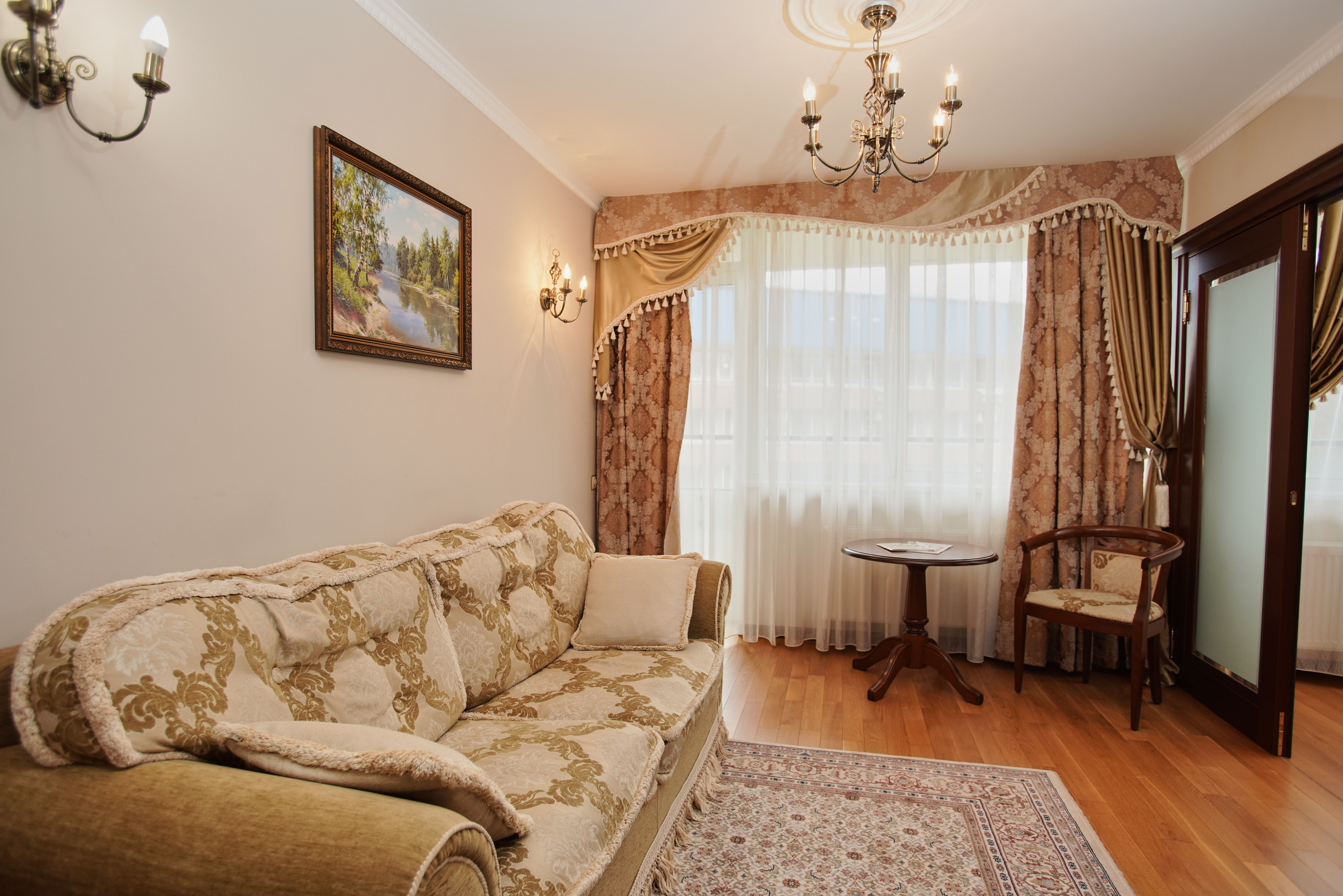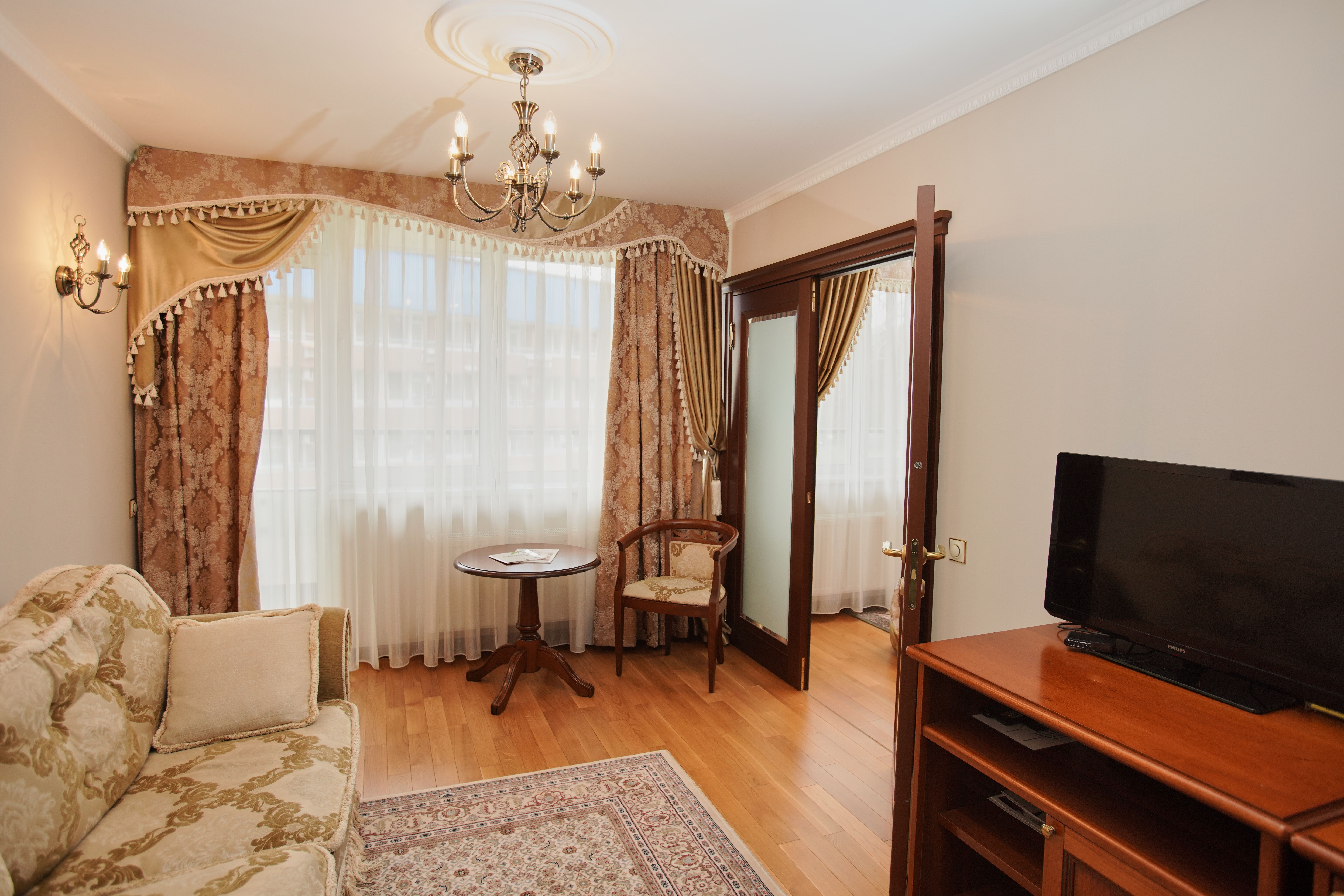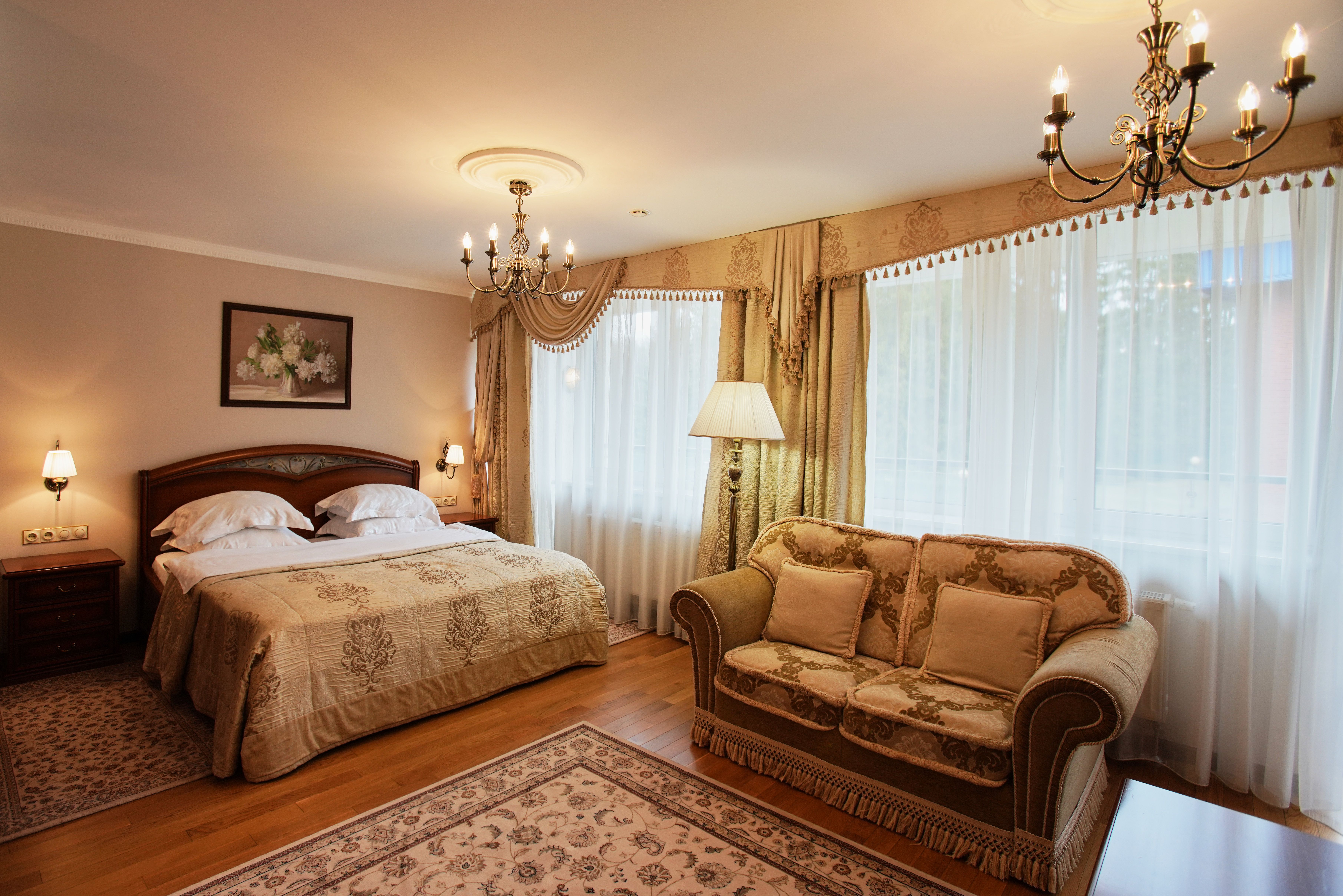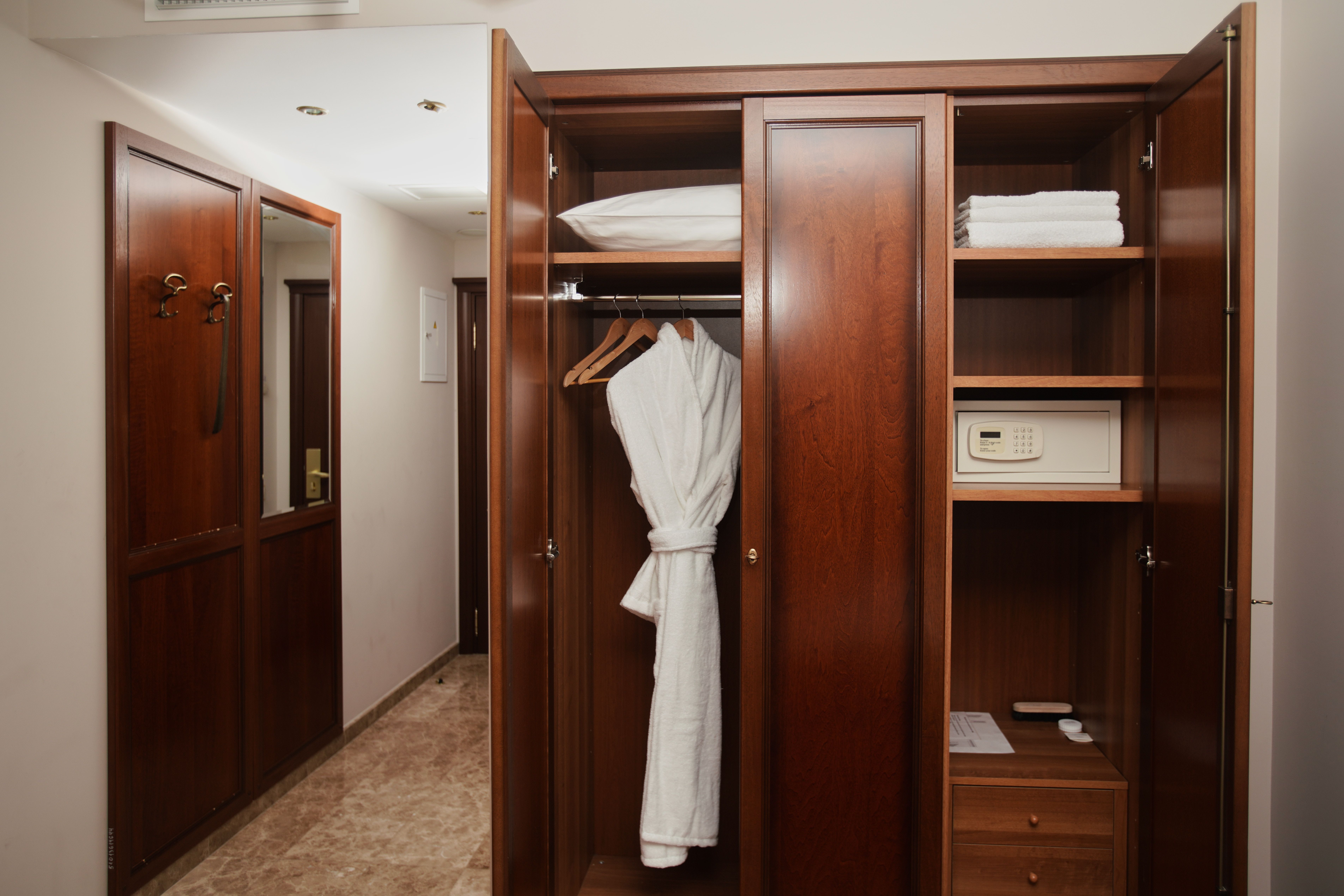 В номере: вешалка, диван раскладной, зеркало, кровать двуспальная, набор мягкой мебели, прикроватные тумбочки, стол, стулья, шкаф, гладильная доска, кондиционер, мини-холодильник, набор посуды, сейф, телевизор, телефон, утюг, чайный набор посуды, электрочайник