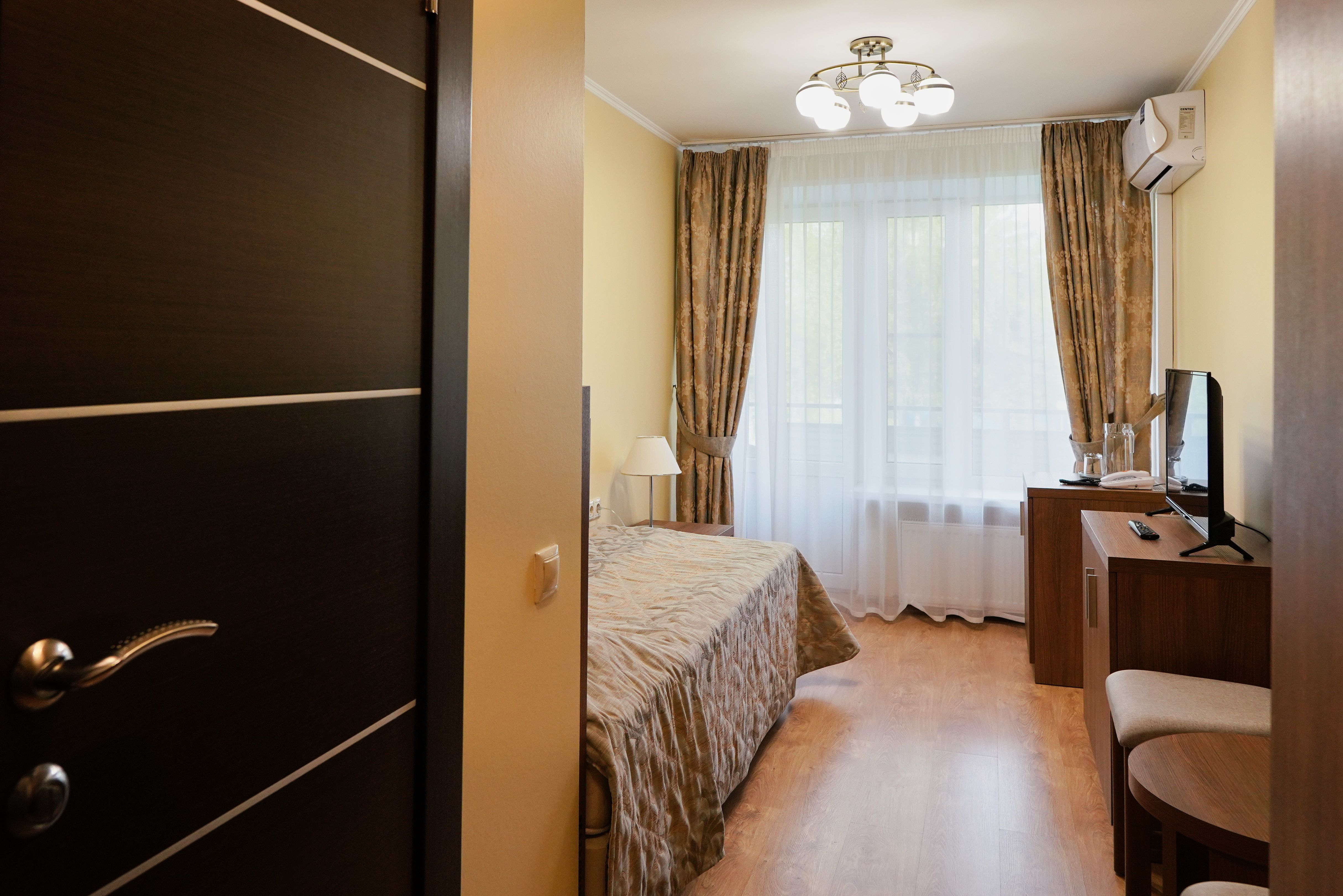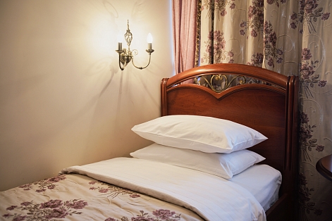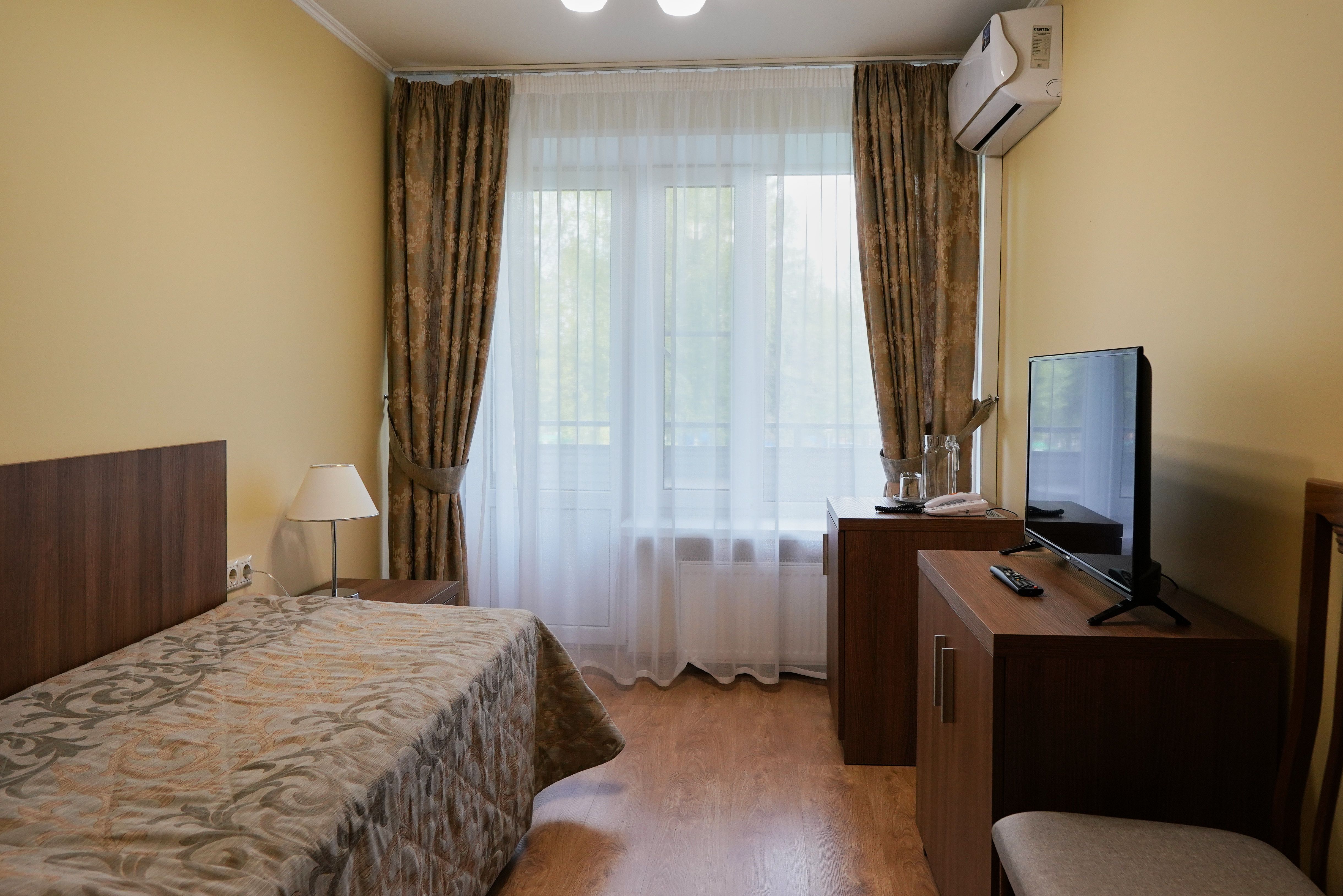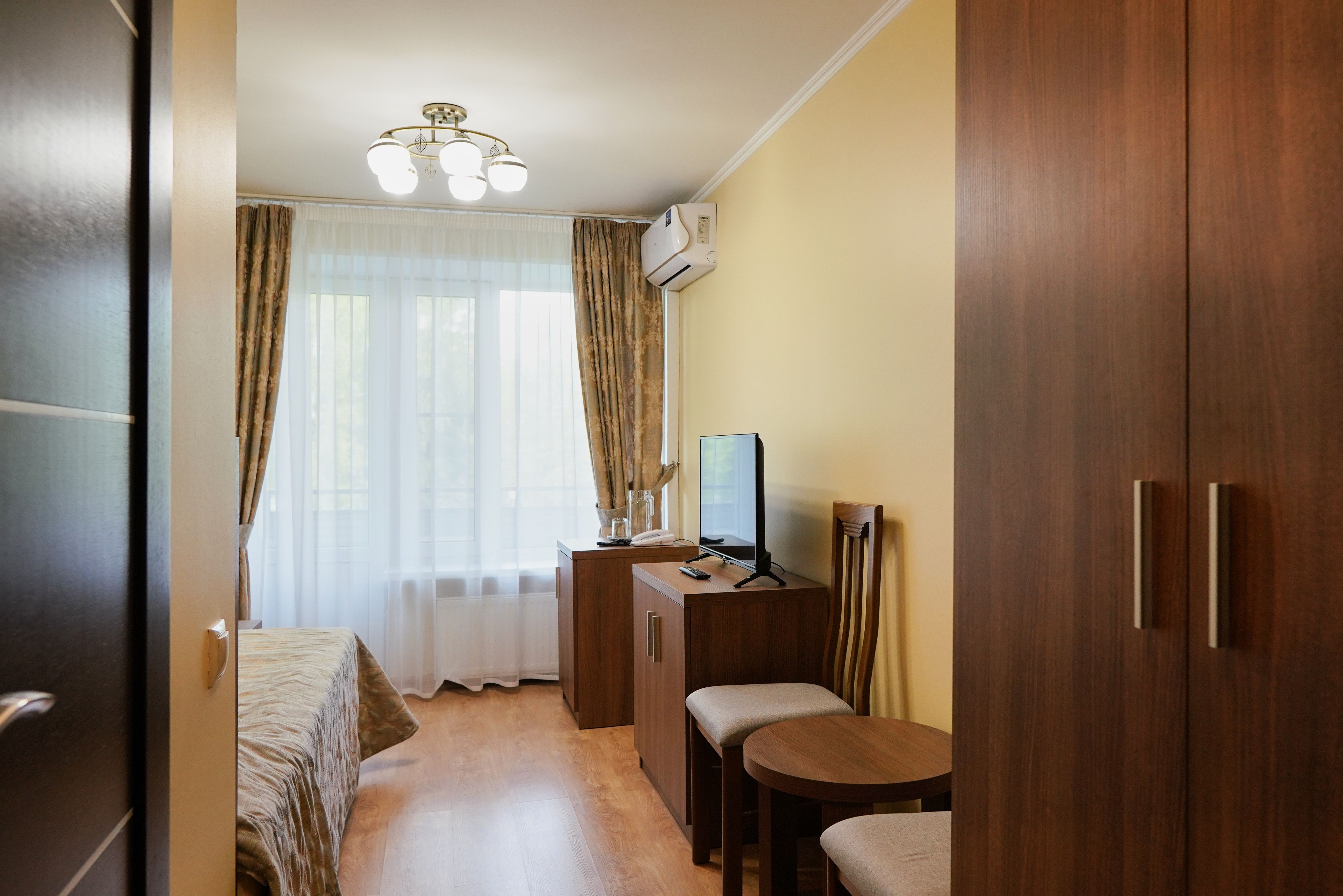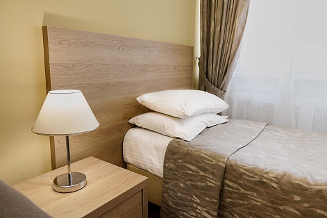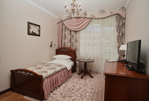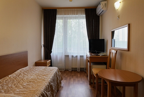 В номере: вешалка, зеркало, кровать односпальная, прикроватная тумбочка, стол, стул, шкаф, кондиционер, мини-холодильник, сейф, телевизор, телефон, чайный набор посуды, электрочайник