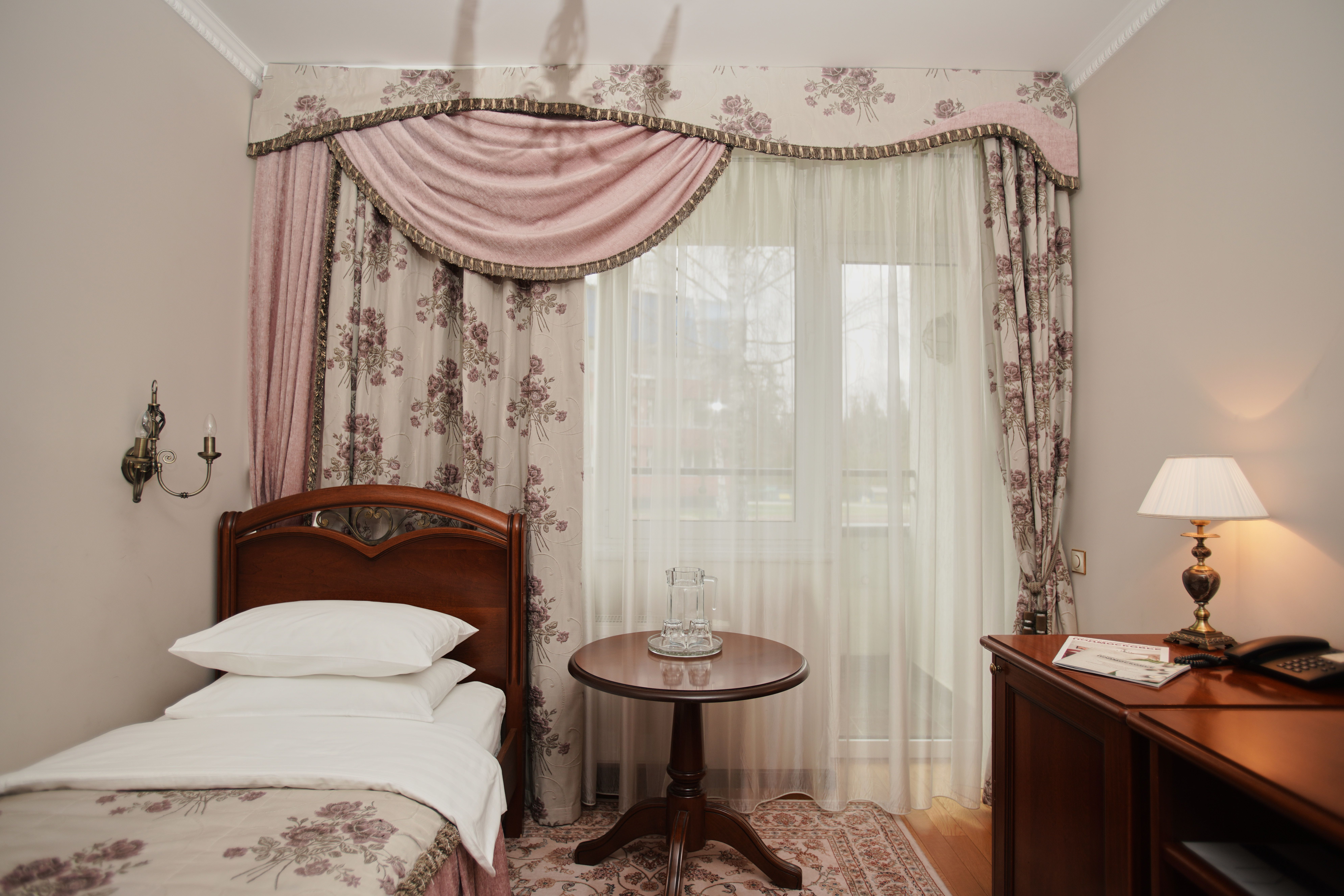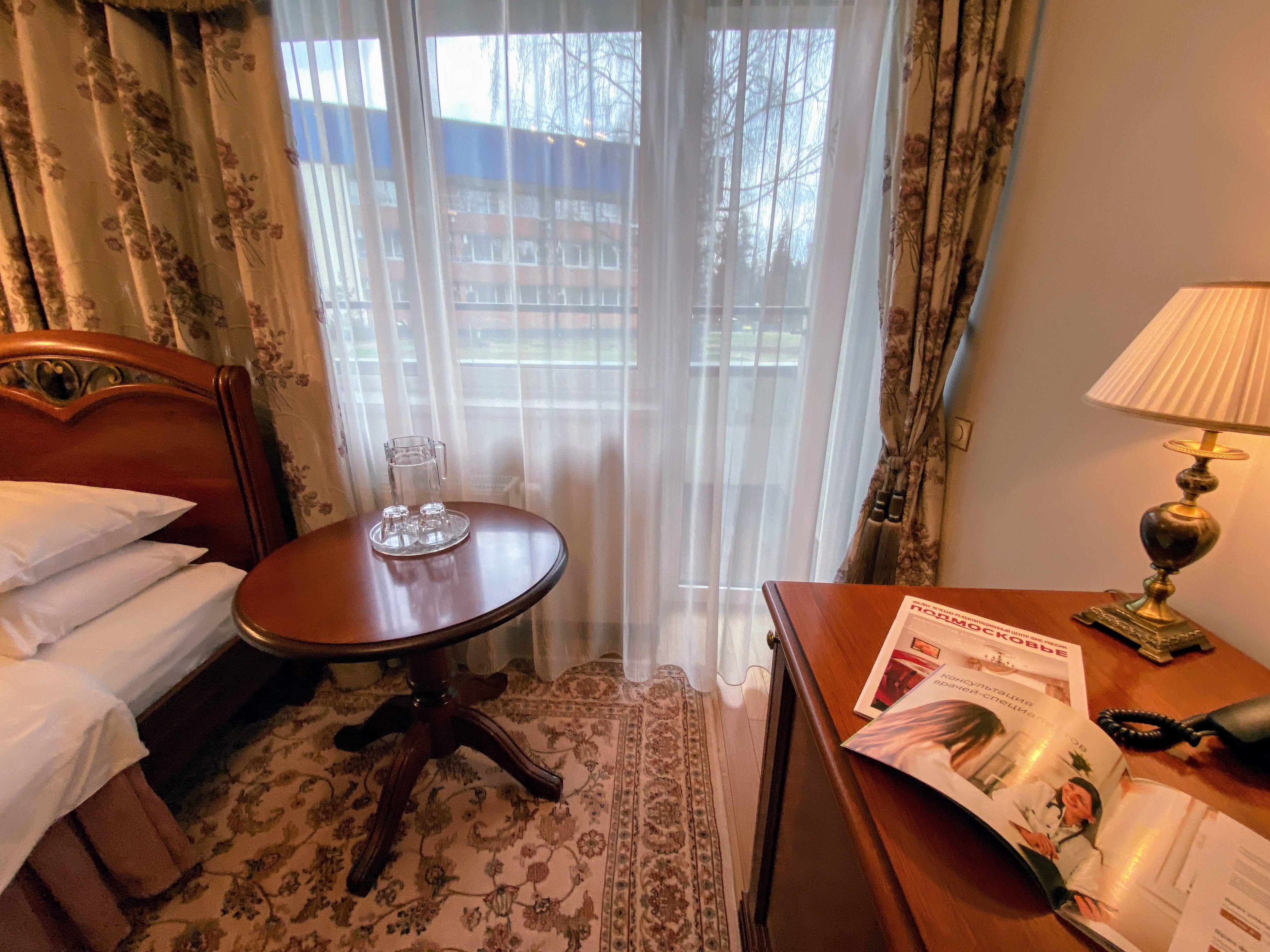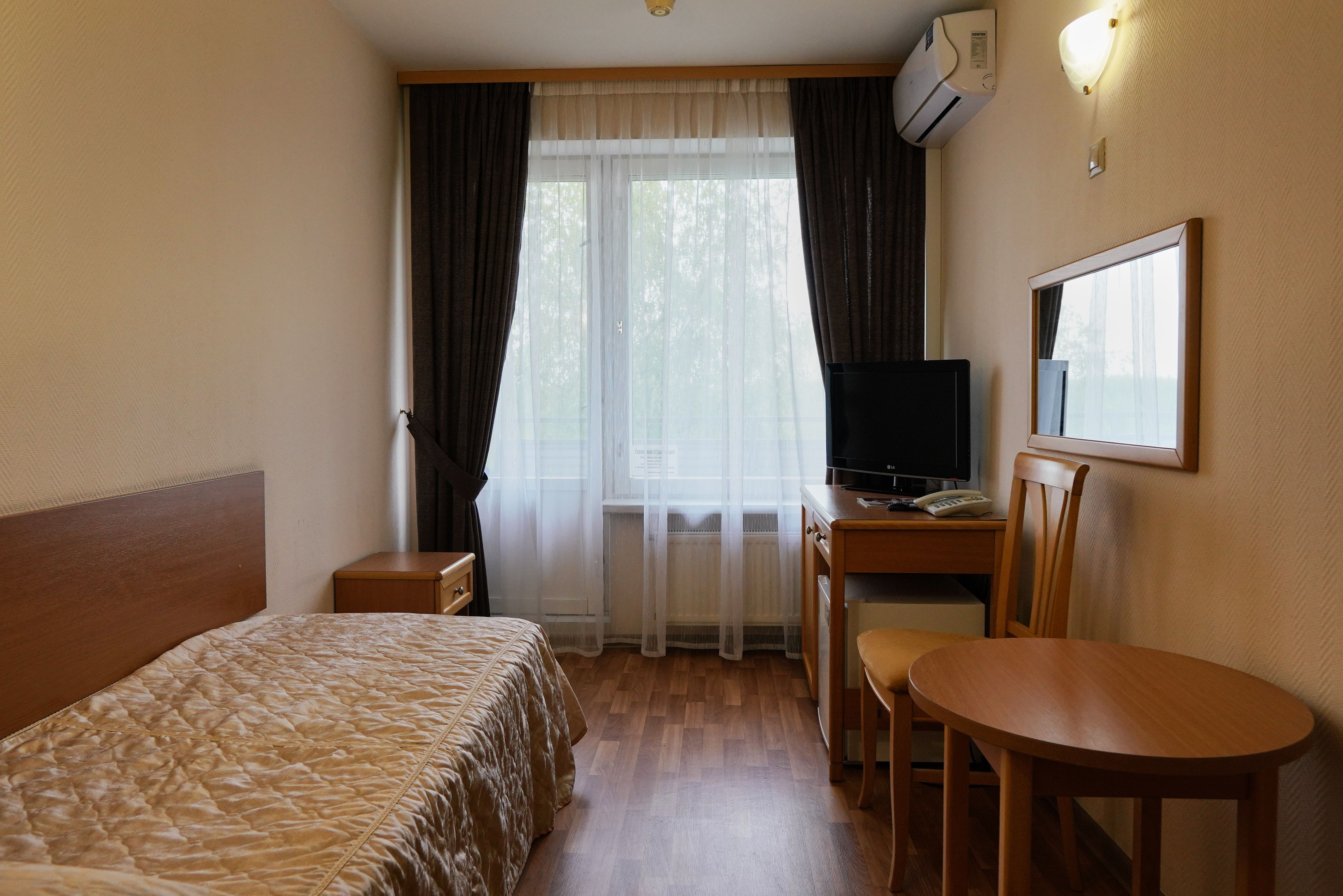 В номере: вешалка, зеркало, кровать односпальная, прикроватная тумбочка, стол, стул, шкаф, кондиционер, мини-холодильник, сейф, телевизор, телефон, чайный набор посуды, электрочайник
