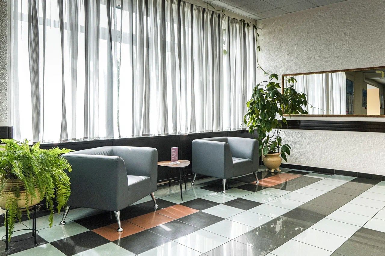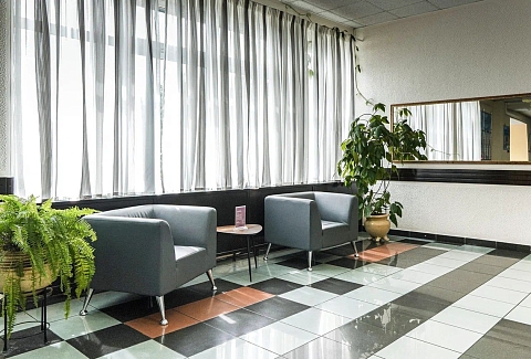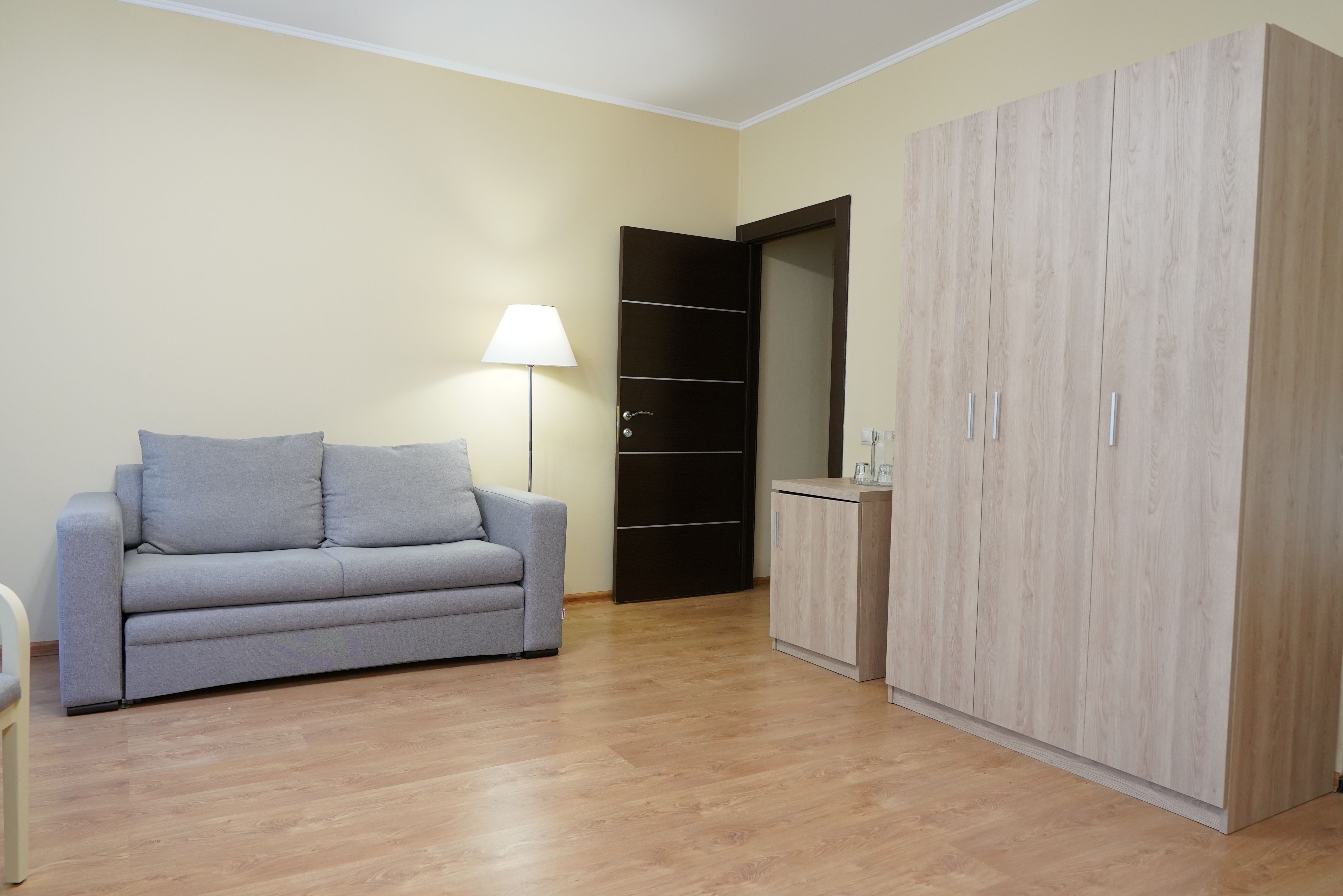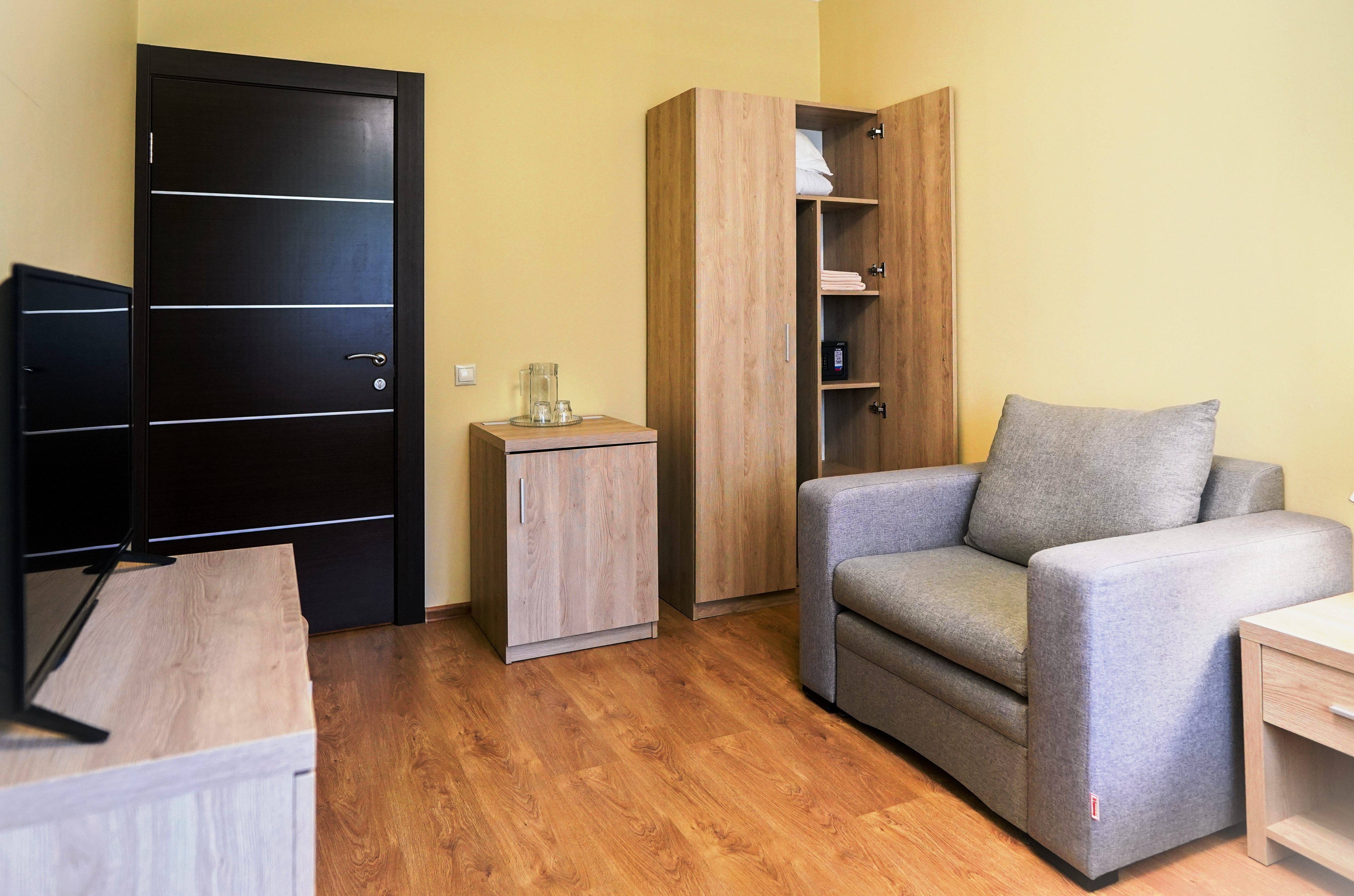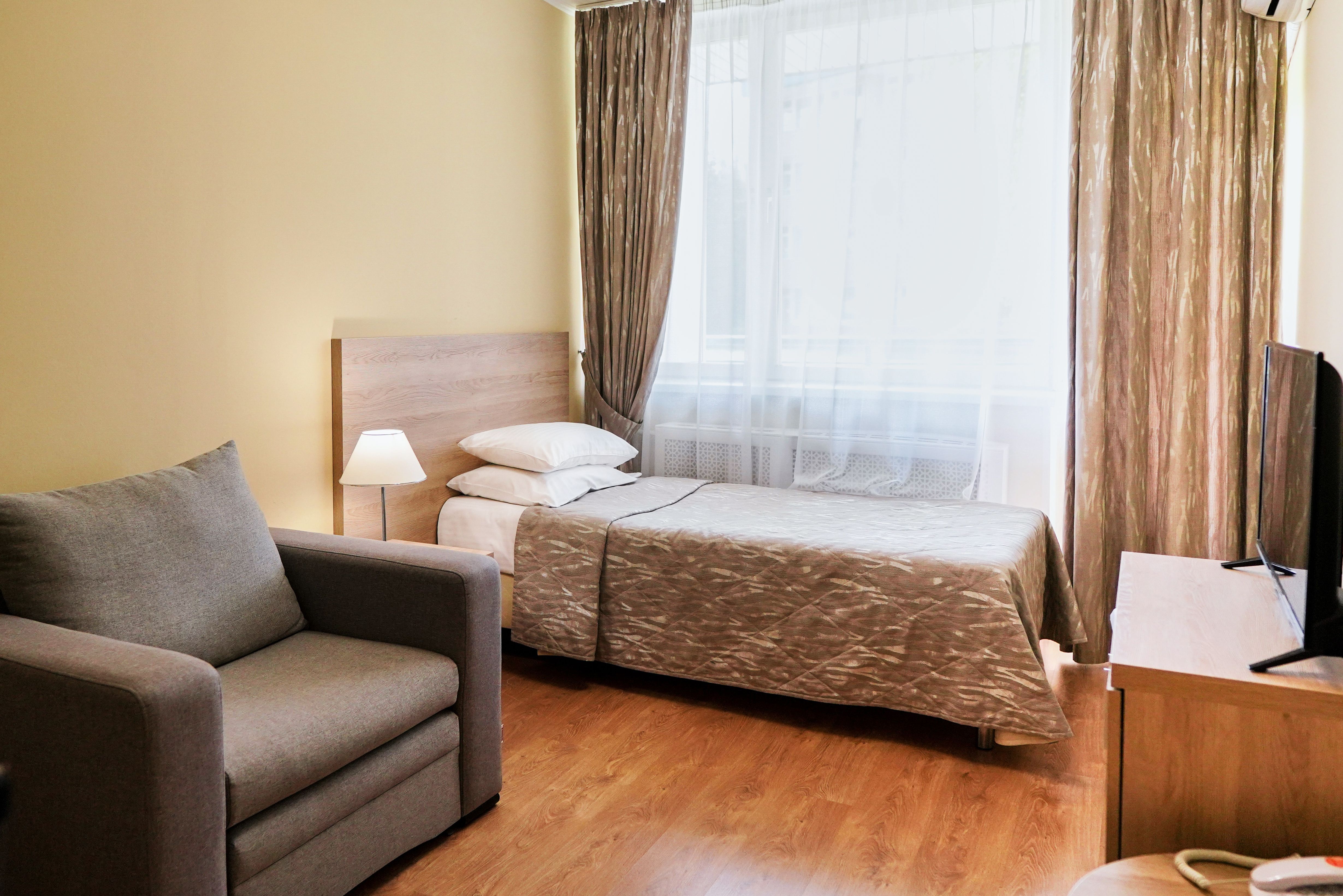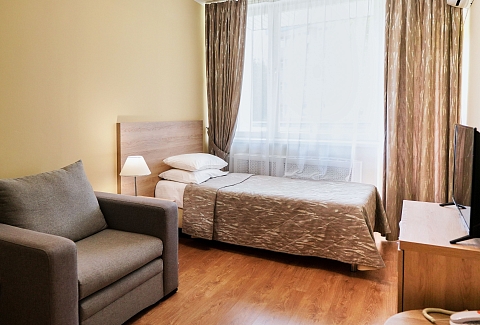 В номере: вешалка, зеркало, кресло-кровать, кровать односпальная, прикроватная тумбочка, стол, стул, шкаф, кондиционер, мини-холодильник, набор посуды, сейф, телевизор, телефон, чайный набор посуды, электрочайник