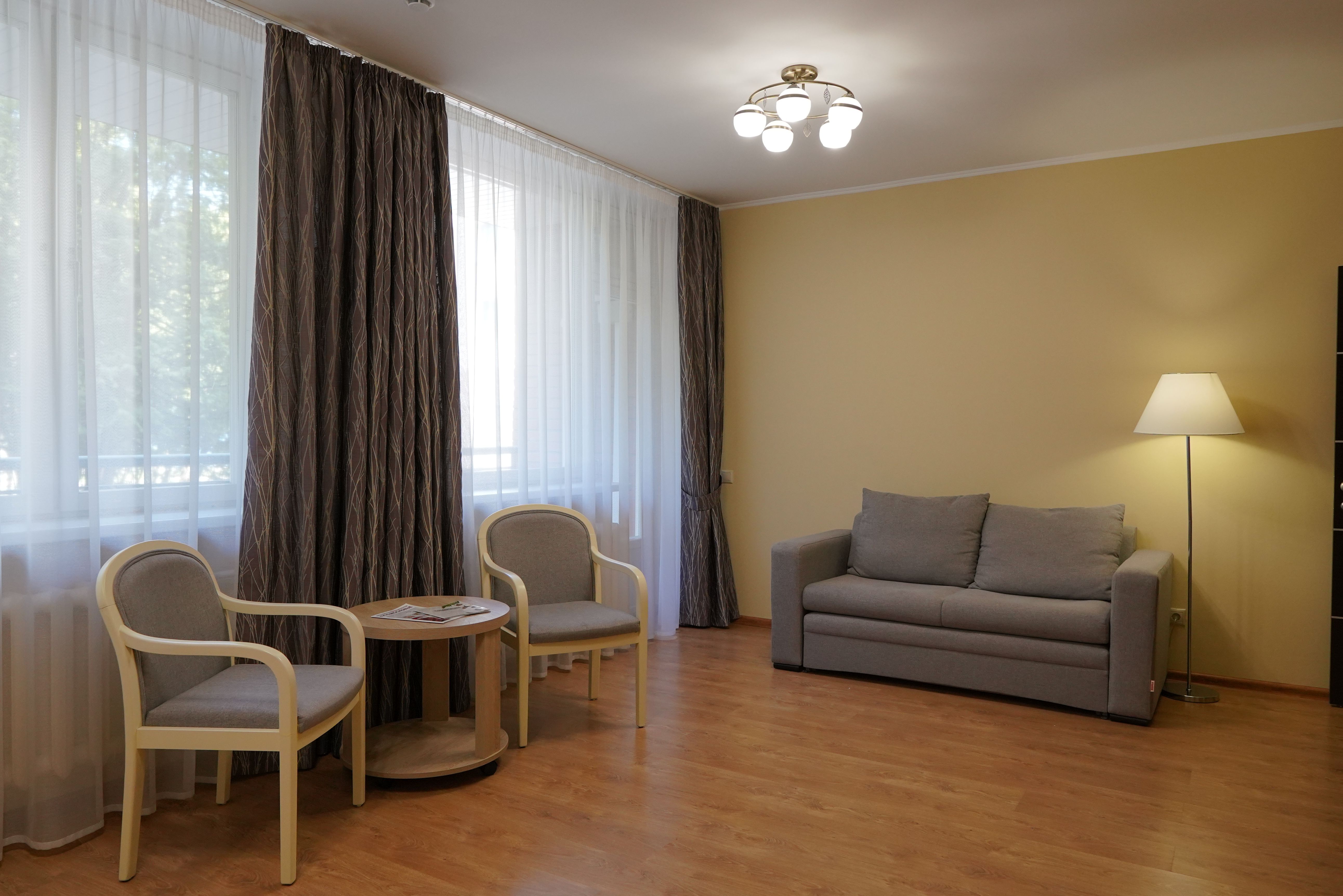 В номере: вешалка, диван раскладной, кровати односпальные, прикроватные тумбочки, стол, стулья, шкаф, кондиционер, мини-холодильник, телевизор, телефон, чайный набор посуды, электрочайник