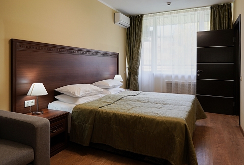 В номере: вешалка, диван раскладной, зеркало, кровать двуспальная, прикроватные тумбочки, стол, стулья, шкаф, кондиционер, мини-холодильник, сейф, телевизор, телефон, чайный набор посуды, электрочайник