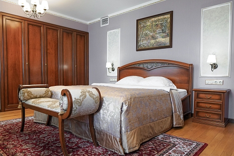 В номере: вешалка, диван раскладной, зеркало, кровать двуспальная, прикроватные тумбочки, стол, стулья, тумба под телевизор, шкаф, гладильная доска, кондиционер, мини-холодильник, сейф, телевизор, телефон, утюг, чайная станция, электрочайник