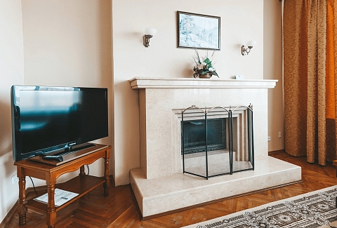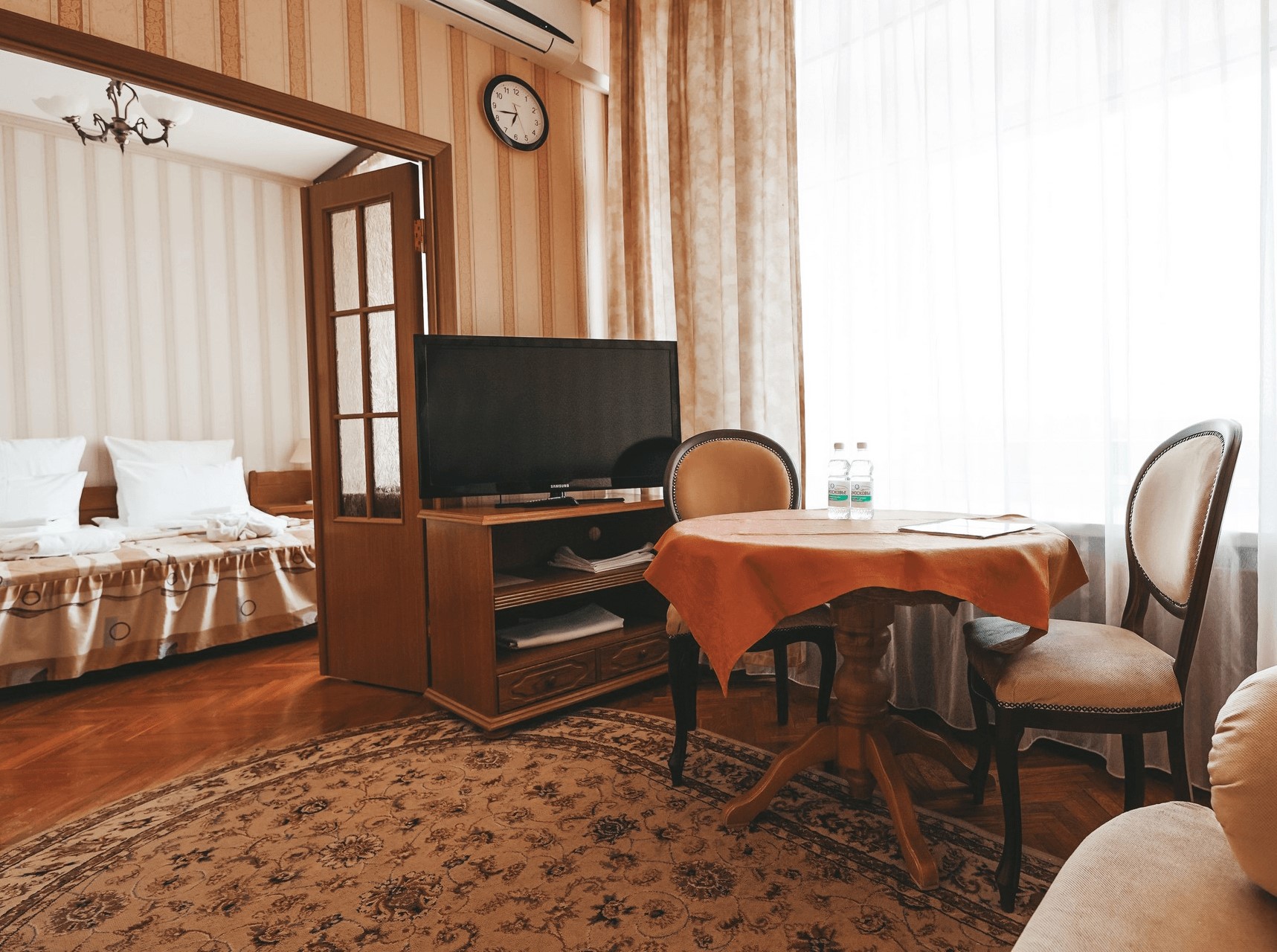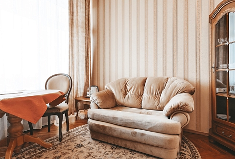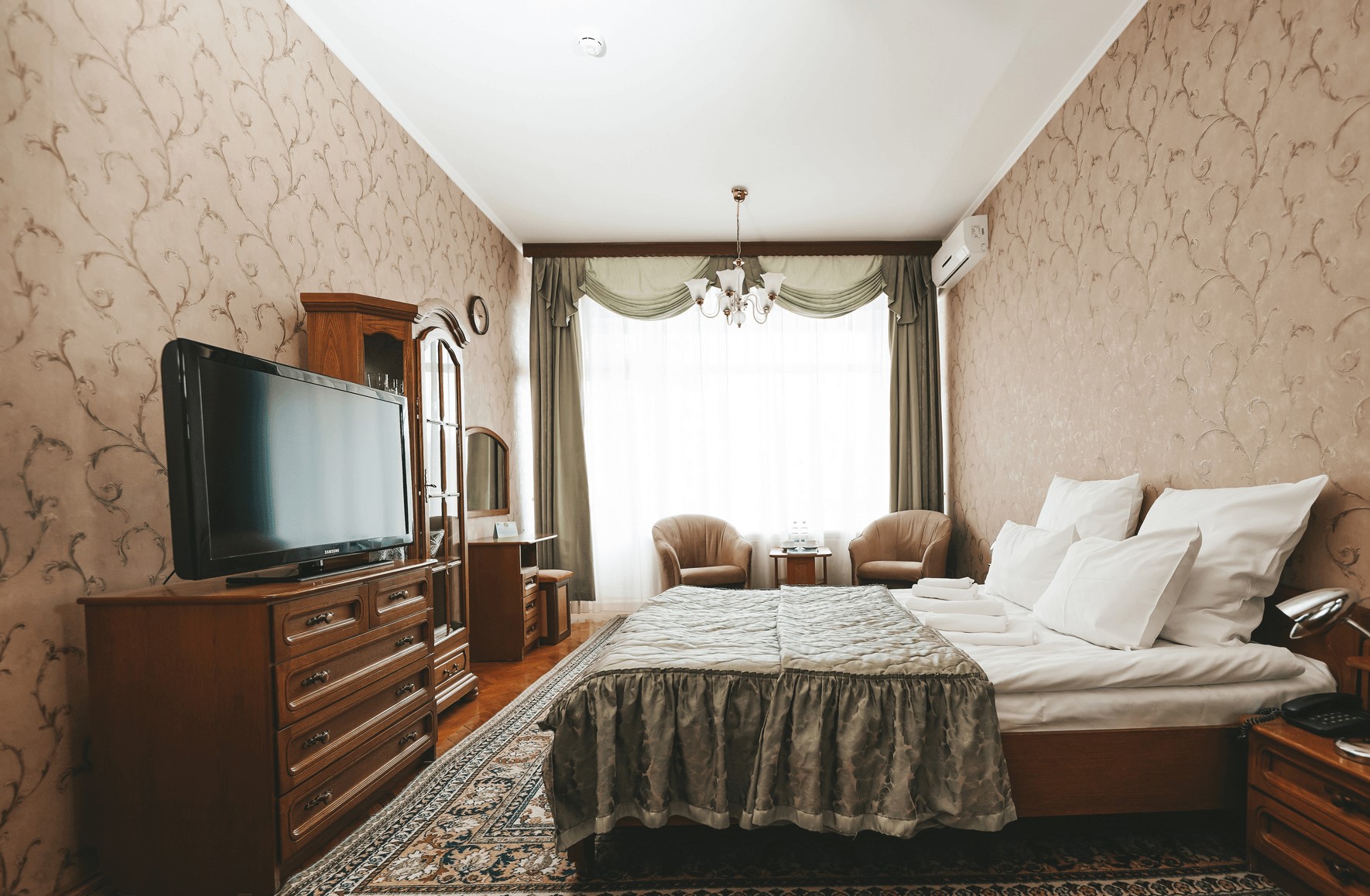 В номере: вешалка, диван, зеркало, кресла, кровать двуспальная, прикроватные тумбочки, стол, стулья, шкаф-купе, кондиционер, набор посуды, сейф, телевизор, телефон, холодильник, электрочайник