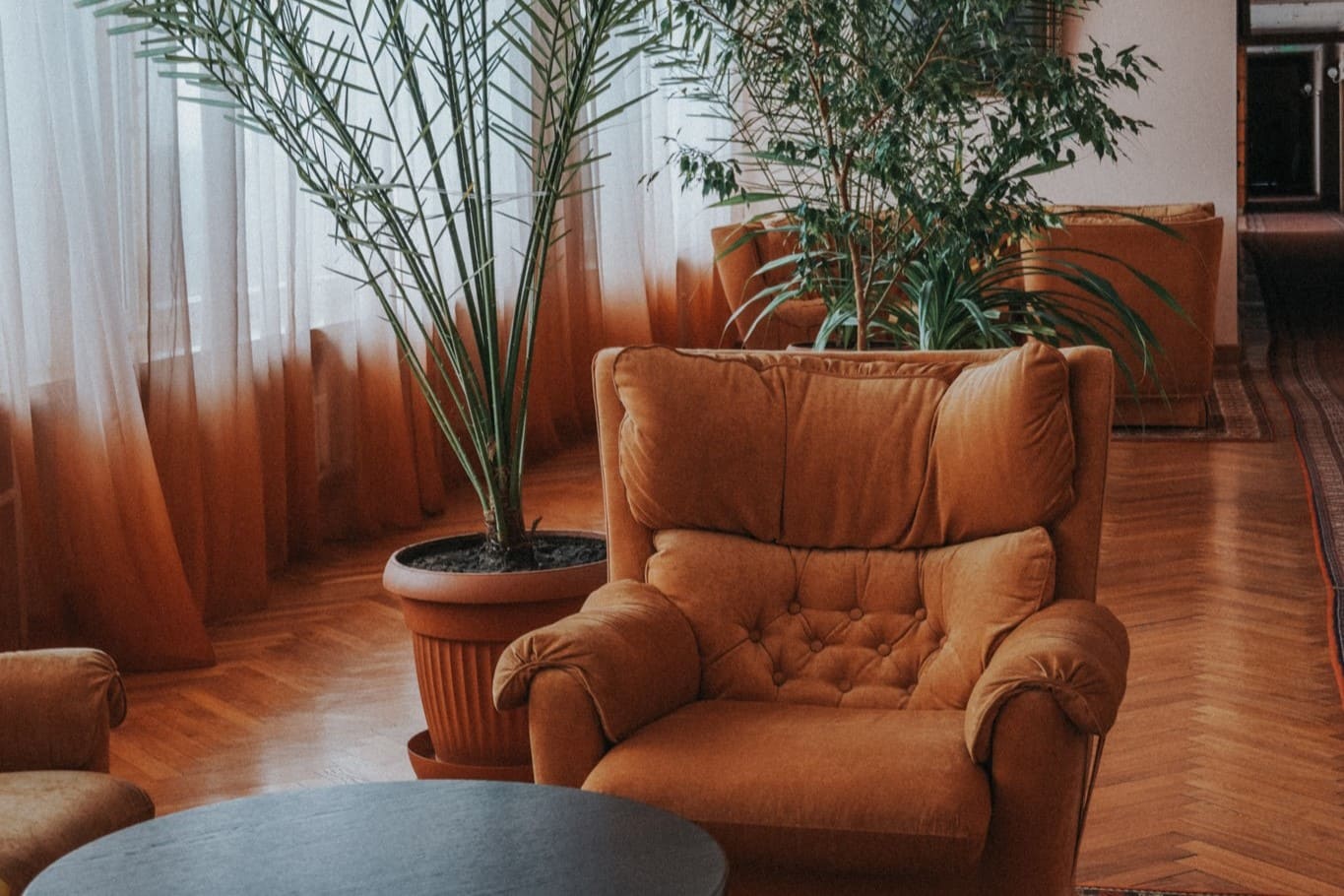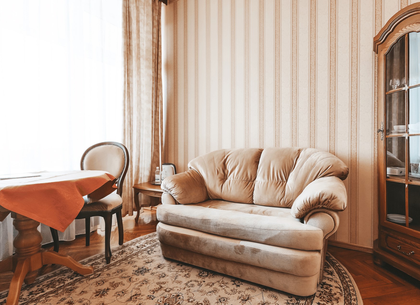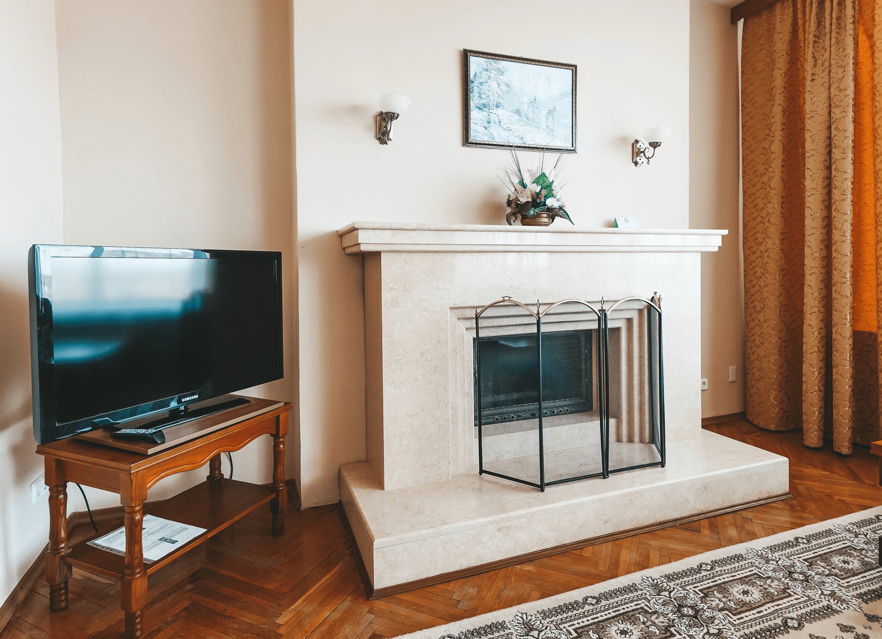 В номере: вешалка, диван, зеркало, кресла, кровать двуспальная, прикроватные тумбочки, стол, стулья, шкаф-купе, кондиционер, набор посуды, сейф, телевизор, телефон, холодильник, электрочайник