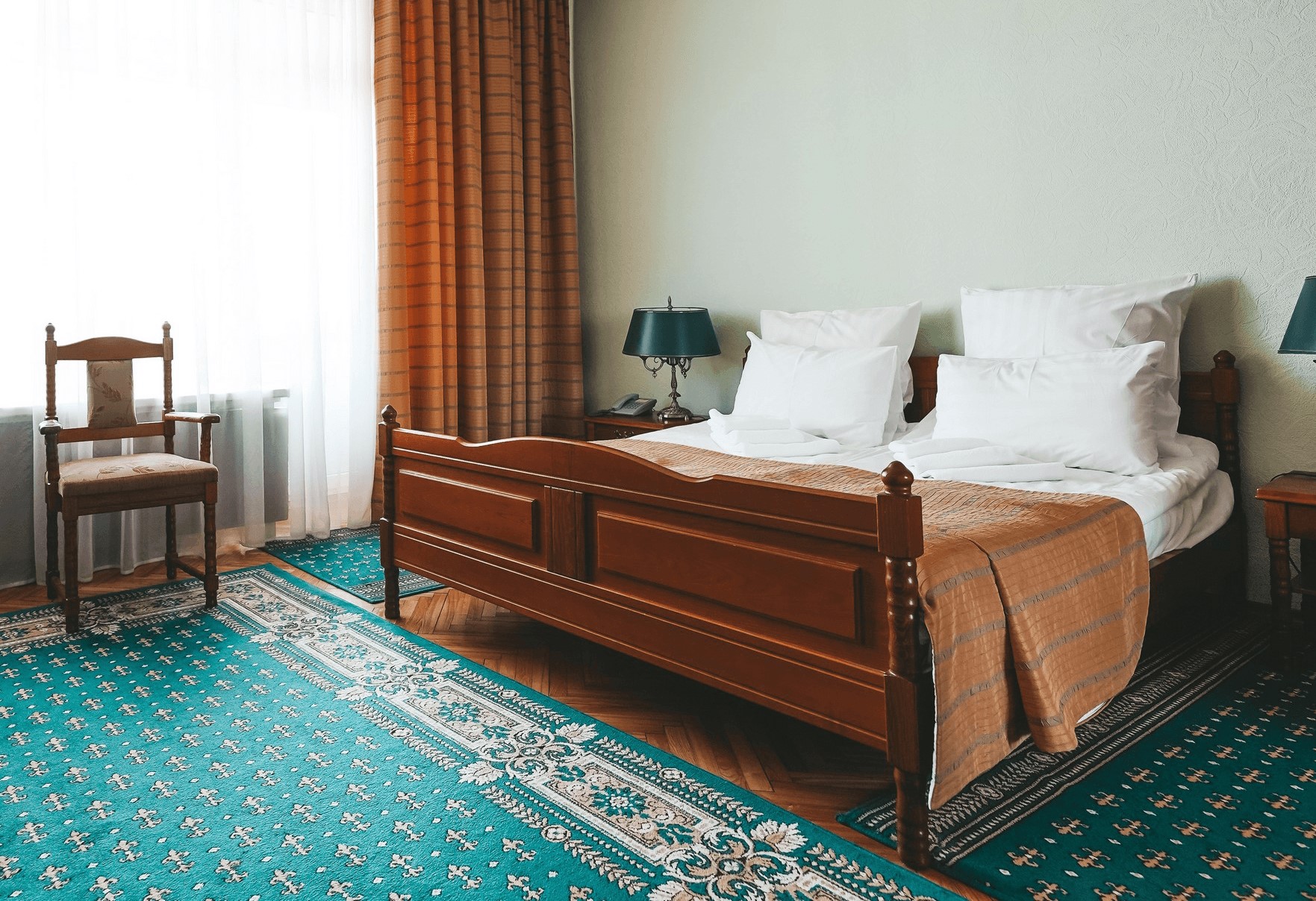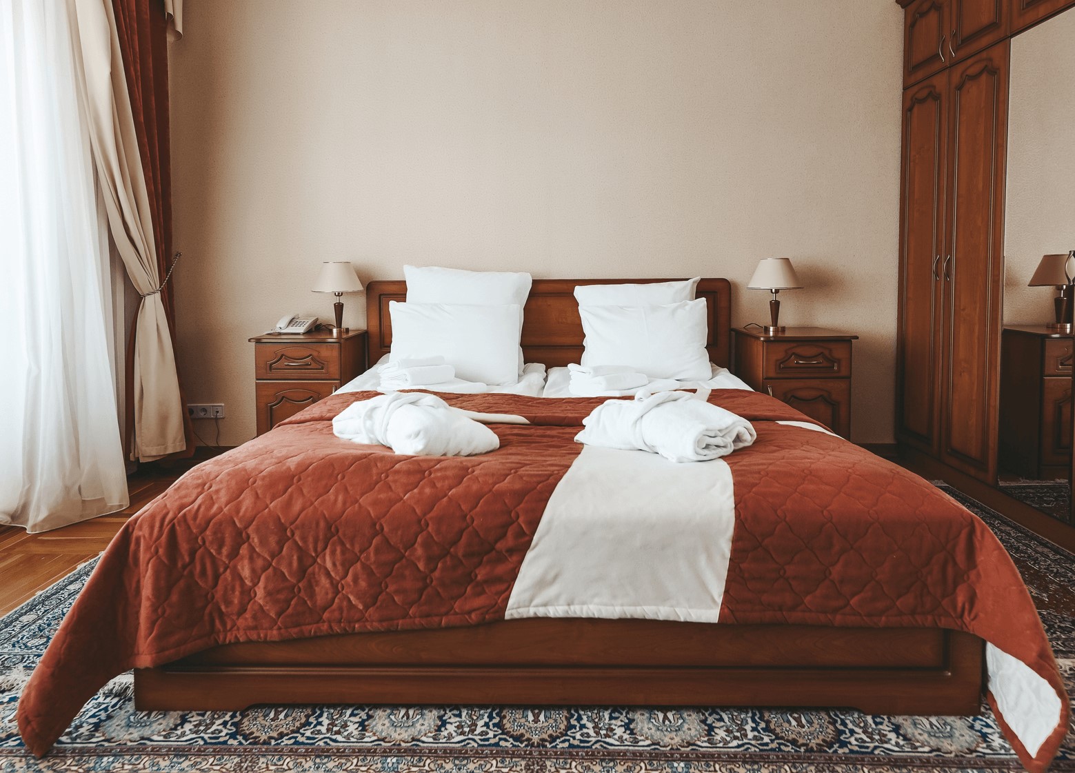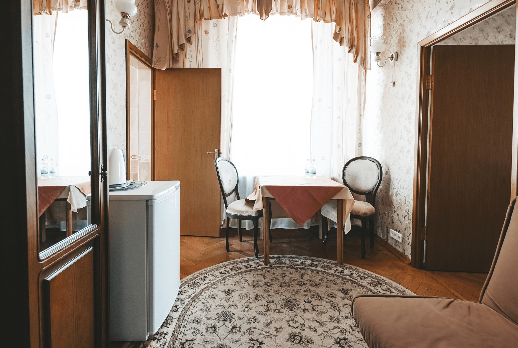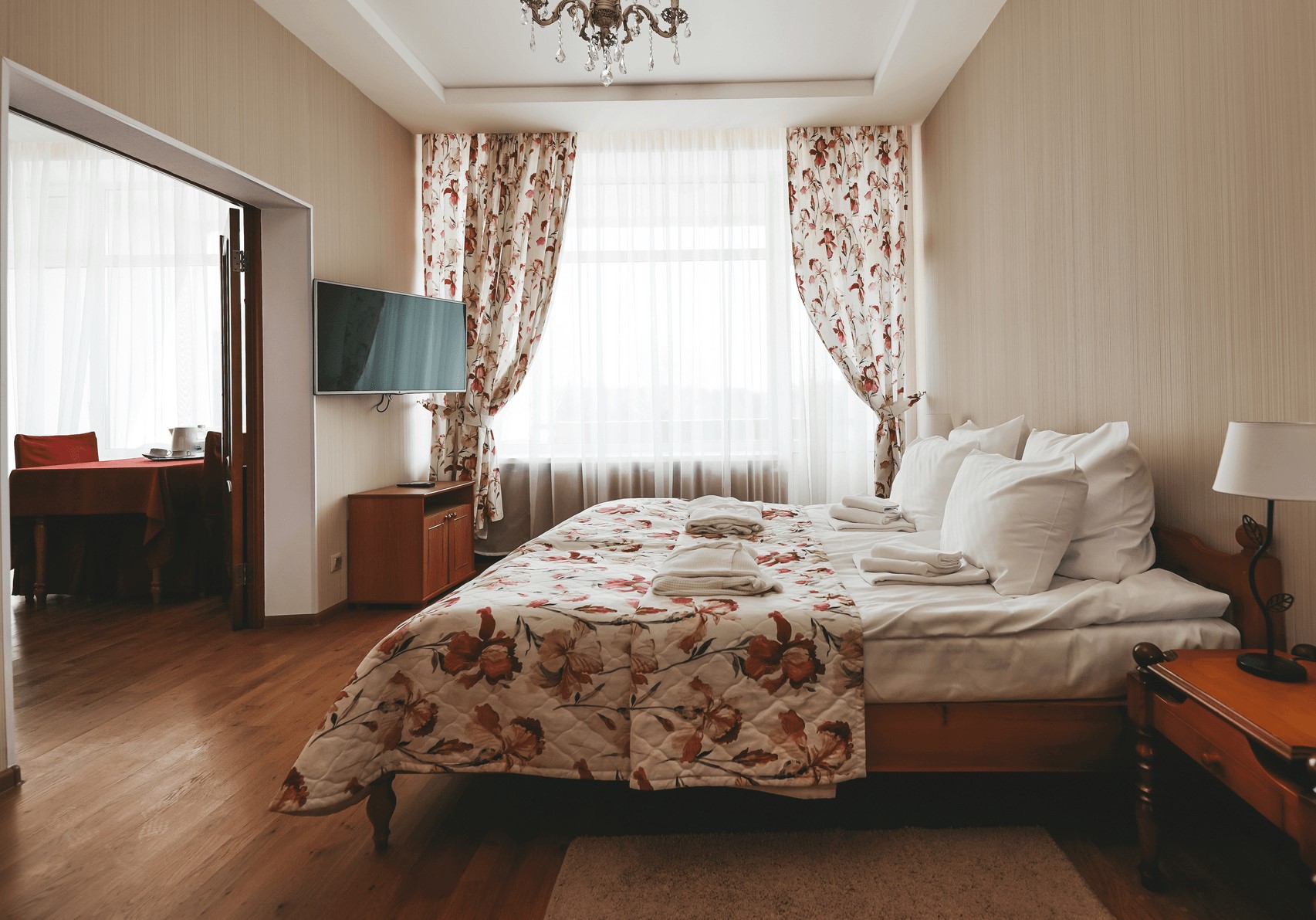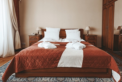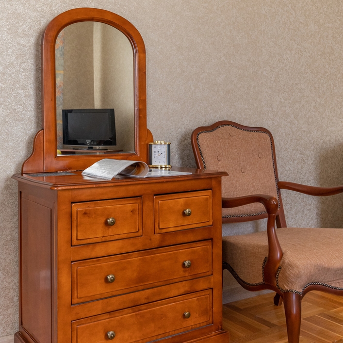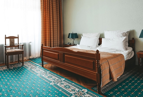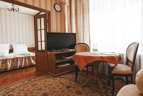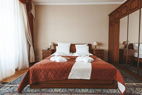 В номере: зеркало, кресла, кровать двуспальная, прикроватные тумбочки, стол, стулья, шкаф, набор посуды, телевизор, телефон, холодильник, электрочайник