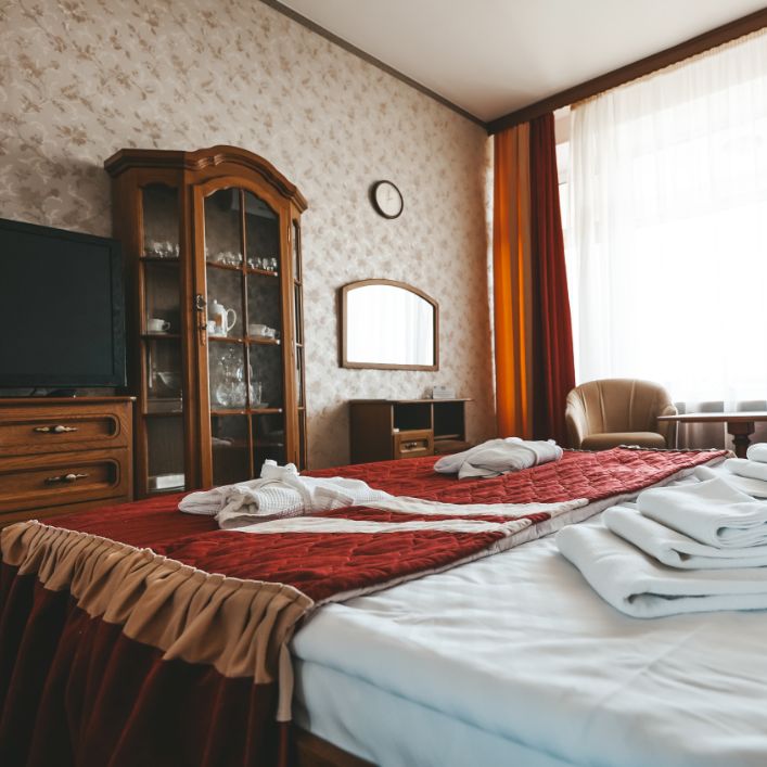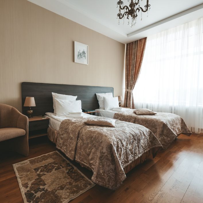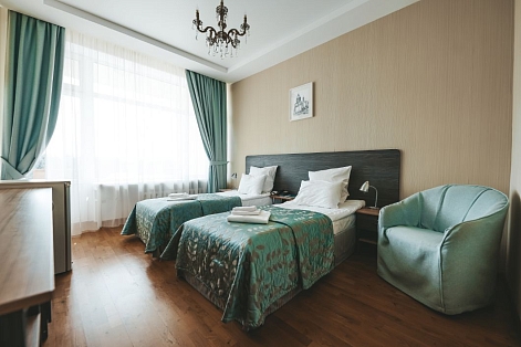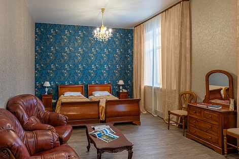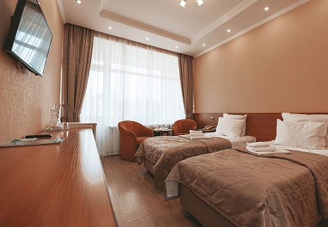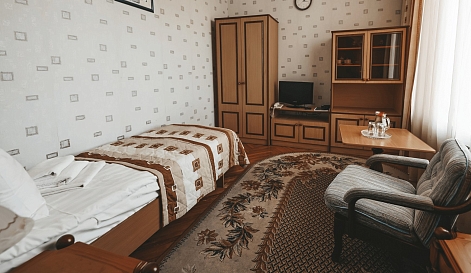 В номере: зеркало, кресло, кровати односпальные /одна двуспальная кровать, прикроватная тумбочка, стол, стул, шкаф, набор посуды, телевизор, телефон, холодильник, электрочайник