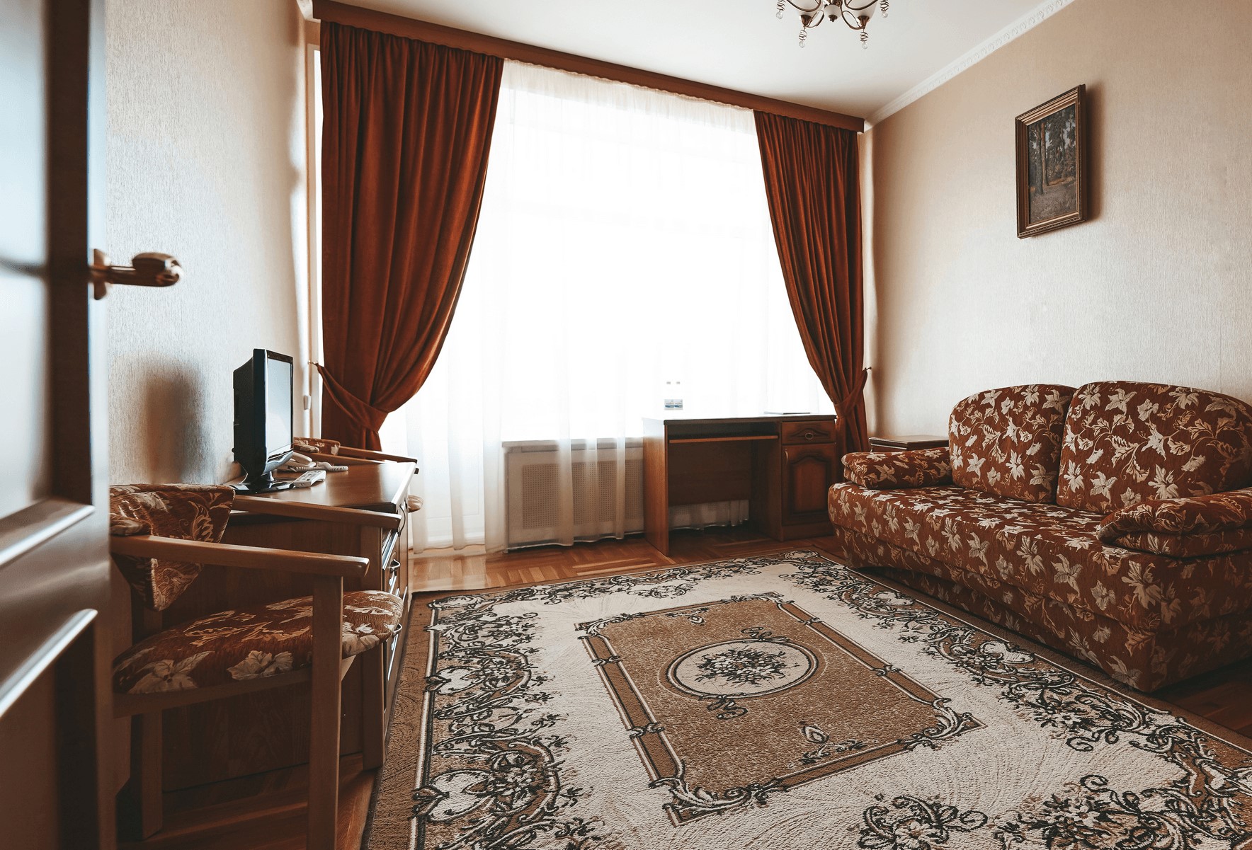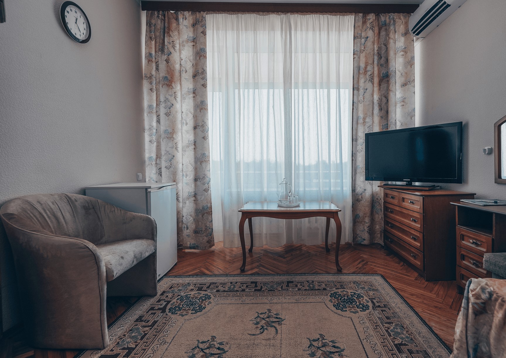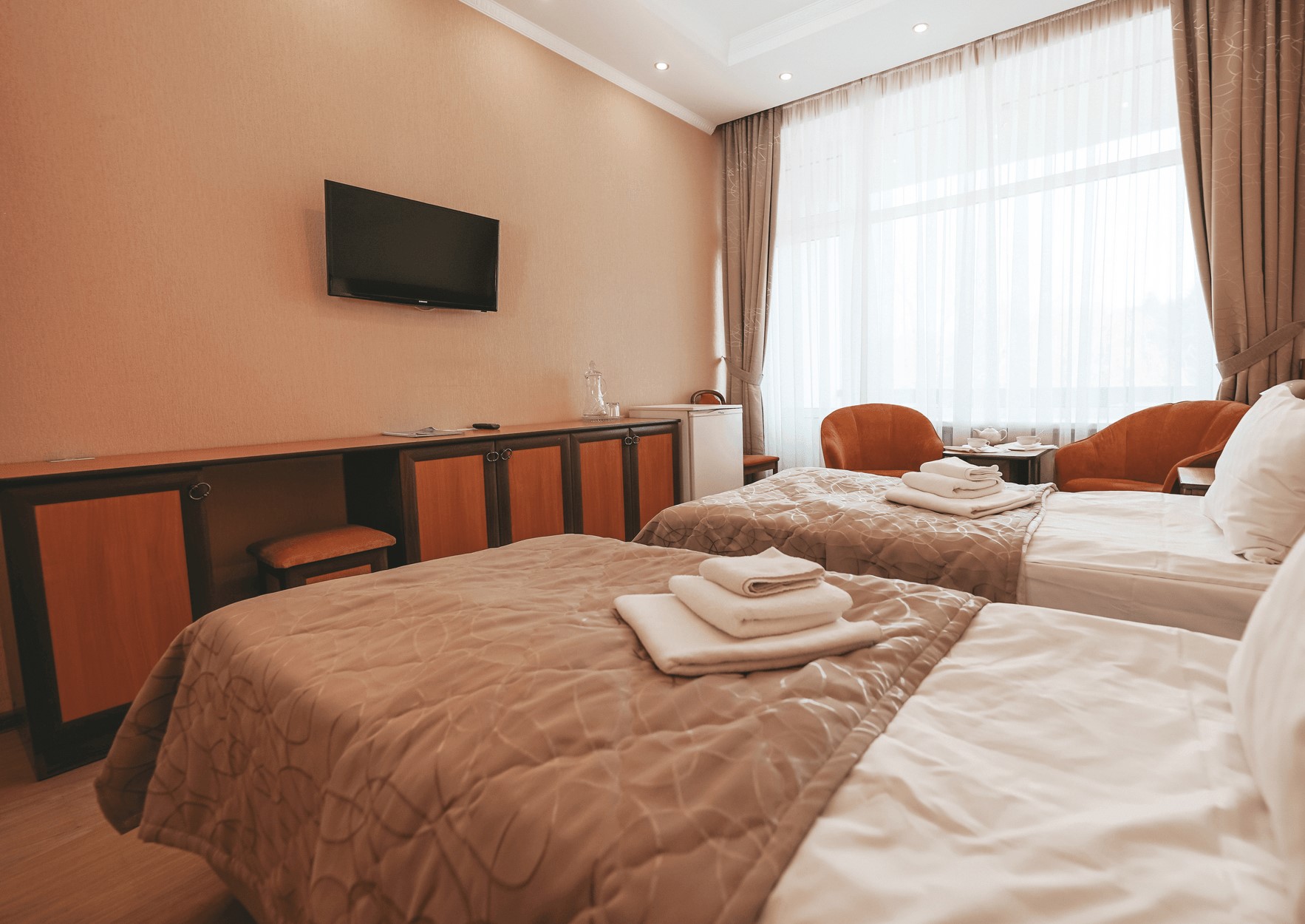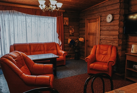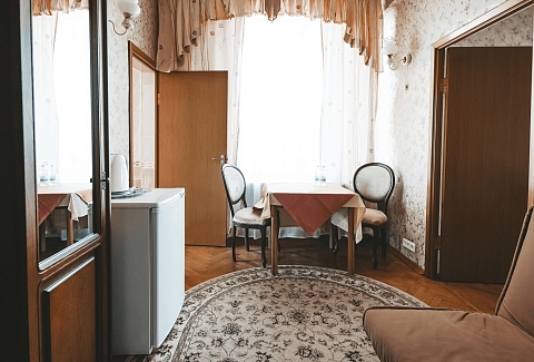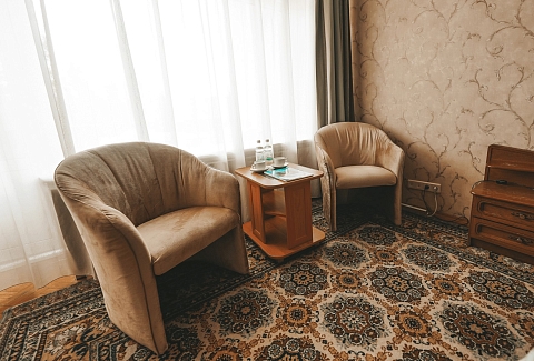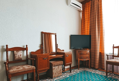 В номере: кресла, стол, стулья, тумба под телевизор, шкаф встроенный, кондиционер, набор посуды, сейф, телевизор, телефон, холодильник, электрочайник