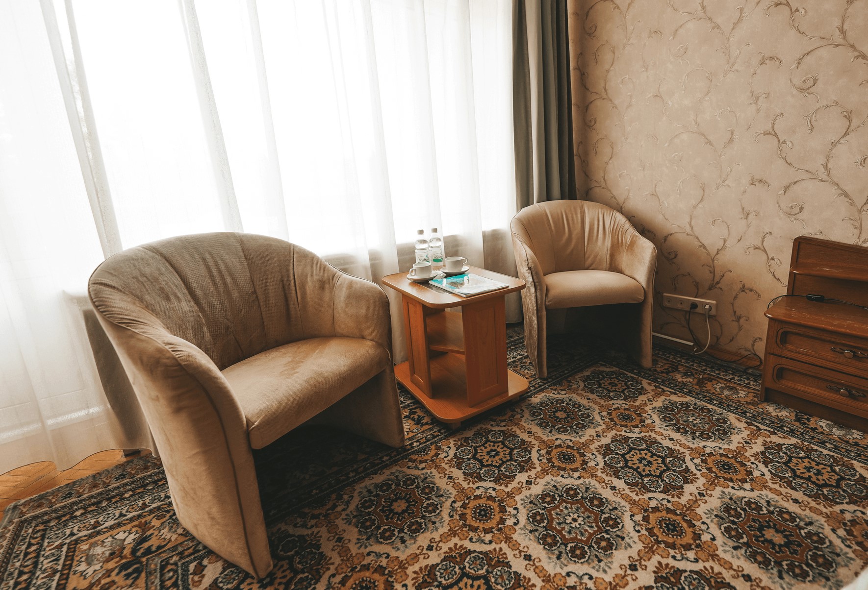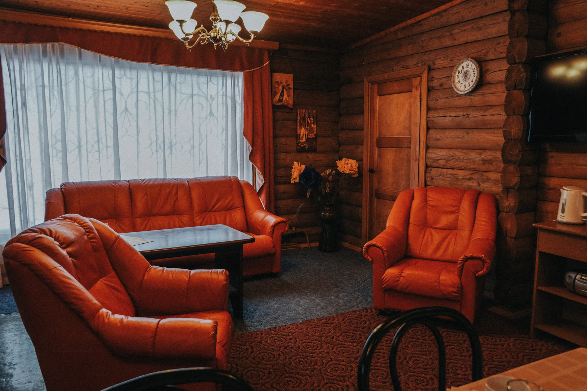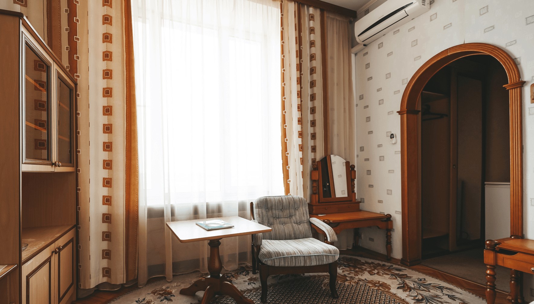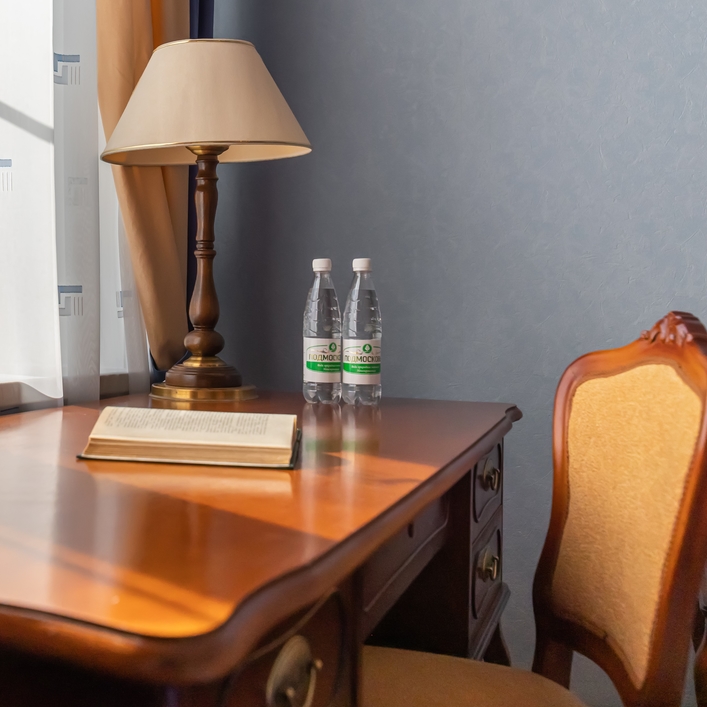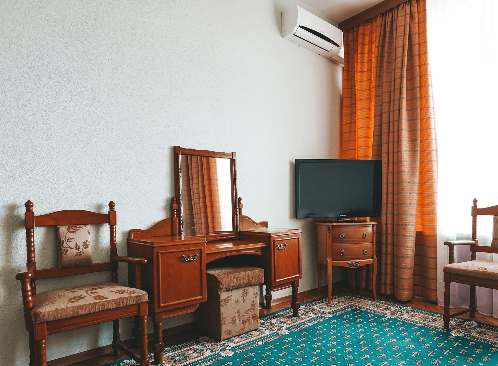 В номере: кресла, стол, стулья, тумба под телевизор, шкаф встроенный, кондиционер, набор посуды, сейф, телевизор, телефон, холодильник, электрочайник
