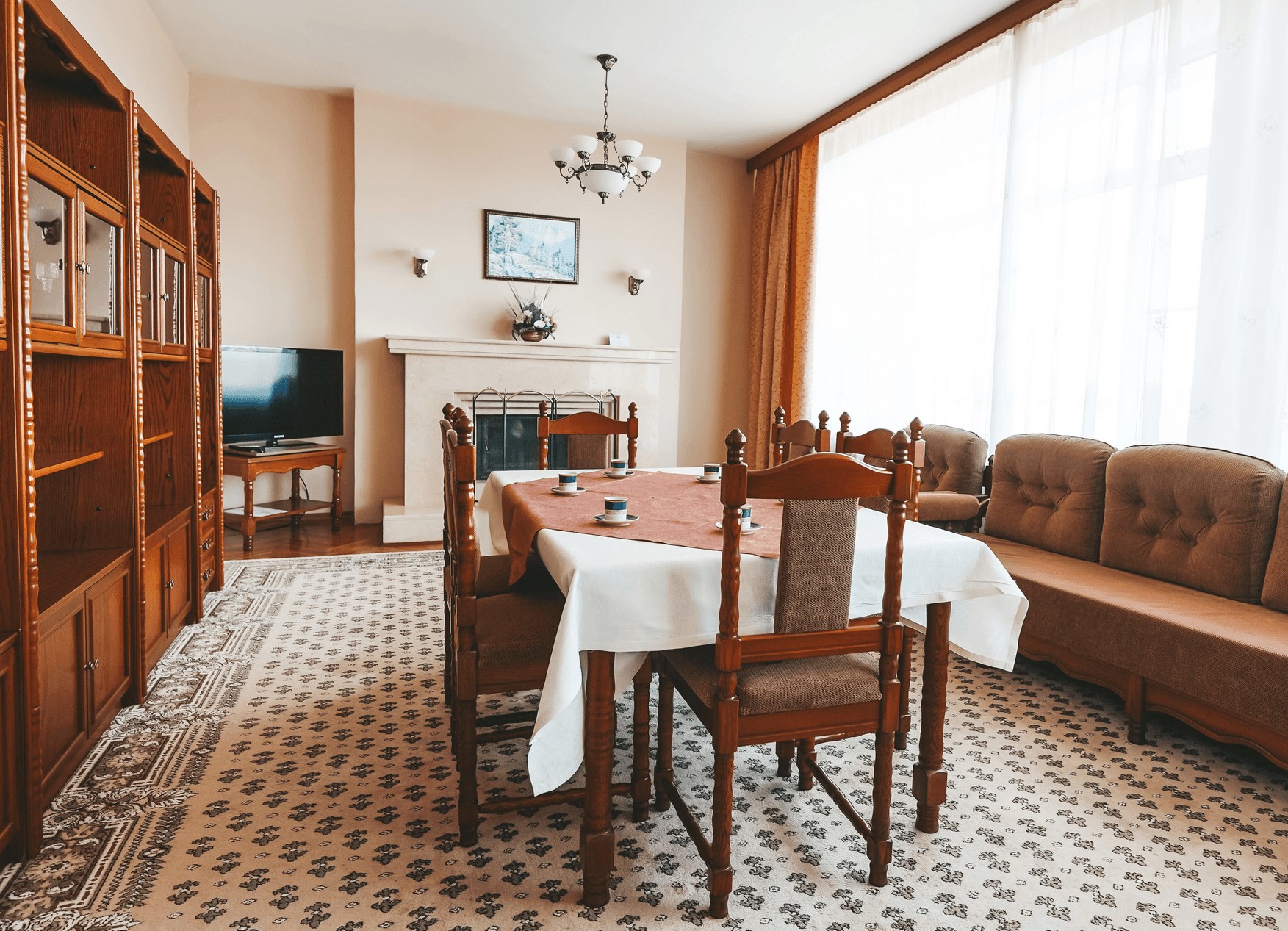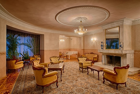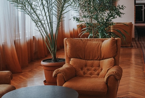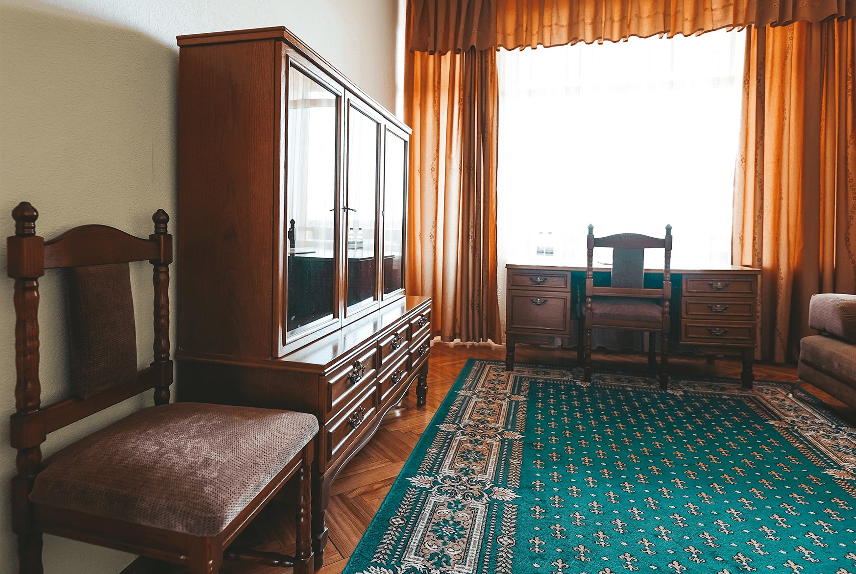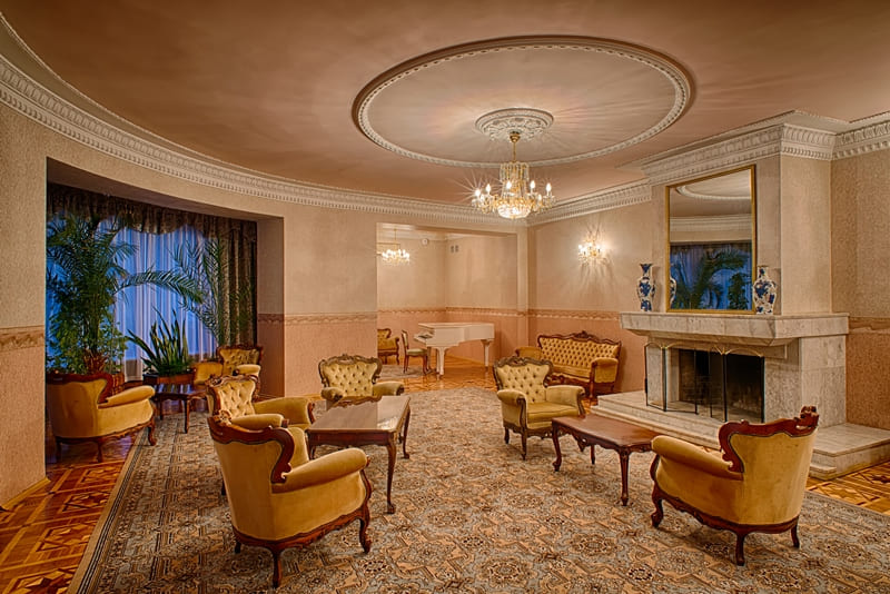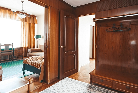 В номере: вешалка, диван, комод, кресла, кровать двуспальная, прикроватные тумбочки, стол, столик журнальный, стулья, тумба под телевизор, шкаф, кондиционер, набор посуды, сейф, телевизор, телефон, холодильник, электрочайник
