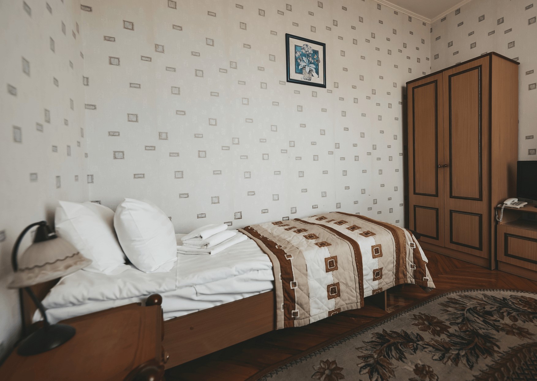 В номере: зеркало, кресло, кровать односпальная, прикроватная тумбочка, стол, стул, шкаф, набор посуды, телевизор, телефон, холодильник, электрочайник