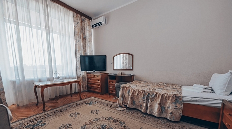 В номере: вешалка, зеркало, кресла, кровать односпальная, прикроватная тумбочка, стол, стулья, шкаф, кондиционер, набор посуды, телевизор, телефон, холодильник, электрочайник