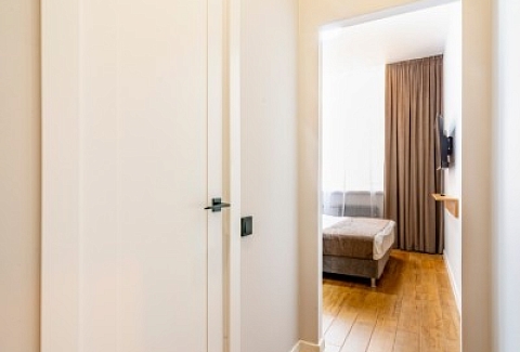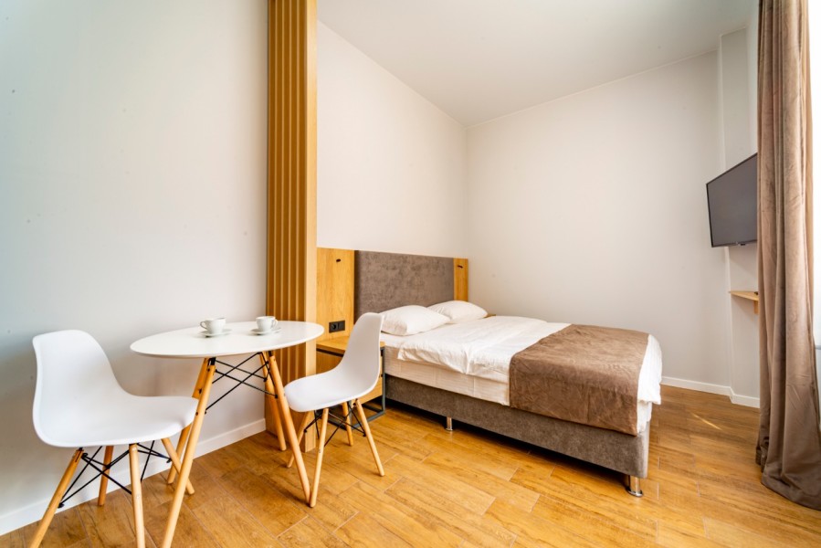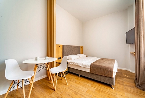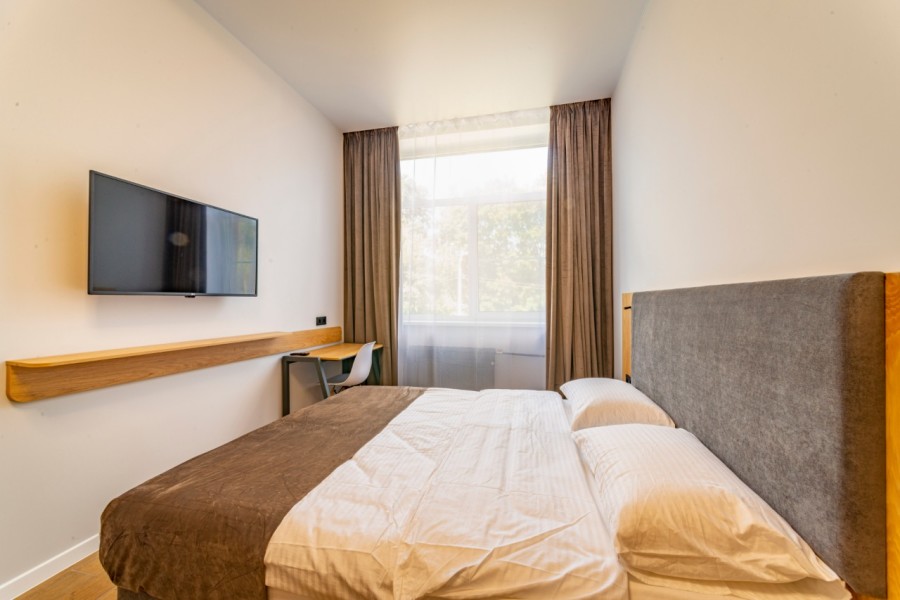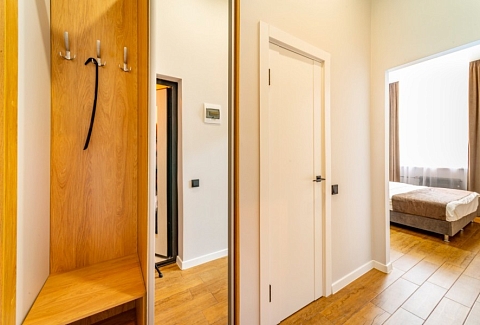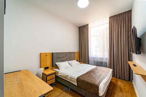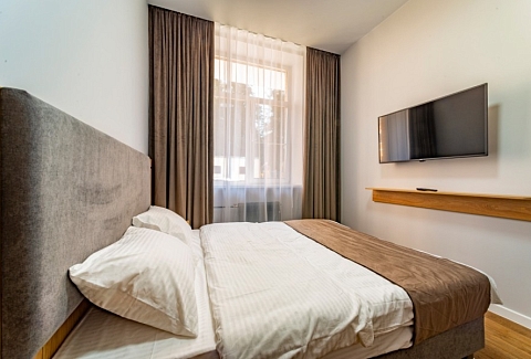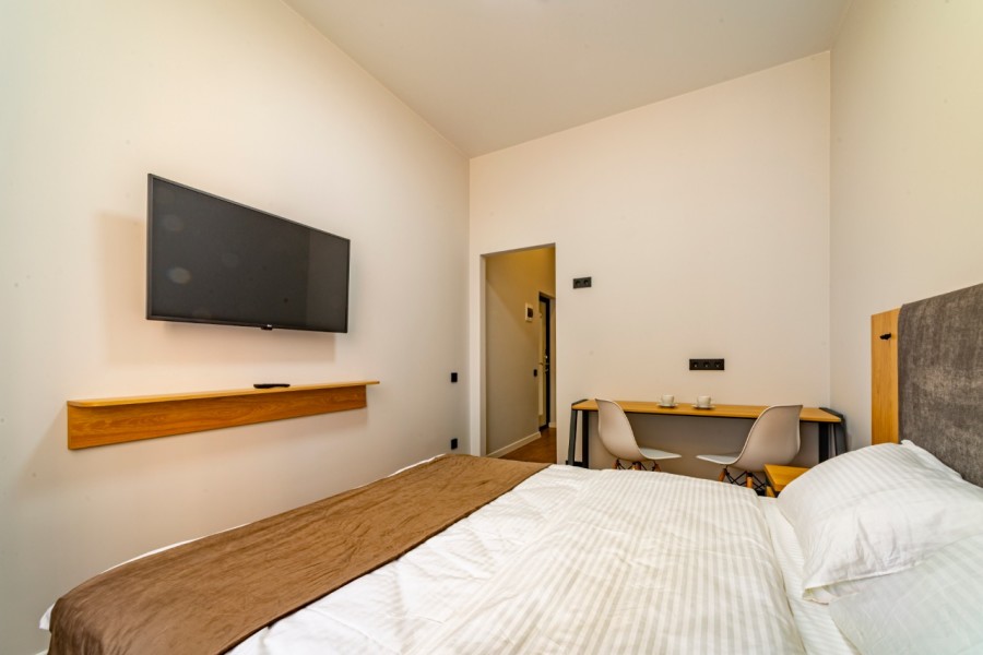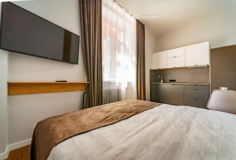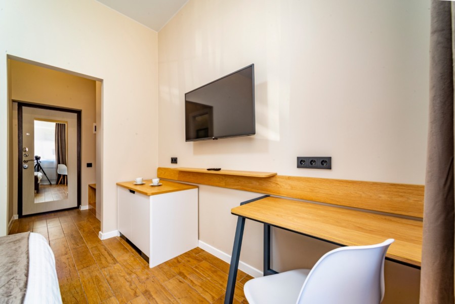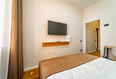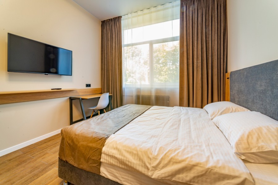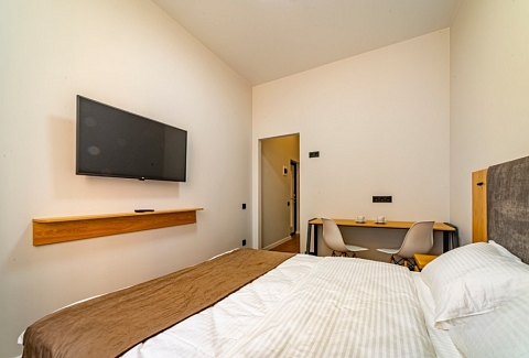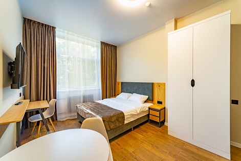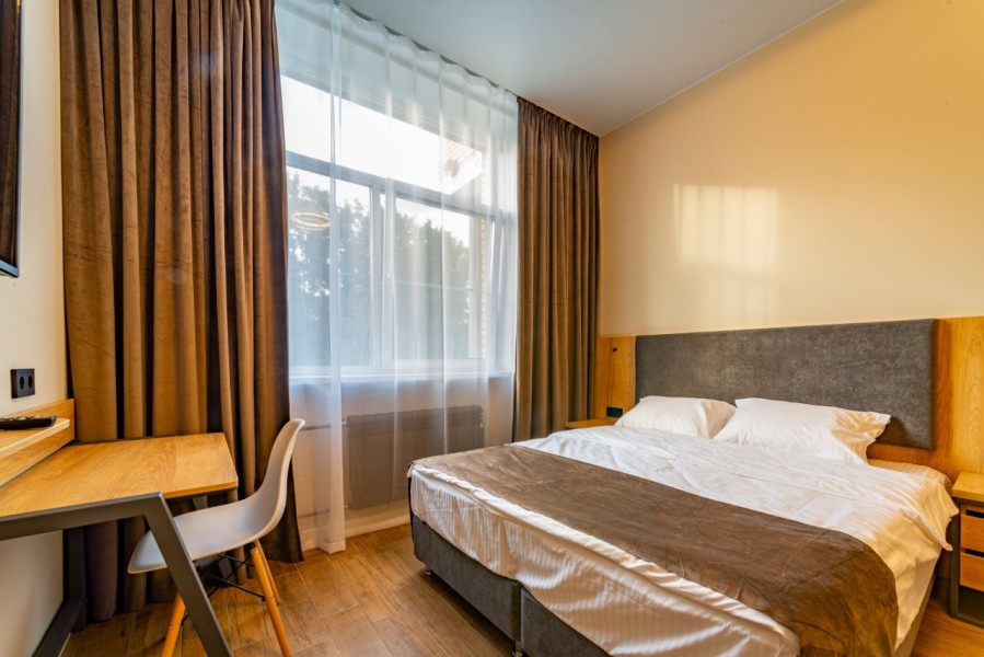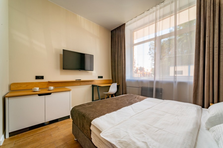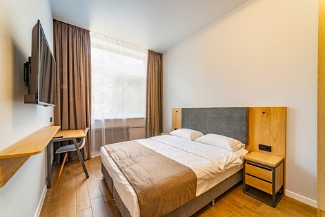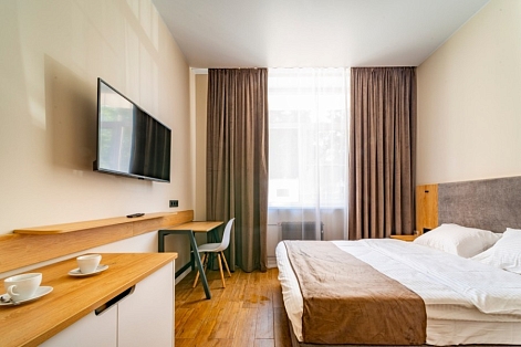 В номере: зеркало, кровать двуспальная, прикроватные тумбочки, стол, стулья, шкаф, кондиционер, мини-холодильник, телевизор ЖК, чайный набор посуды, электрочайник