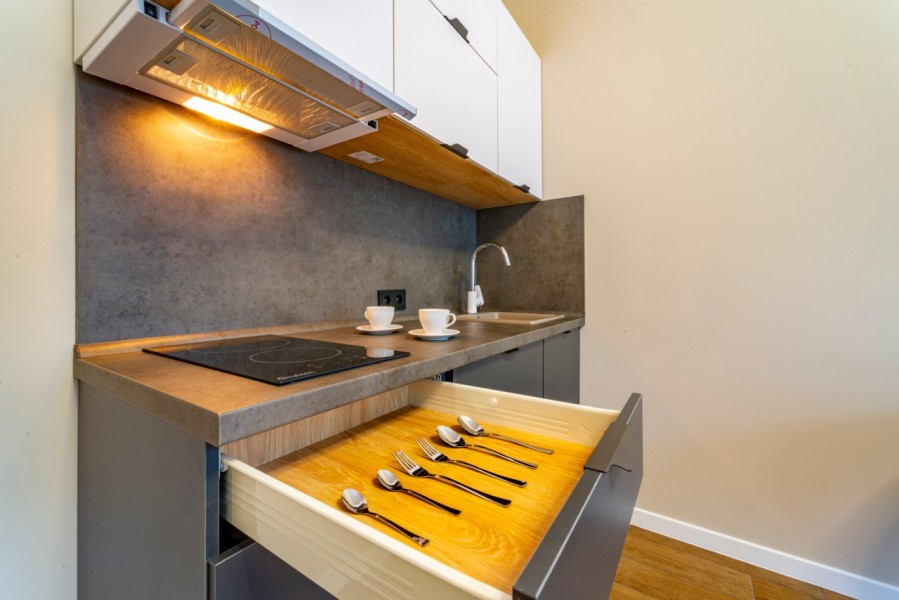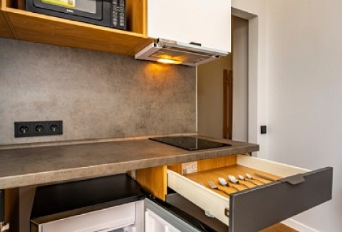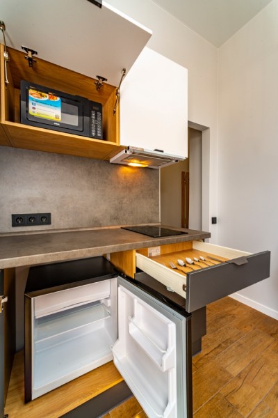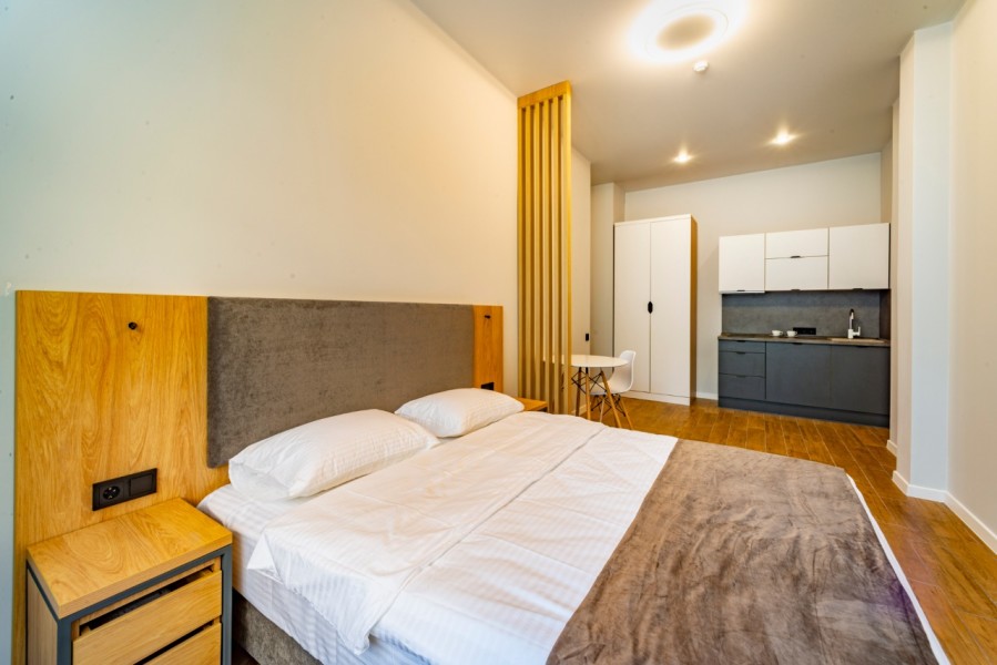 В номере: зеркало, кровать двуспальная, прикроватные тумбочки, стол, стулья, шкаф, кондиционер, микроволновая печь, мини-холодильник, набор посуды, плита электрическая, телевизор ЖК, чайный набор посуды, электрочайник