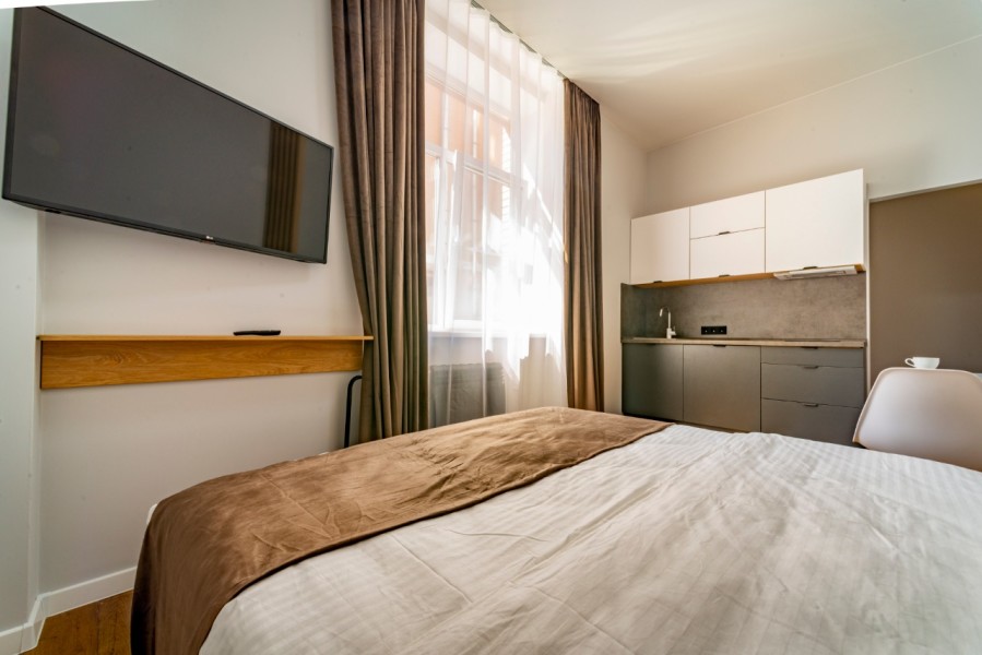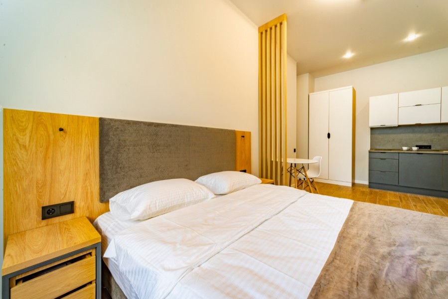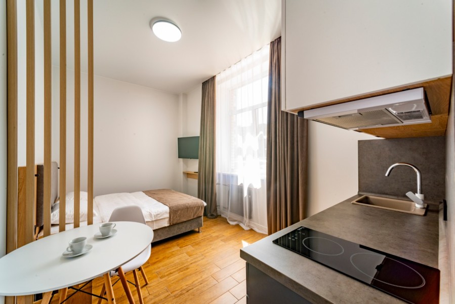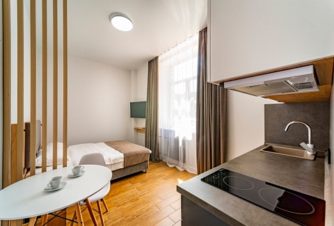 Железнодорожный вокзал – в 5 минутах езды, за 10 – 15 можно доехать до Симферопольского шоссе и федеральной магистрали М-2 «Крым».Многоэтажный дом, в котором разместились апартаменты, возвышается на улице Ульяновых. В распоряжении гостей однокомнатные 2-местные номера разной категории комфорта. В апартаментах – оборудованный кухонный уголок с электроплитой, санузел с душем, есть телевизор со SMART-TV и стриминговыми сервисами, сеть wi-fi. Гости, приезжающие на авто, смогут оставить машину рядом с домом на открытой охраняемой парковке.