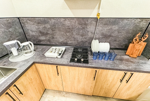 В номере: зеркало, кровать двуспальная, стол, стулья, шкаф, гладильная доска, микроволновая печь, набор посуды, плита электрическая, стиральная машина, сушилка для белья, телевизор ЖК, утюг, холодильник, чайный набор посуды, электрочайник
