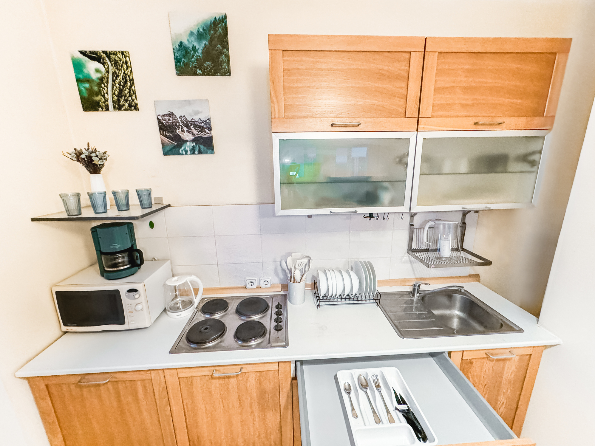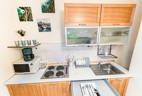 В номере: диван, зеркало, кровать двуспальная, прикроватные тумбочки, стол, стулья, шкаф, гладильная доска, микроволновая печь, набор посуды, плита электрическая, стиральная машина, сушилка для белья, телевизор ЖК, утюг, холодильник, чайный набор посуды, электрочайник