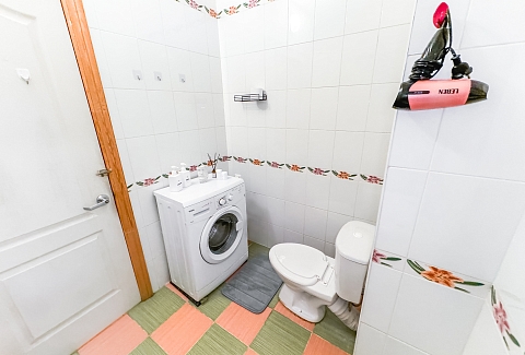 В номере: зеркало, кровать двуспальная, прикроватные тумбочки, стол, стулья, шкаф, гладильная доска, микроволновая печь, набор посуды, плита электрическая, стиральная машина, сушилка для белья, телевизор ЖК, утюг, холодильник, чайный набор посуды, электрочайник