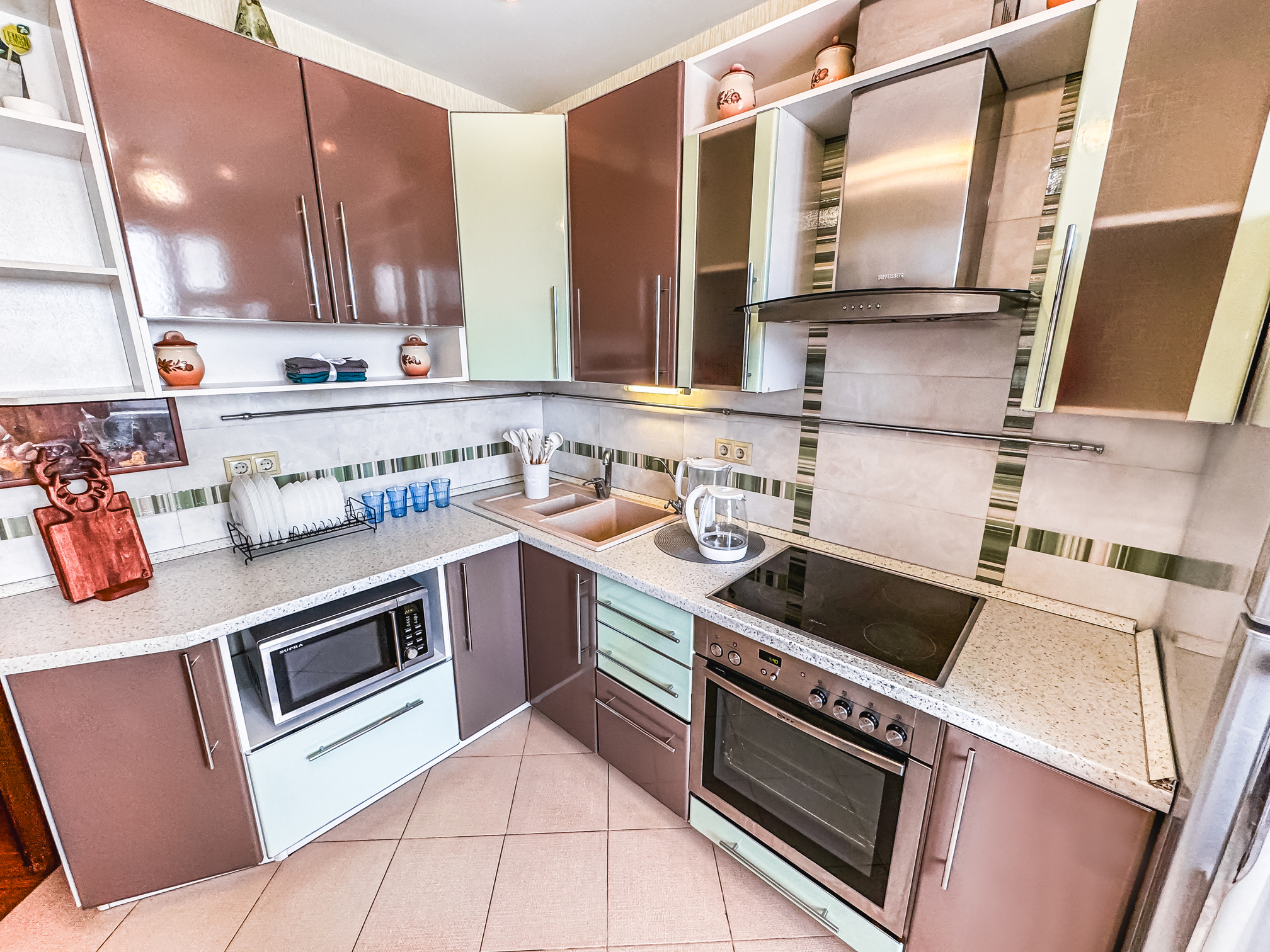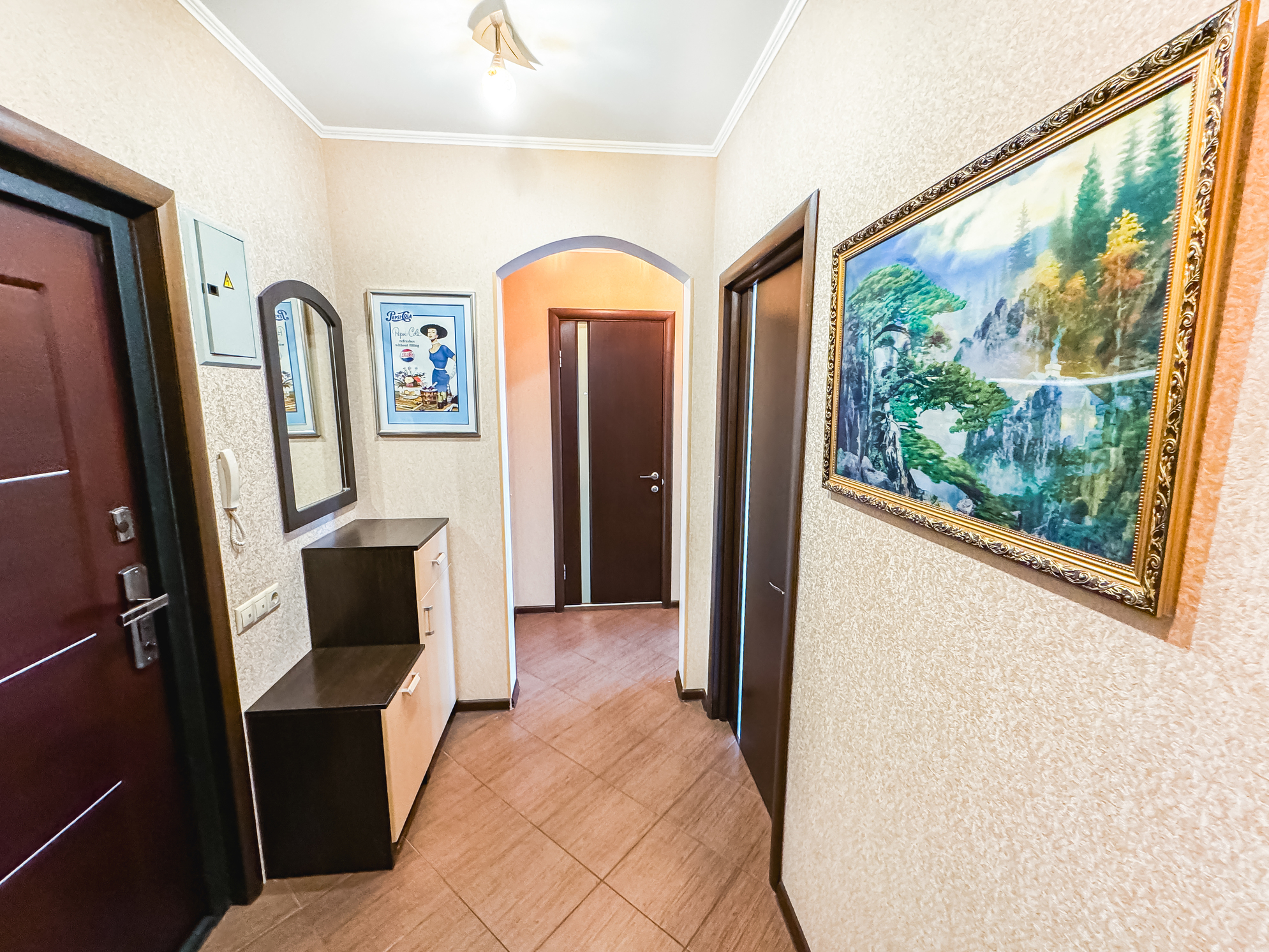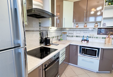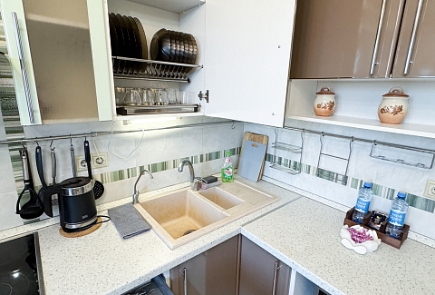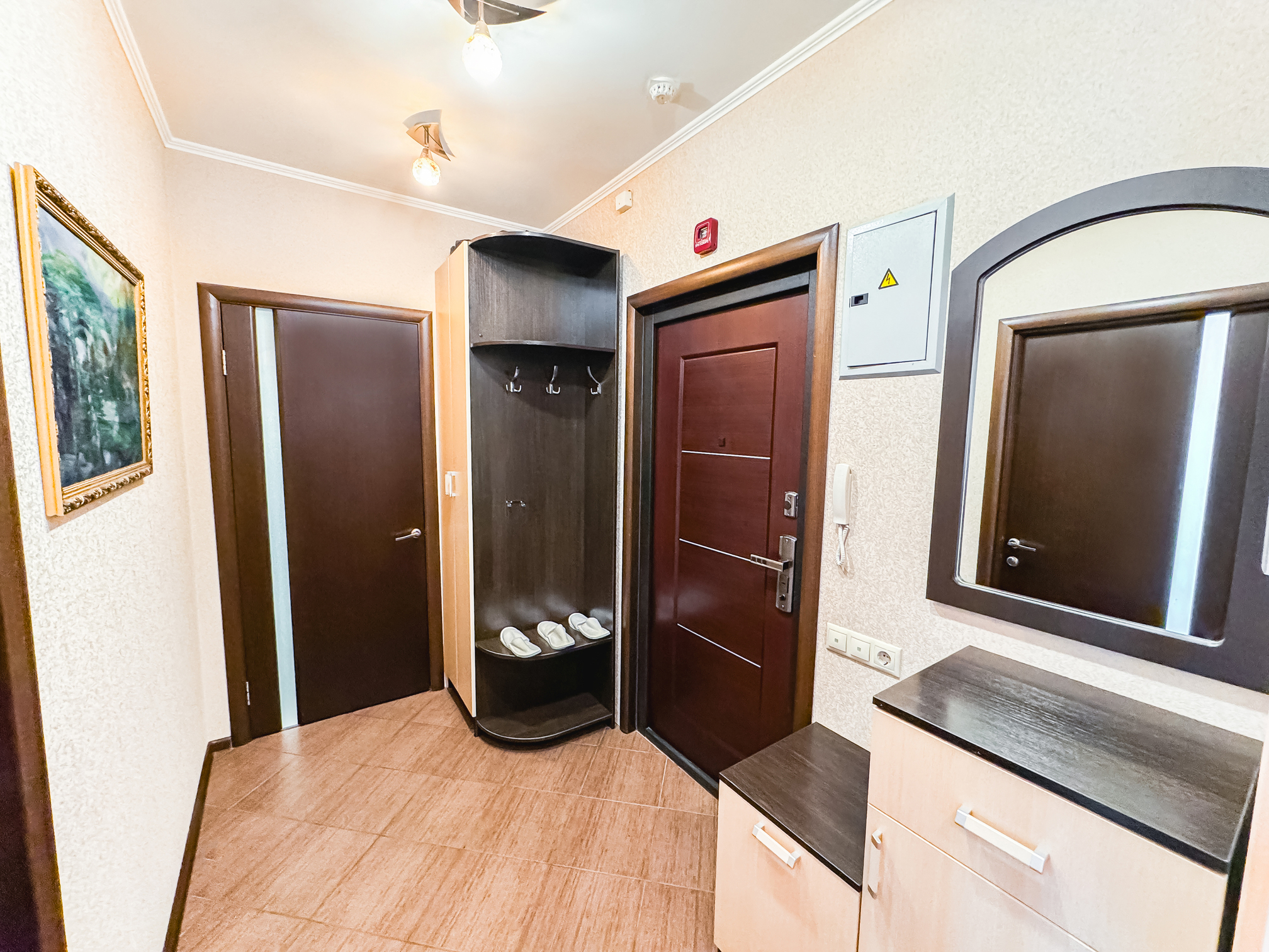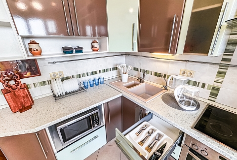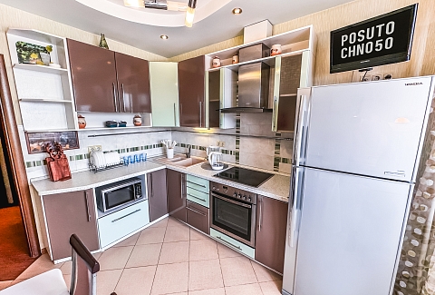 В номере: диван, зеркало, кровать двуспальная, прикроватные тумбочки, стол, стулья, шкаф, микроволновая печь, набор посуды, плита электрическая, стиральная машина, сушилка для белья, телевизор ЖК, утюг, холодильник, чайный набор посуды, электрочайник