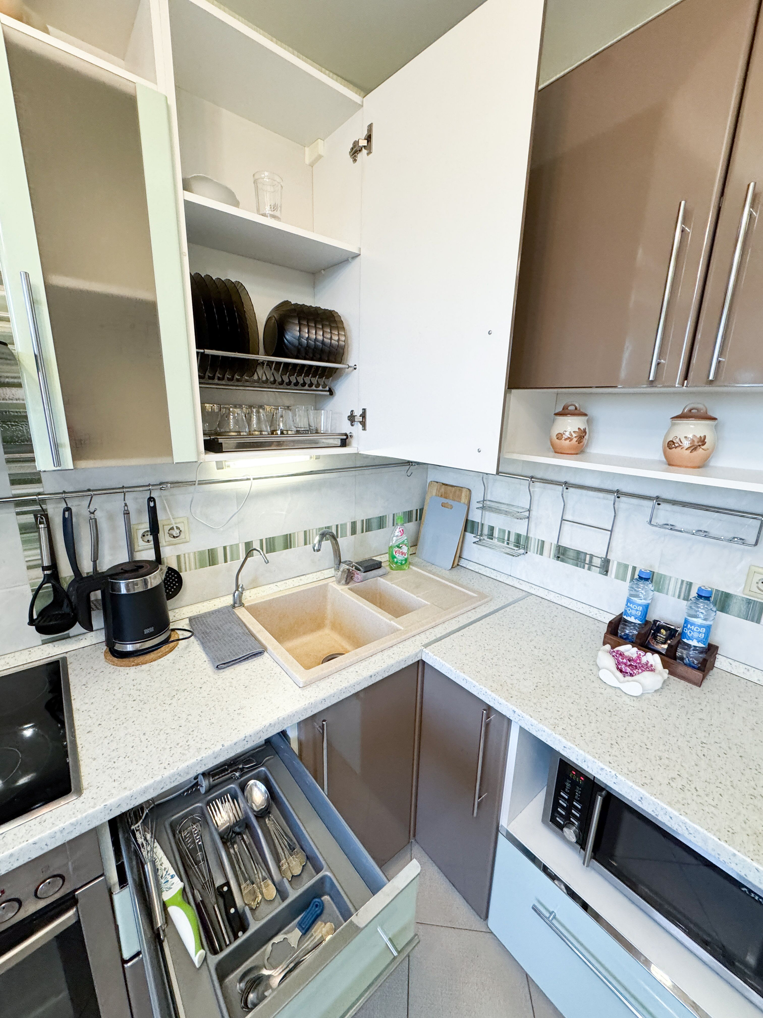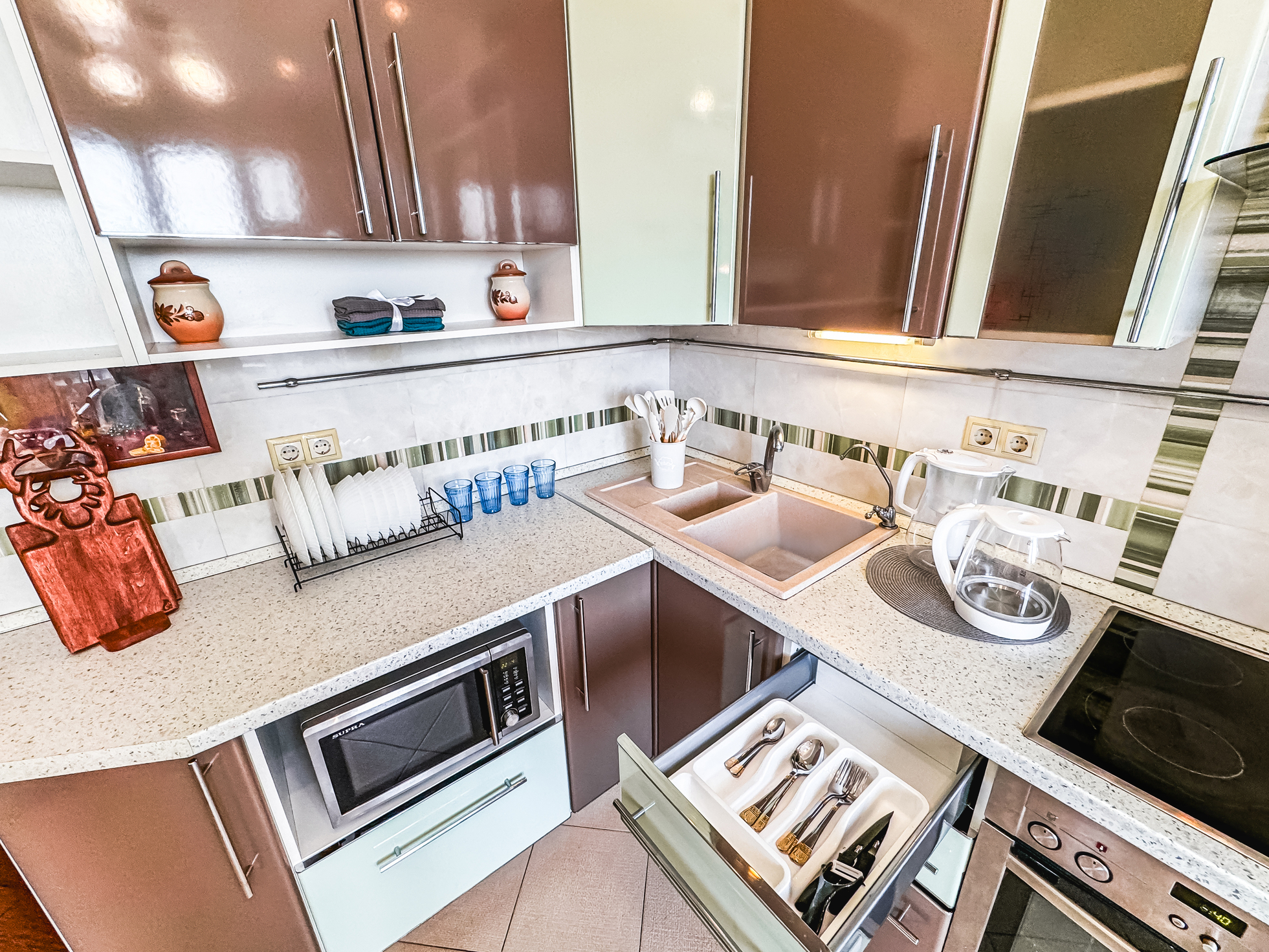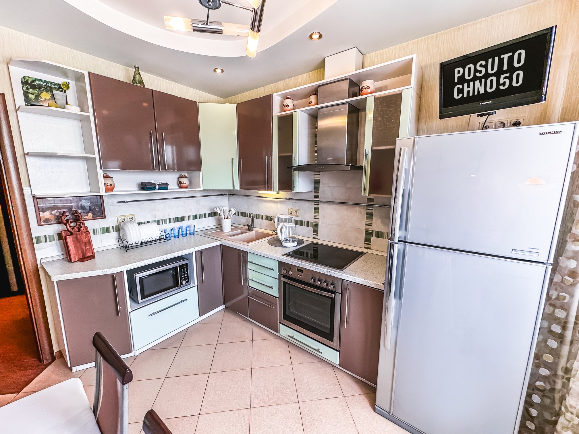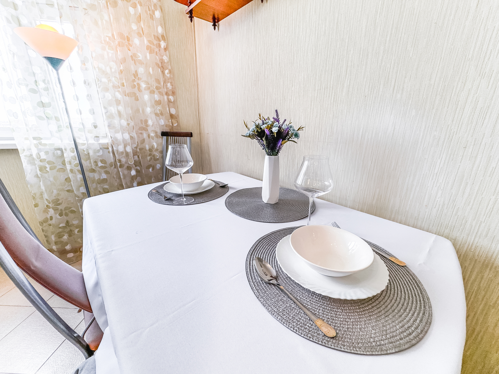 В номере: диван, зеркало, кровать двуспальная, прикроватные тумбочки, стол, стулья, шкаф, микроволновая печь, набор посуды, плита электрическая, стиральная машина, сушилка для белья, телевизор ЖК, утюг, холодильник, чайный набор посуды, электрочайник